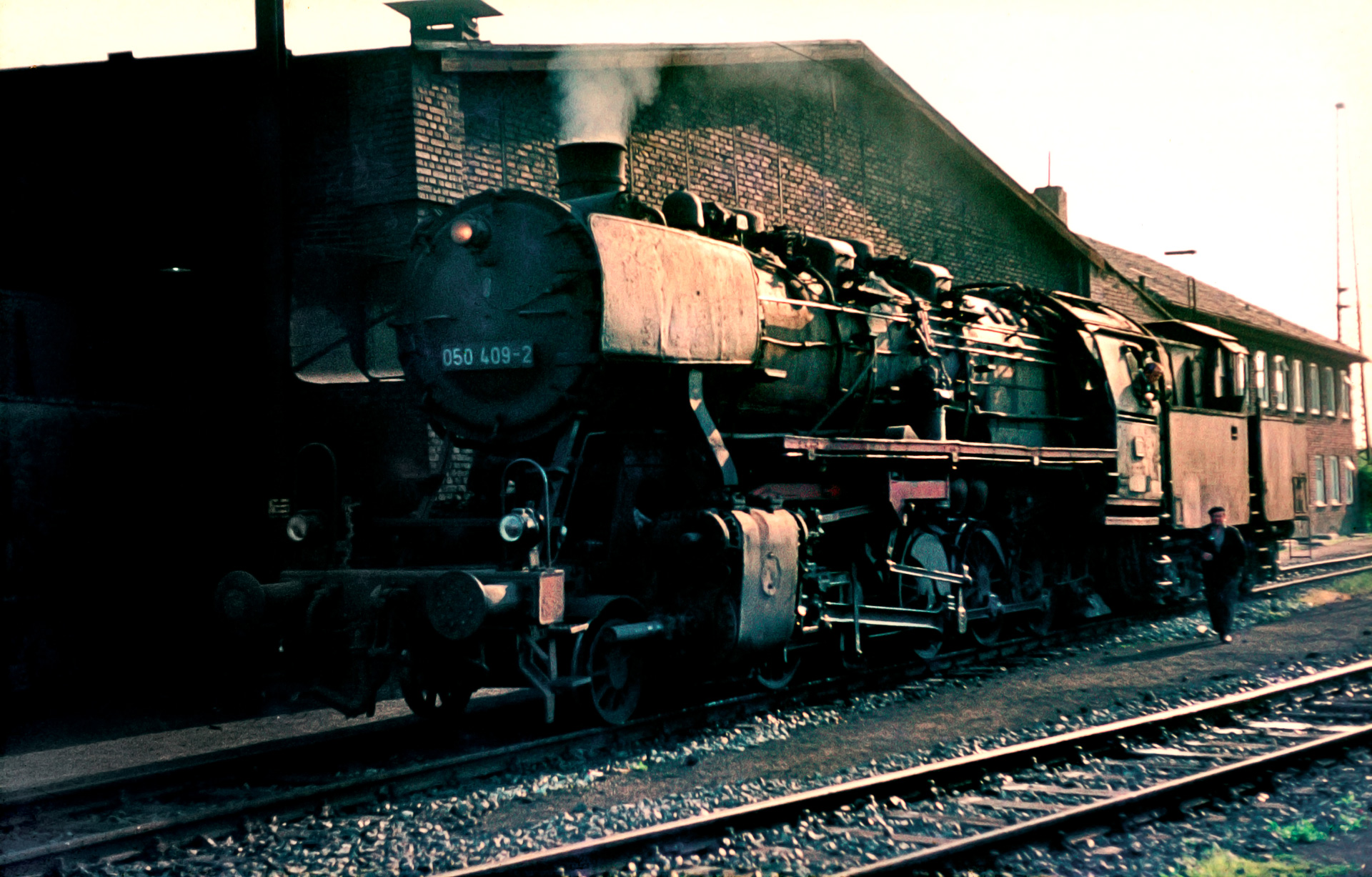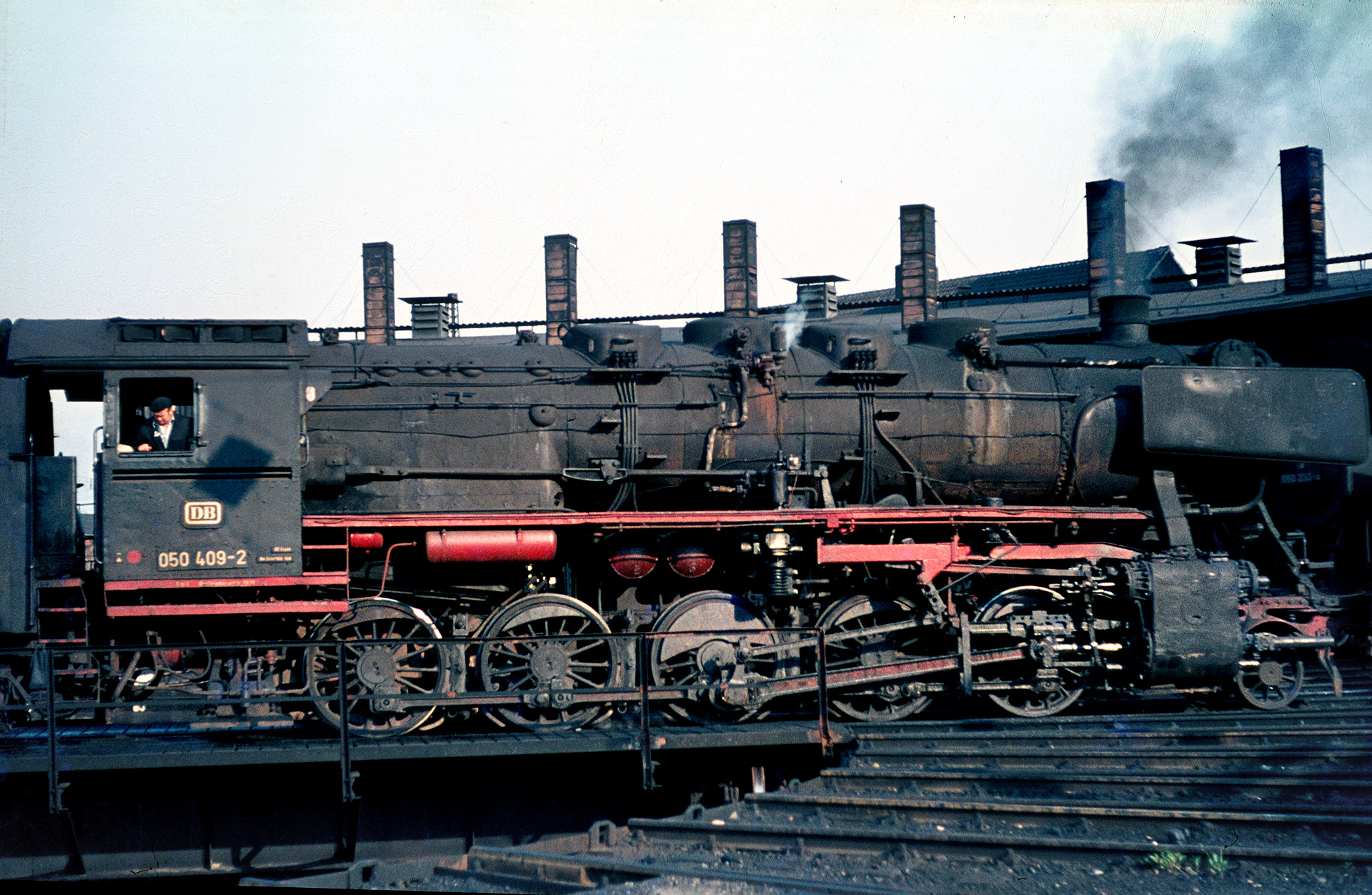 Bleiben wir noch ein wenig an der Drehscheibe. Im folgenden Bild schleicht sich 50 409 mit ihrer EDV-Nummer 050 409-2 Tender voran auf die Drehscheibe. Diese Lok wurde bereits ein Jahr später ausgemustert. Hier ist sie noch in Aktion. Ein noch häufiger anzutreffendes Problem wird in diesem Bild aber überdeutlich. Die Familie war jung, das Geld sprudelte für den jungen Familienvater noch nicht so und Fotoequipment war teuer. Anders als heute, wo jedes gewöhnliche Mobiltelefon Brennweitenbereiche von 20-100mm abdeckt, wurden zu dieser Zeit Festbrennweiten auf die Minolta geschraubt. Diese lagen aber mit 50mm nicht gerade in dem Bereich, mit dem man aus nächster Nähe die Länge einer 50er komplett auf den Film bekam. Deshalb sind viele Bilder leider unvollständig, denn mit der Festbrennweite bestimmt bekanntlich der Abstand zum Motiv wie viel man auf das Bild bekommt.