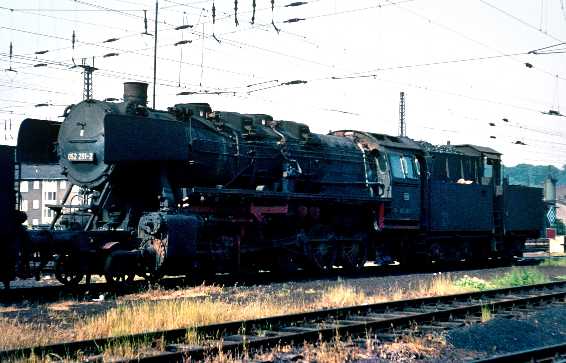 Links hinter der BR 50 sehen wir einige Dieselloks. Sie stehen vor der Lokhalle, für welche Drehscheibe 1 und der Ringlokschuppen 1 im Jahr 1964 weichen musste. Der Umbruch bei der Bahn war im vollen Gange, und der Austausch von Dampf auf Diesel und E-Loks machte auch vor Osterfeld nicht halt. Bereits zum Zeitpunkt der Aufnahmen 1973 beheimatete Osterfeld mehr Diesel und E-Loks als Dampfloks. Die folgende Aufnahme zeigt 50 2291 unter ihrer EDV-Nummer 052 291-2. Sie steht bereits auf dem Abstellgleis. Nur zwei Monate nach dieser Aufnahme traf es auch sie und sie war ausgemustert. Ihre Lebenszeit begann 1942 bei Henschel. Das selbe Schicksal hatte übrigens auch 50 409, die wir weiter oben noch unter Dampf auf der Drehscheibe gesehen haben. Auch für sie fiel im August 1973 der Hammer.