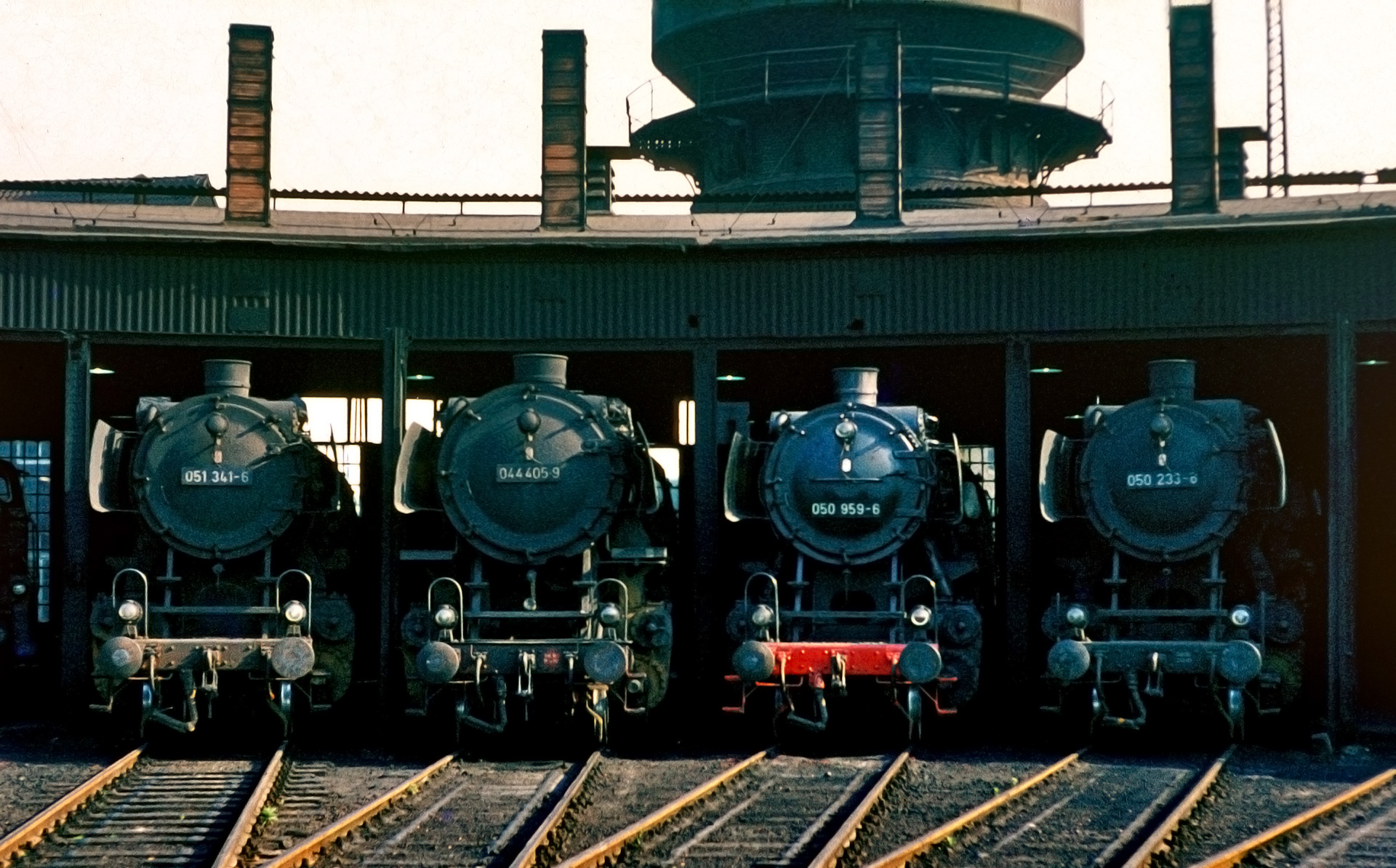 Vollständig und gleich mehrfach ist 50 1235 auf dem Film gelandet. Sie rückt in einer Serie aus dem Lokschuppen aus. Und auch hier sorgt über 40 Jahre später fordert die Alterung des DIAs für eine gehörige Portion Bildverarbeitung, um auch in den Schatten noch ausreichend Zeichnung zu erhalten. Die Aufnahmen bleiben allerdings hinsichtlich ihrer Qualität ausbaufähig und haben nur dokumentarischen Charakter. Abgesehen davon wären klinisch reine historische Aufnahmen eines solchen Orts auch irgendwie seltsam. Die Lok hat selbstverständlich ihre EDV-Nummer 051 235-0.