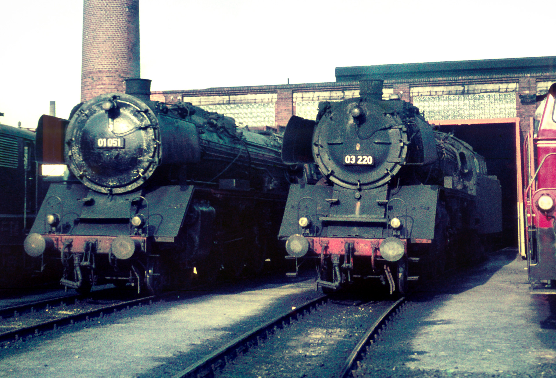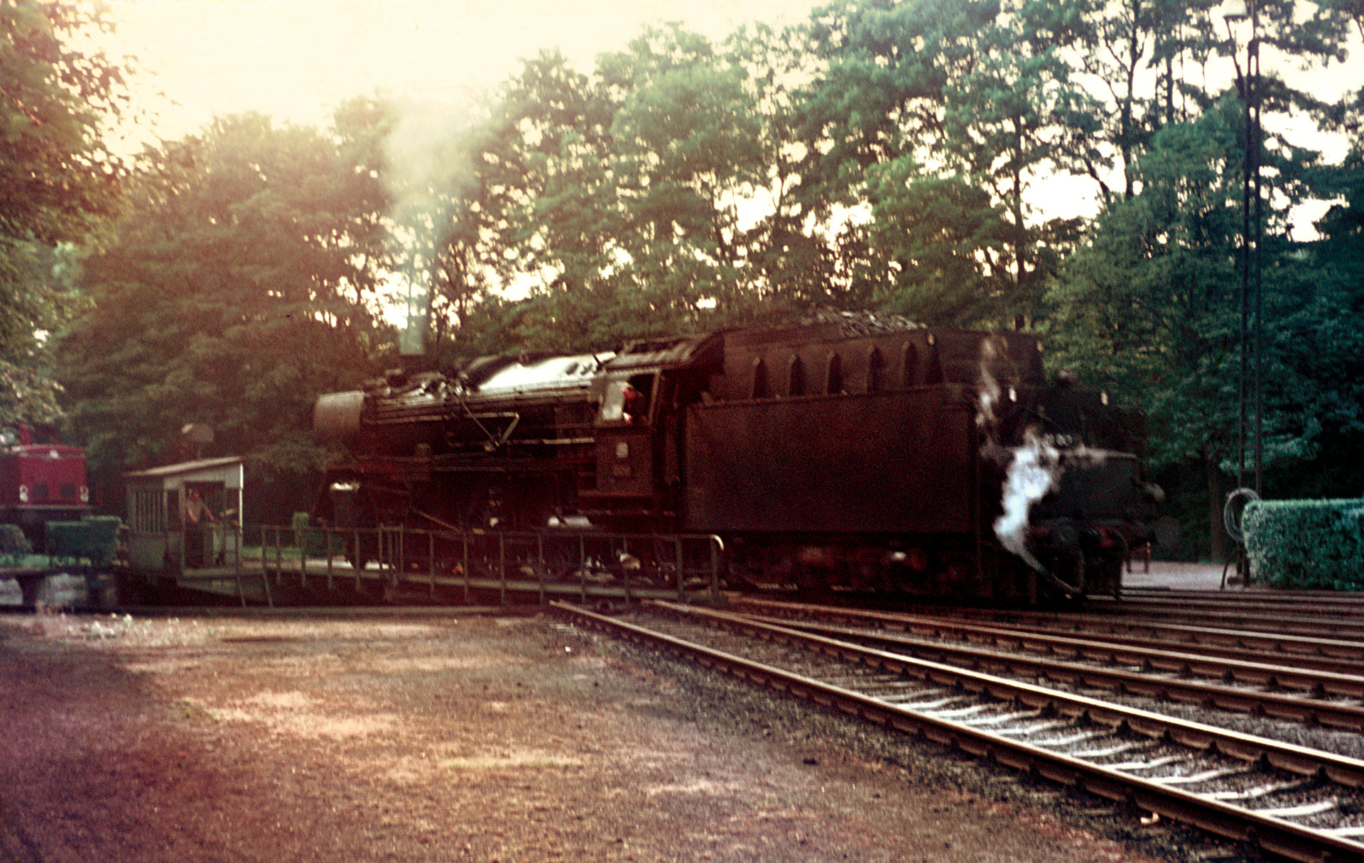 Im Hintergrund der Aufnahme lugt wieder 01 073 hervor. Erinnern wir uns: Sie war die erste im Artikel, die sich auf den Weg Richtung Drehscheibe / Weichenstraße machte. Und nun? Schauen wir Richtung Drehscheibe. Der Kamera verlangt das Gegenlicht und der Schatten alles ab, und genau genommen dauerte es weitere 50 Jahre, bis die moderne Bildbearbeitung ein Ergebnis hervorbringen konnte, welches ausreichend Details zeigt. Derweil hat allerdings die Lagerung am Original genagt.