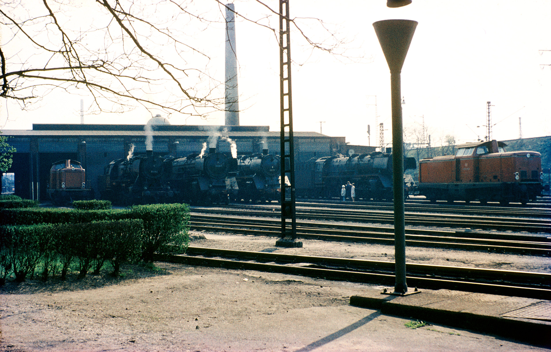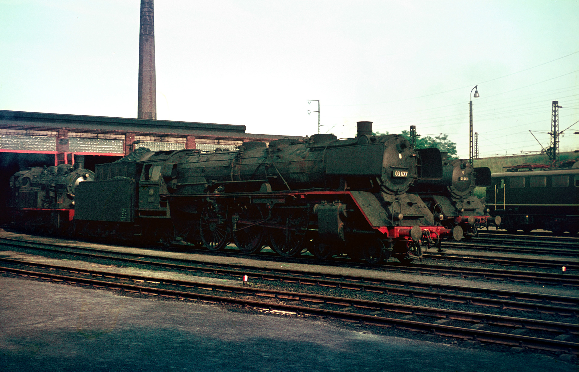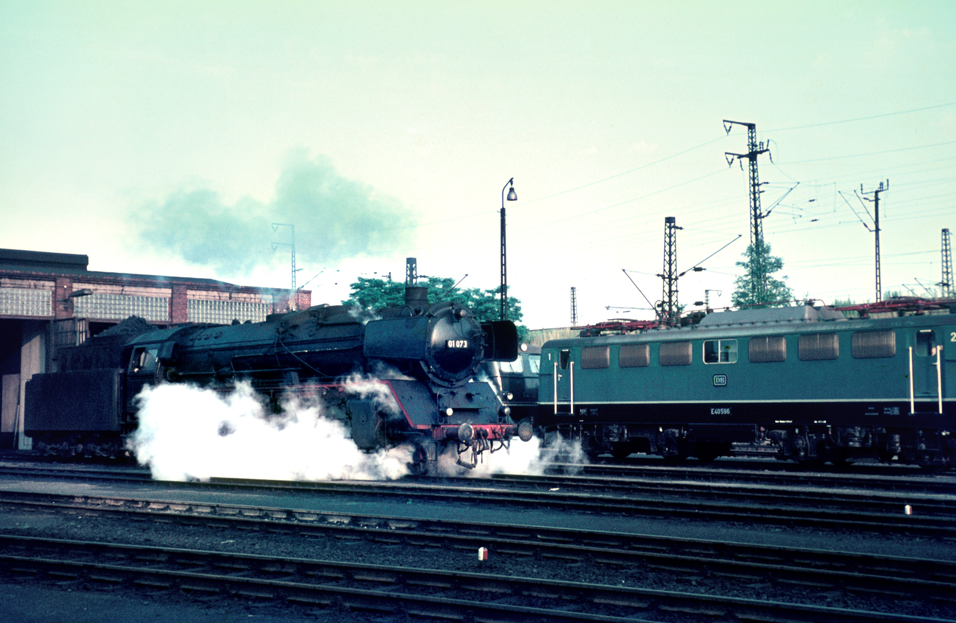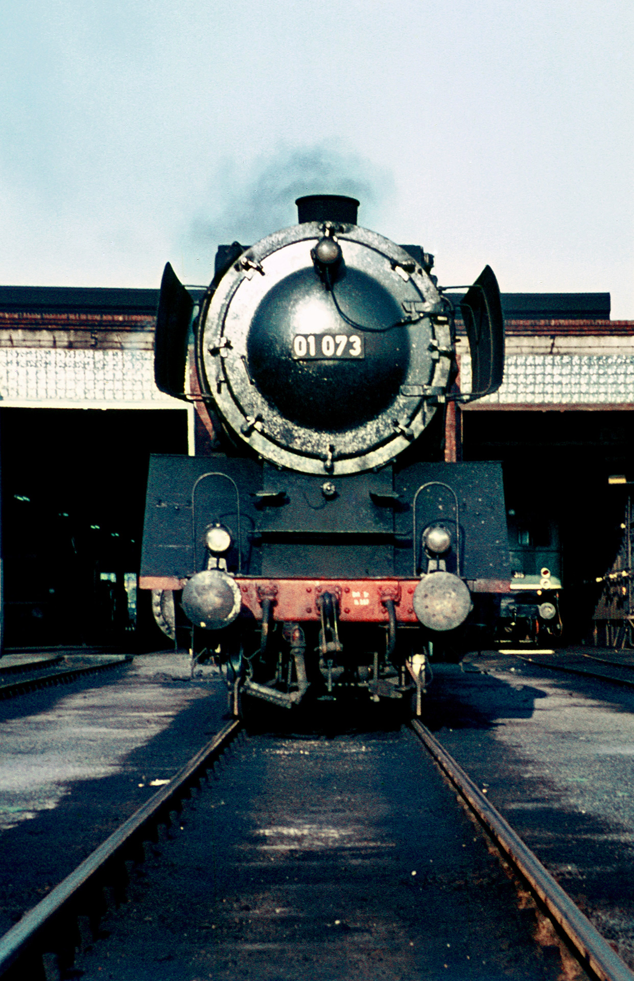 Zum einen haben wir rechts eine schöne Hochkantaufnahme von 01 073, wie sie ruhig qualmend in Deutzerfeld vor der Lokhalle wohl auf ihren nächsten Einsatz wartet. Das Original war nicht so ganz im Schnitt, aber dank digitaler Bildbearbeitung kann man so nun das Möglichste aus der Aufnahme rausholen.