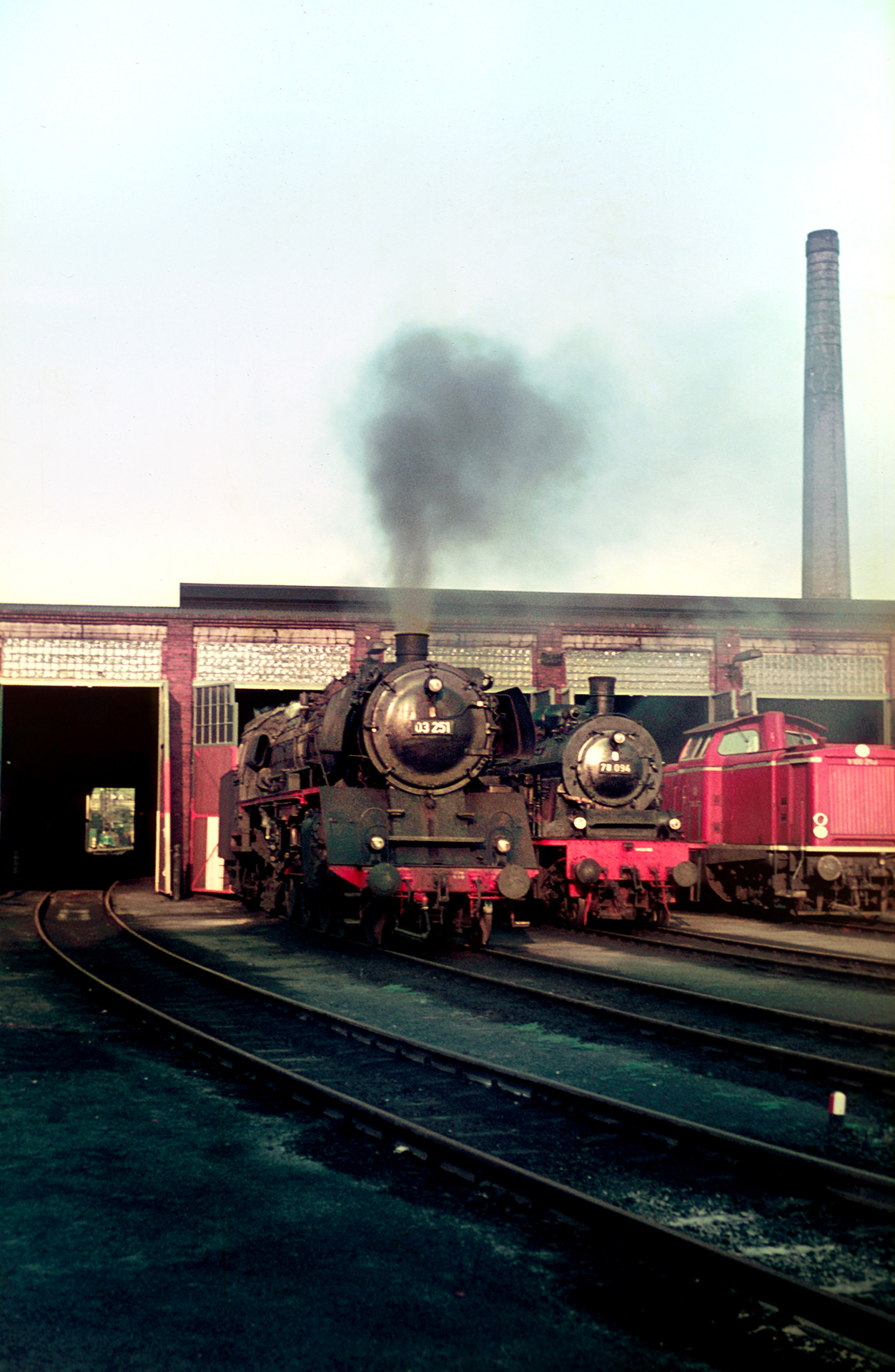 Nicht weniger interessant ist diese Hochkantaufnahme aus dem BW. Sie zeigt noch einmal 03 251, diesmal unter deutlicher Rauchentwicklung. Neben ihr steht, wo sie im Bild zuvor auf dem selben Gleis davor stand: 78 094.