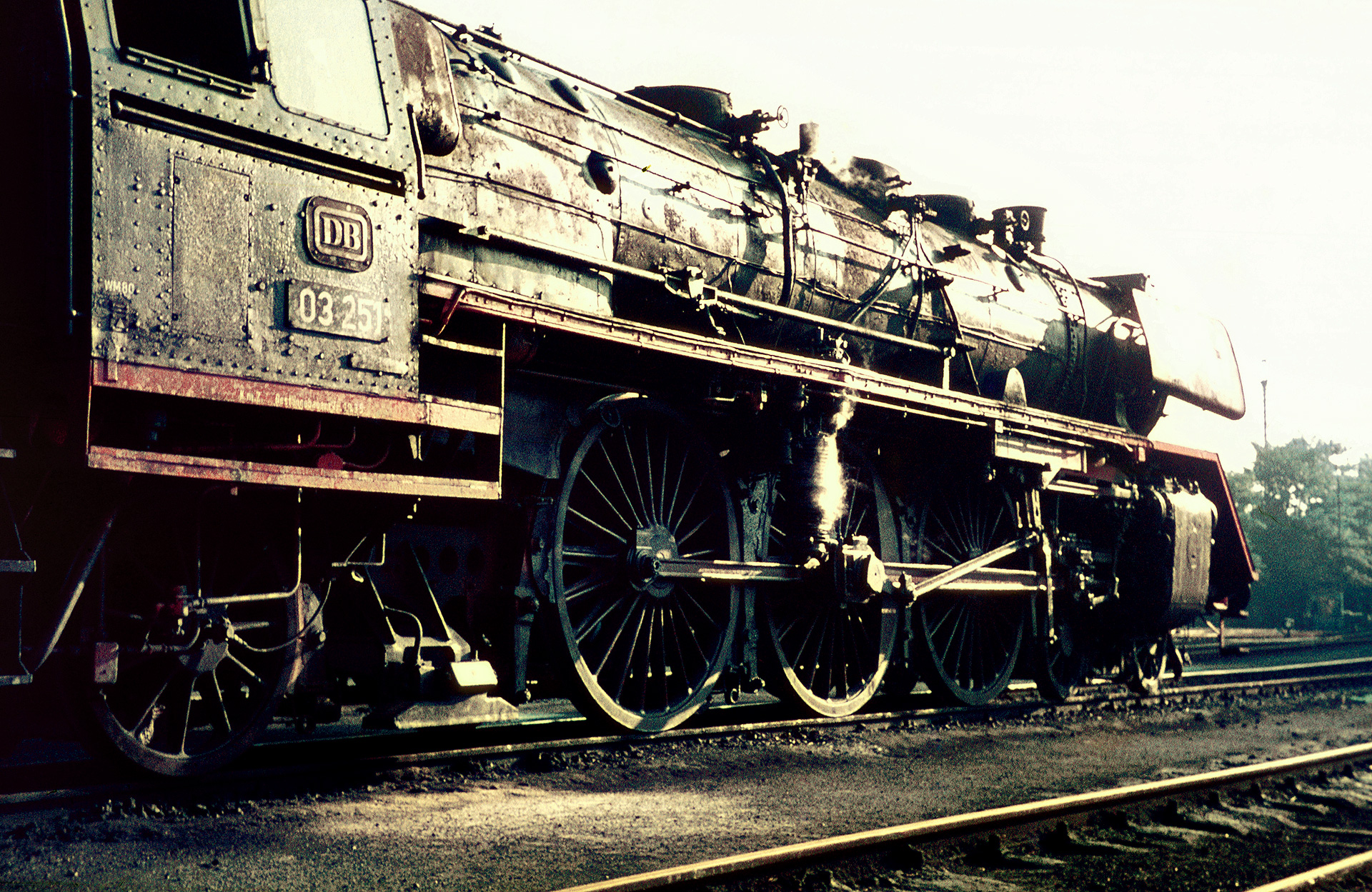 Bei einer weiteren Aufnahme sehen wir unten zunächst 03 251. „Welchen Tender mag sie hinten dran haben“ mag der Fachmann sich fragen? Der Grund ist, dass es mit 03 251 am 22. Oktober 1966 zu einem Zwischenfall mit besagter Lok kam, die gerade den Eilzug 298 von Mönchengladbach nach Köln bespannte. Dass es nicht zu einem Unfall kam, ist dem beherzten Eingreifen des Lokpersonals und der Person auf dem Stellwerk zu verdanken. Durch den Ausfall des Bläsers waren beim öffnen der Rauchkammertüre Flammen in den Führerstand geschlagen, die sich bis über den Tender hinaus ausgebreitet haben sollen. Der Zug konnte gestoppt werden, nachdem der Lokführer während der Fahrt vorne den Luftbremshahn zwischen den Puffern löste. Die ganze Geschichte findet man bei Drehscheibe Online.