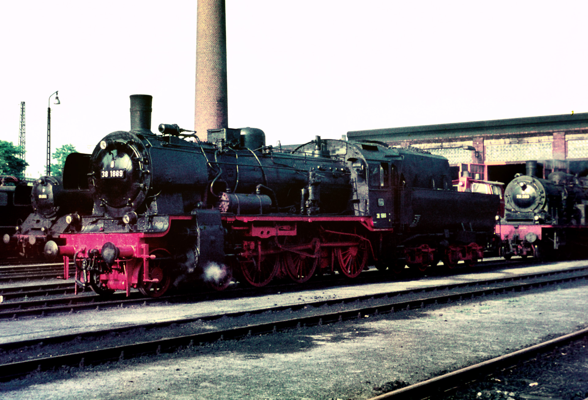 Im Bild ist der schöne Wannentender der 38 1889 zumindest zu erahnen. Leider sind die DIA Originale sehr im blau versunken, außerdem ist das frische rot ein derart greller Kontrast, dass es bei der Digitalisierung und der Bildverarbeitung zu echten Problemen führt. Das sieht man vor allem bei dem folgendem Bild, bei der wir uns noch mal die andere Seite der Lok anschauen: