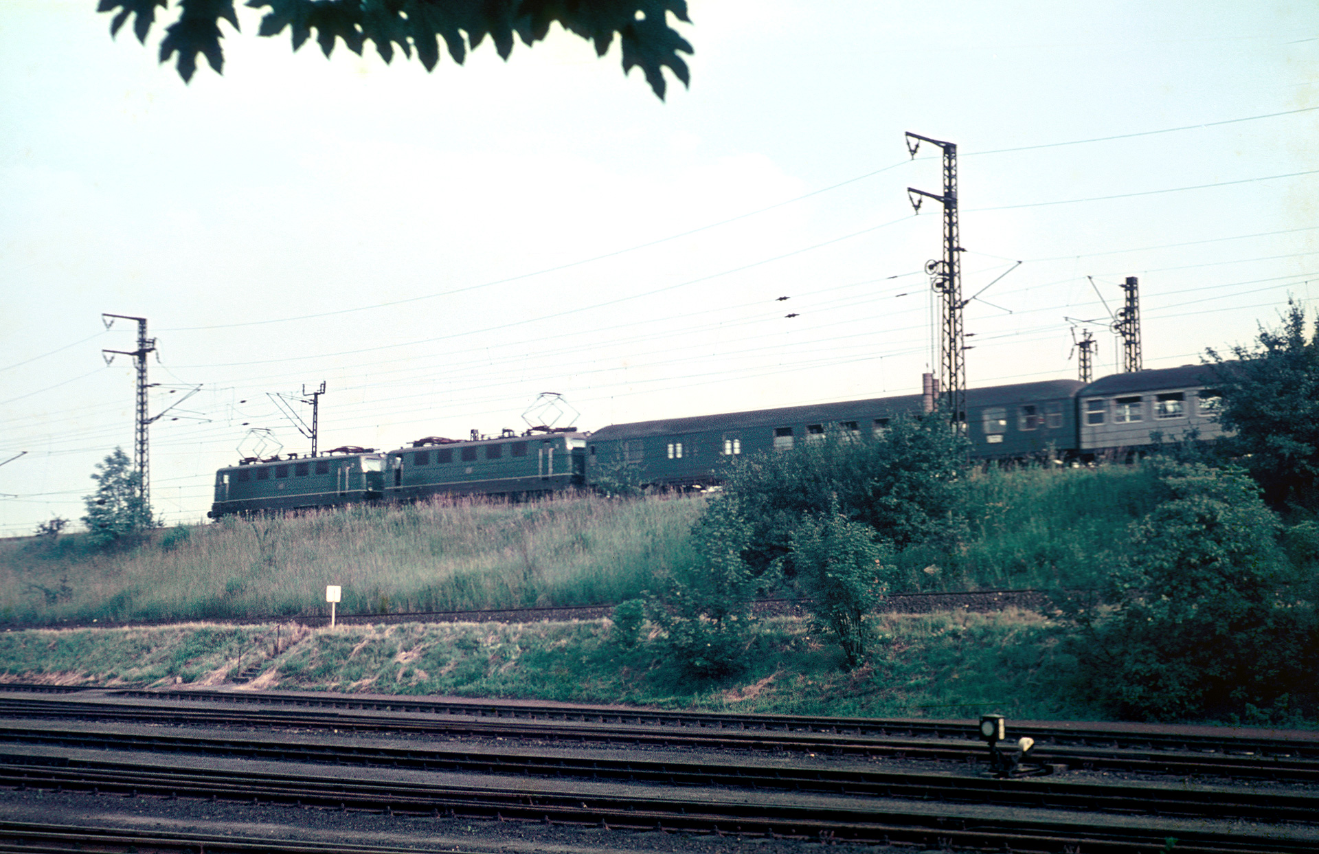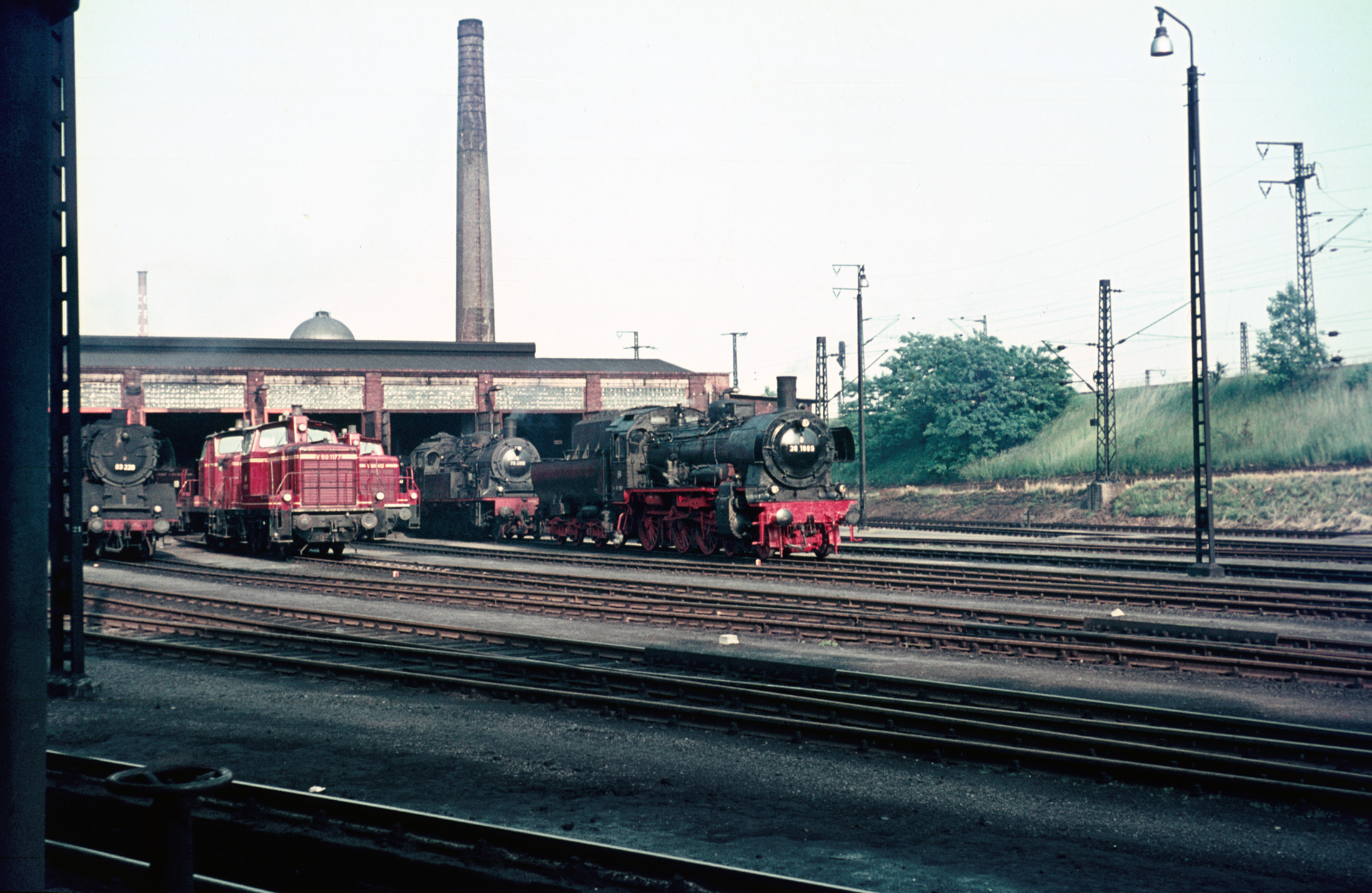 Fast komplett zumindest, denn eine 78 qualmt auf anderem Gleis auch hier gemütlich vor sich hin, allerdings handelt es sich um 78 209. Die V100 in der Mitte ist einigen V60 gewichen von denen V 60 1177 sowie V 60 412 identifizierbar sind, und ganz links steht 03 220. Die Chance auf Schnellzuglokomotiven zu stoßen war in Deutzerfeld hoch, und auch auf diesem Bild wird man trotz vielen kleineren Maschinen nicht enttäuscht. Von der E40 ist aber keine Spur mehr zu sehen. Es ist für mich derzeit nicht zu klären, ob diese Dias vor oder nach den anderen entstanden sind. Deutlich hervor sticht, und einen Ansatz bietet 38 1889, denn sie trägt ein auffällig frisches Kleid. Allerdings sind die DIAs ebenfalls mit So 1966 gekennzeichnet. Ihre Sonderfahrt, für die sie sich so schick gemacht haben soll, fand aber erst im Folgejahr, am 17.06.1967 statt – wie Ulrich Budde in einer schönen Fotoserie auf bundesbahnzeit.de zum Besten geben weiß. Gut möglich dass diese Aufnahmen auch erst 1967 entstanden. The answer my friend, is blowing in the wind…