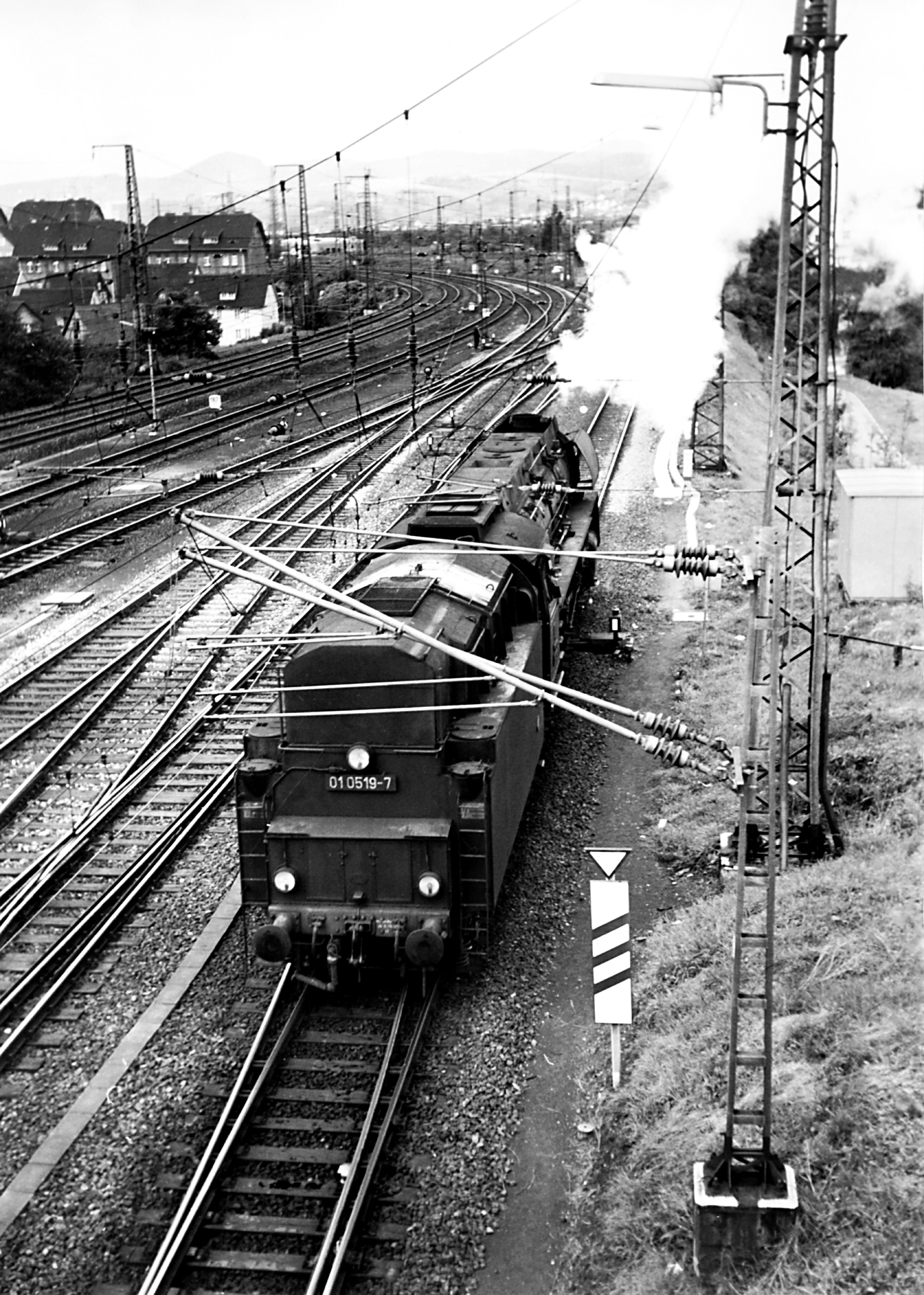 Die bis dato letzte Aufnahme zeigt erneut 01 0519-7 Lz vor dem Bahnhof Bebra, der sich in Aufnahmeposition im Rücken meines Vaters befindet. 01 519 rangiert, nachdem sie D1097 nach Bebra brachte, gerade Tender voraus in Richtung Bw. Die Aufnahme entstand auf der Brücke der Bahnhofsstraße, die in die Giffershäuser Str. übergeht.