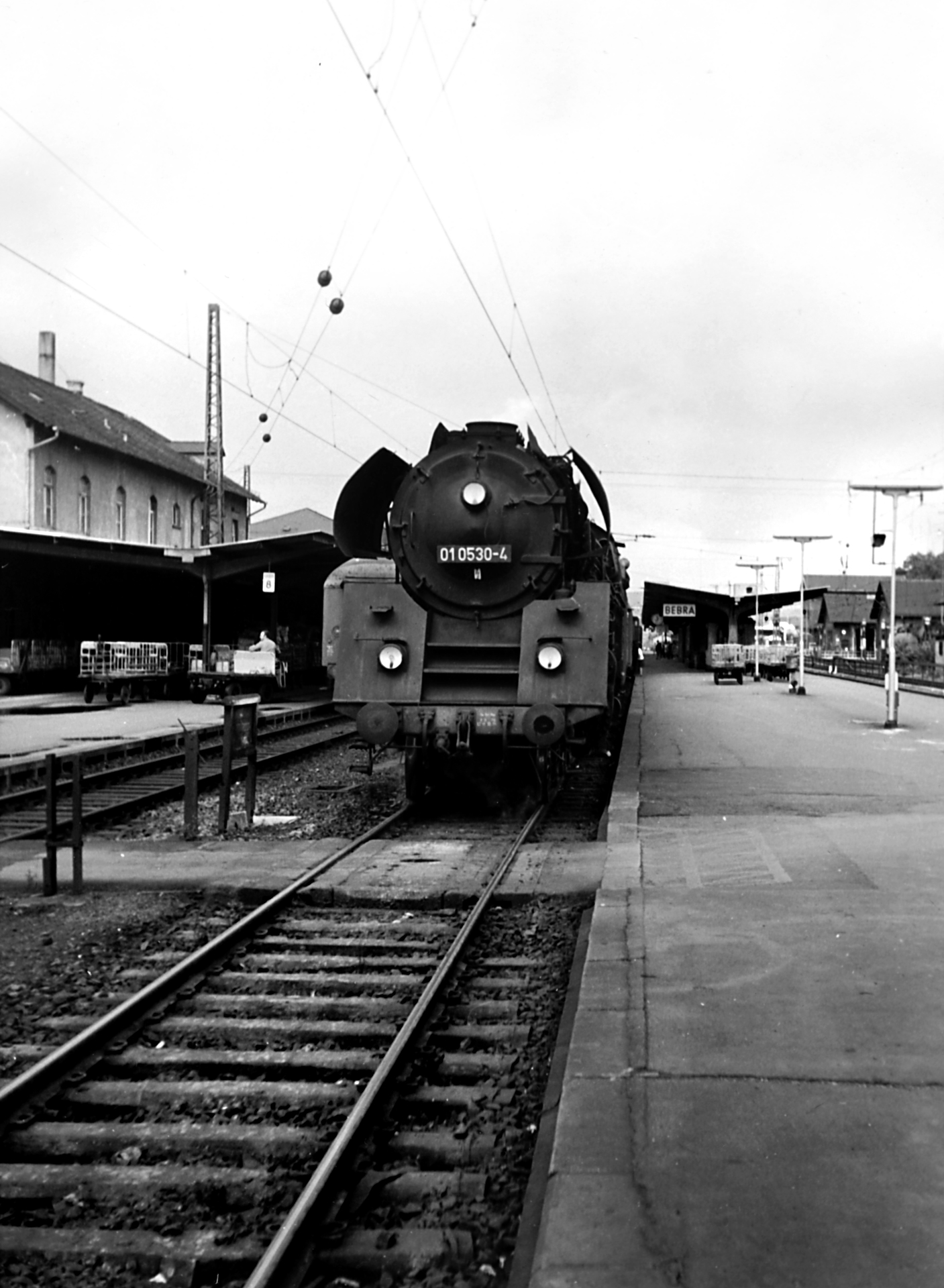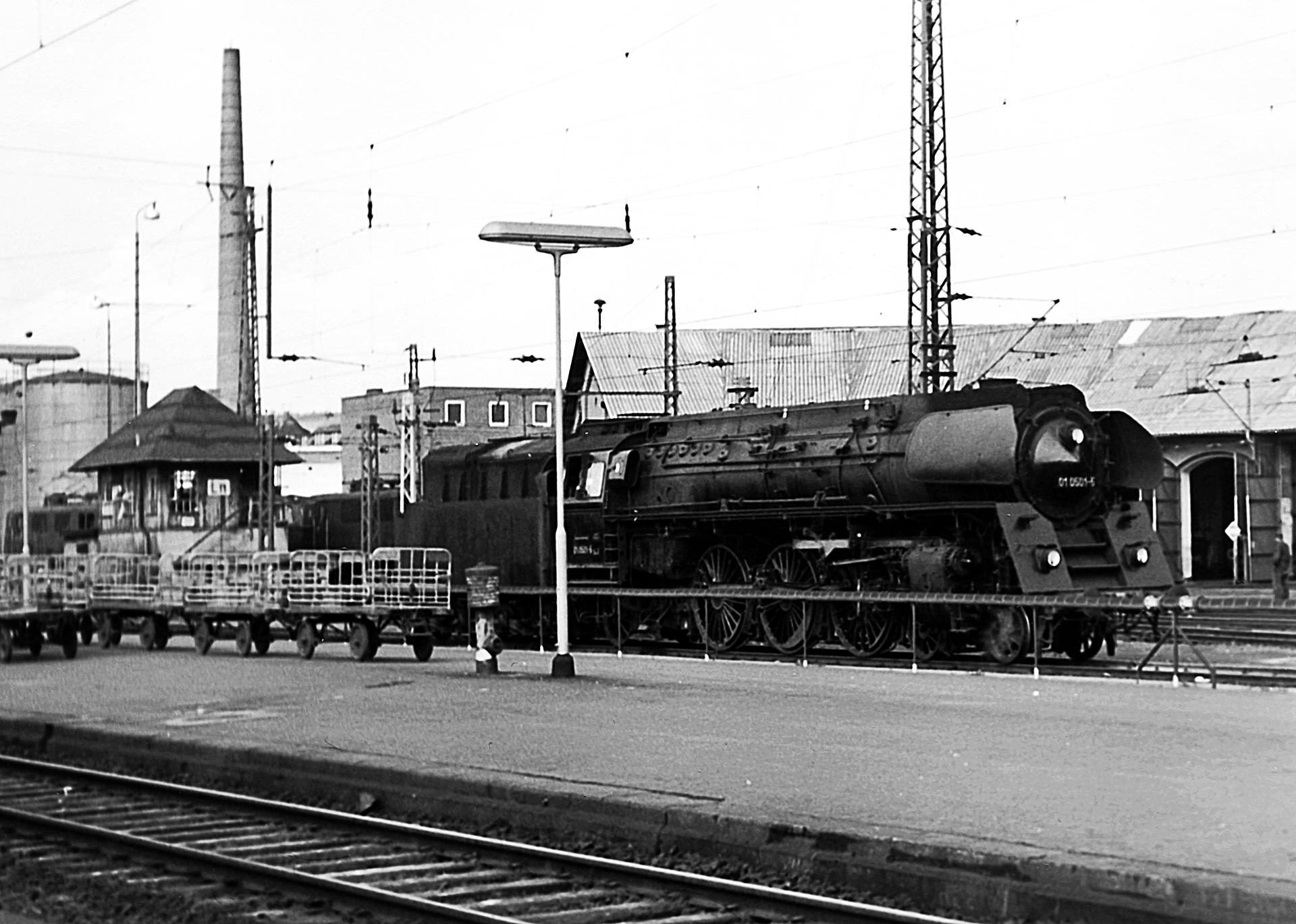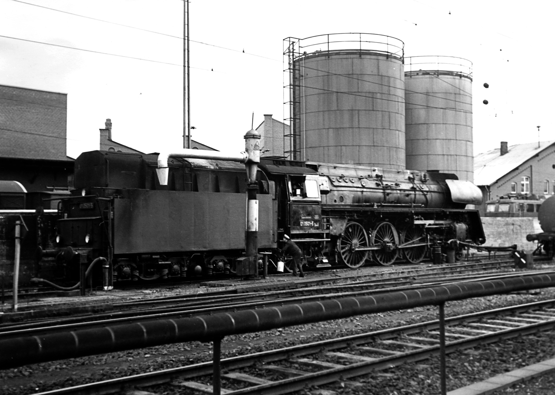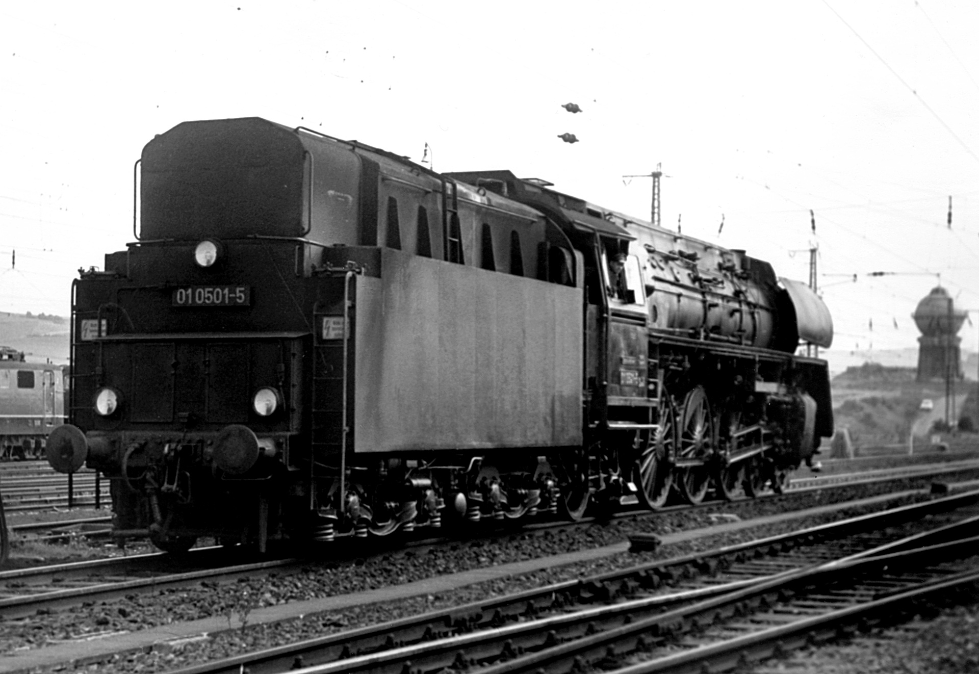 Bleiben wir noch ein wenig in s/w, denn beim Rangieren wurde 01 0501-5 ebenfalls abgelichtet. Außerdem liefert diese Aufnahme einen Blick auf den Wassertum in Bebra, wo sich heute ein Eisenbahnmuseum befindet.