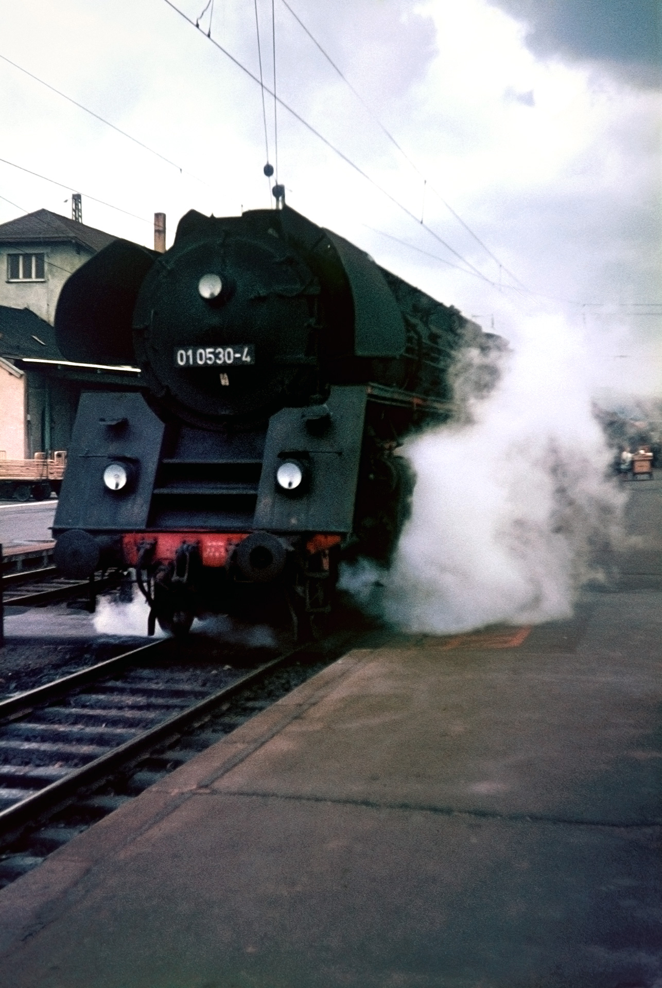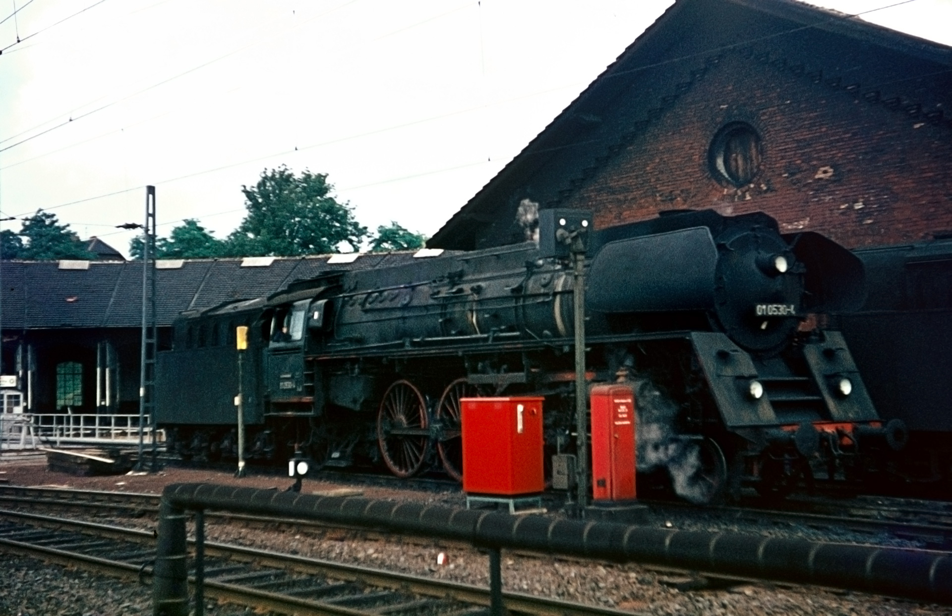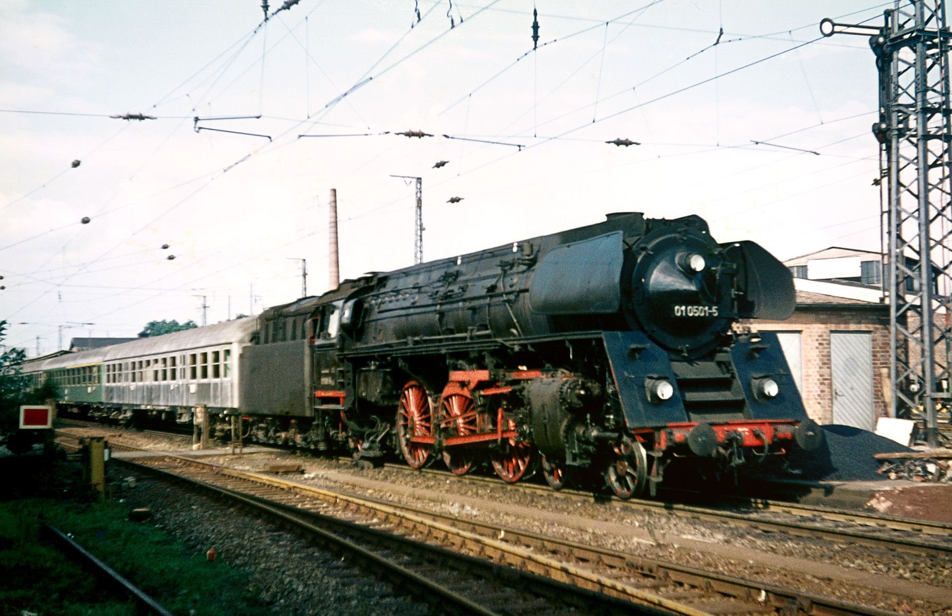 Ein gerade noch passables Dia vom selben Standort, wie 01 0501-5 aus dem BW ausrückt, gibt es ebenfalls: