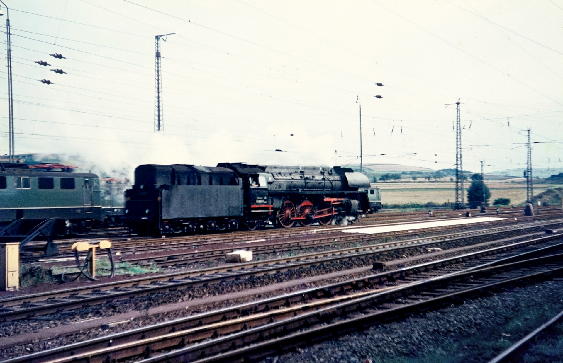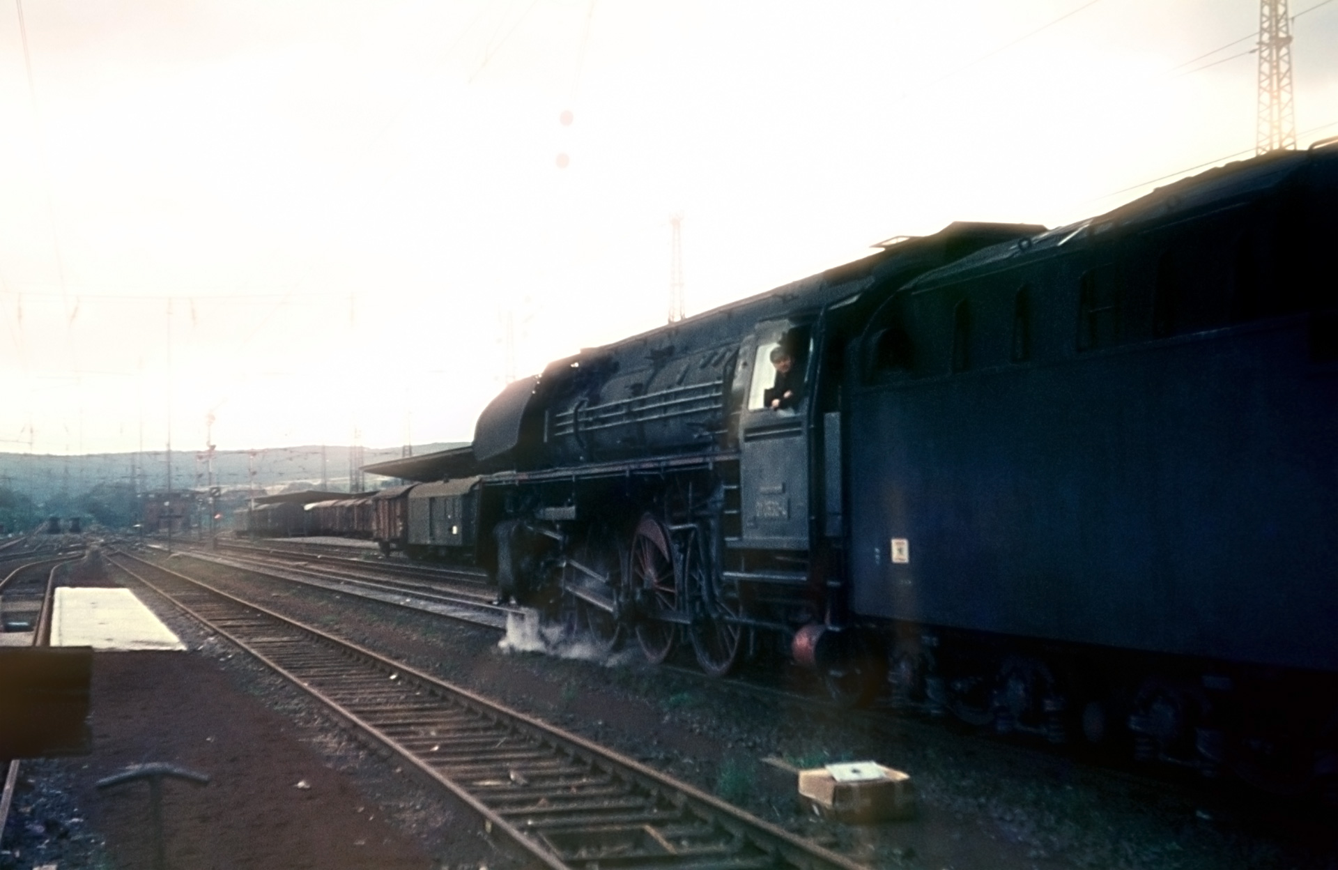 Eine dieser Zonen war Bebra. Was heute ziemlich zentral in Deutschland liegt, war bis zur Wiedervereinigung nahe der innerdeutschen Grenze. Wie es sich für einen Grenzbahnhof gehört, wurde fleißig umgespannt. Mein Vater war 1972 gleich zweimal in die Region gereist. Einmal am 11. September 1972 direkt nach Bebra und im gleichen Jahr noch einmal am 21.12. für zahlreiche Streckenfotos – allen voran nächst Hönebach und Ronshausen. Der gesamte Stapel umfasst gut 100 Dias, wovon viele glücklicherweise als Papierabzug beschriftet im „Papierarchiv“ Details liefern, die diesen Artikel erst möglich machen. Er behandelt die Bilderserie aus dem September direkt in Bebra – dem Tag des Terroranschlags bei den Olympischen Spielen in München. Die Frage „Wo warst Du, als…“ kann ich stellvertretend für meinen Vater also mit Bebra beantworten. Dass das Wetter alles andere als günstig für Fotografen war, beantworten die Dias, die ohnehin schon bessere Tage gesehen haben. Die anderen Serien werden selbstverständlich auch noch veröffentlicht.