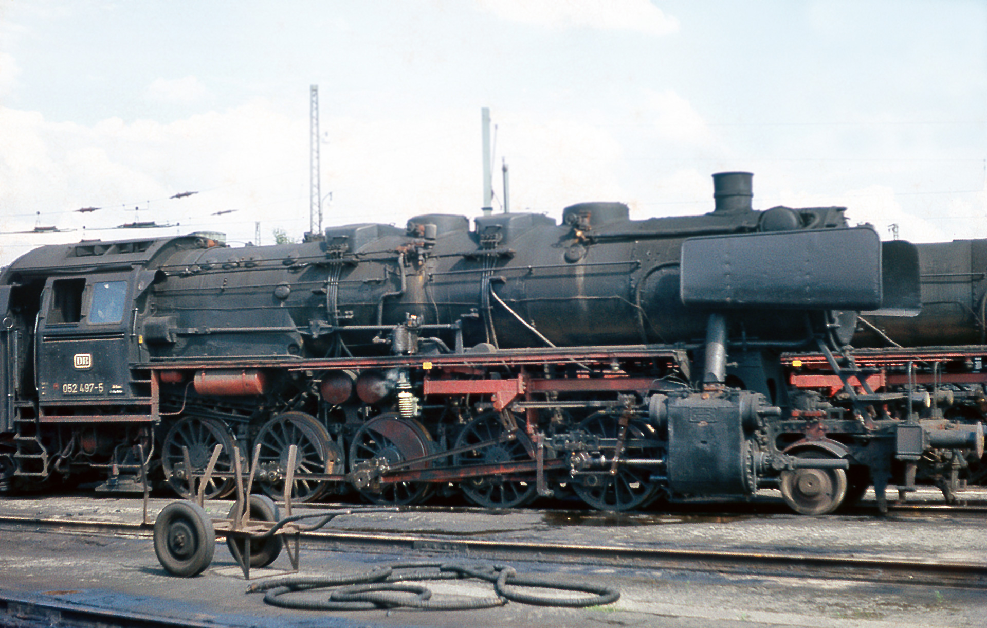 Die letzte Aufnahme aus dem Bw Duisburg Wedau zegit 052 497-5. Im Hintergrund sehen wir die Oberleitung der Hauptstrecke.