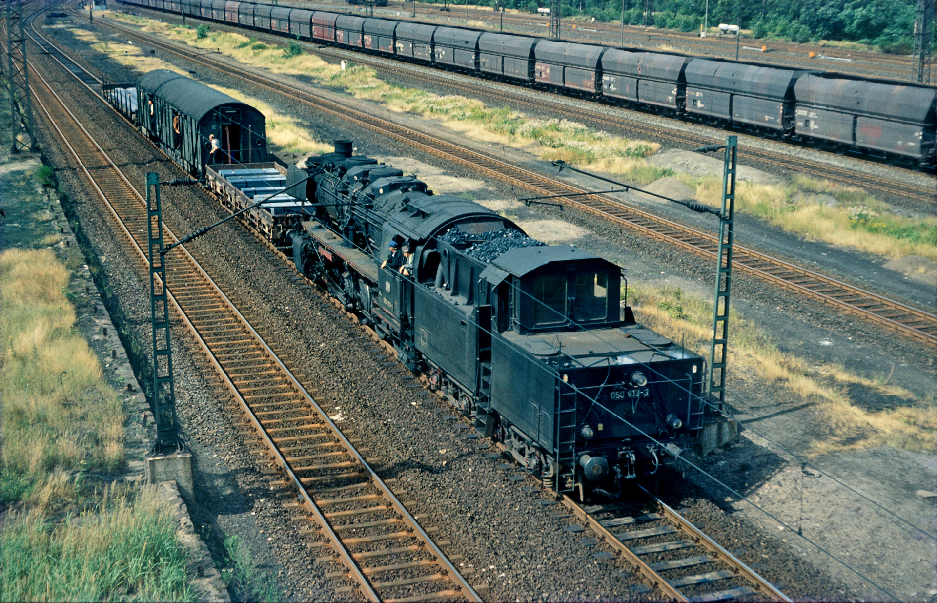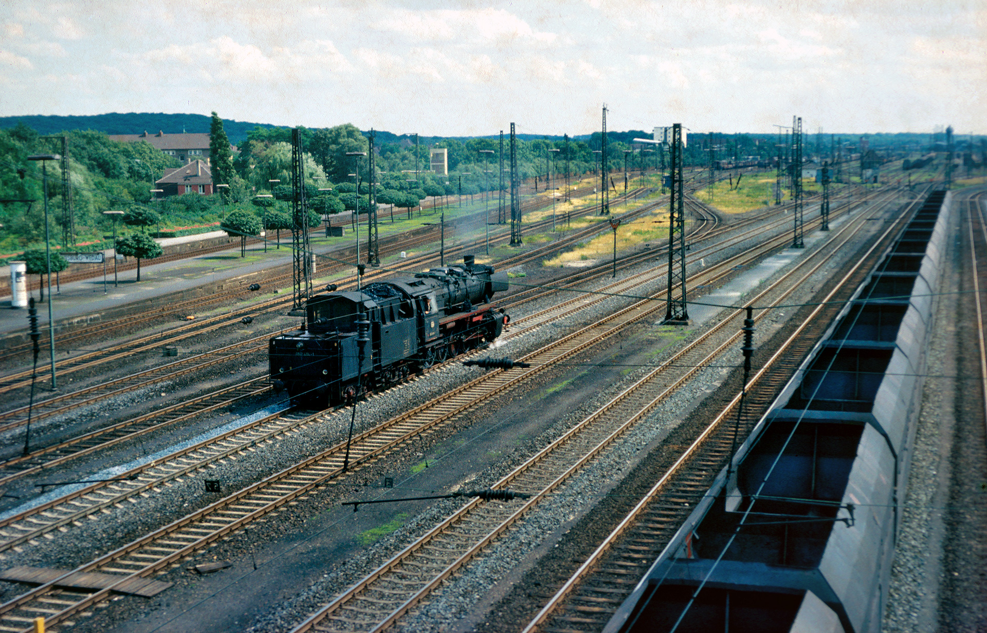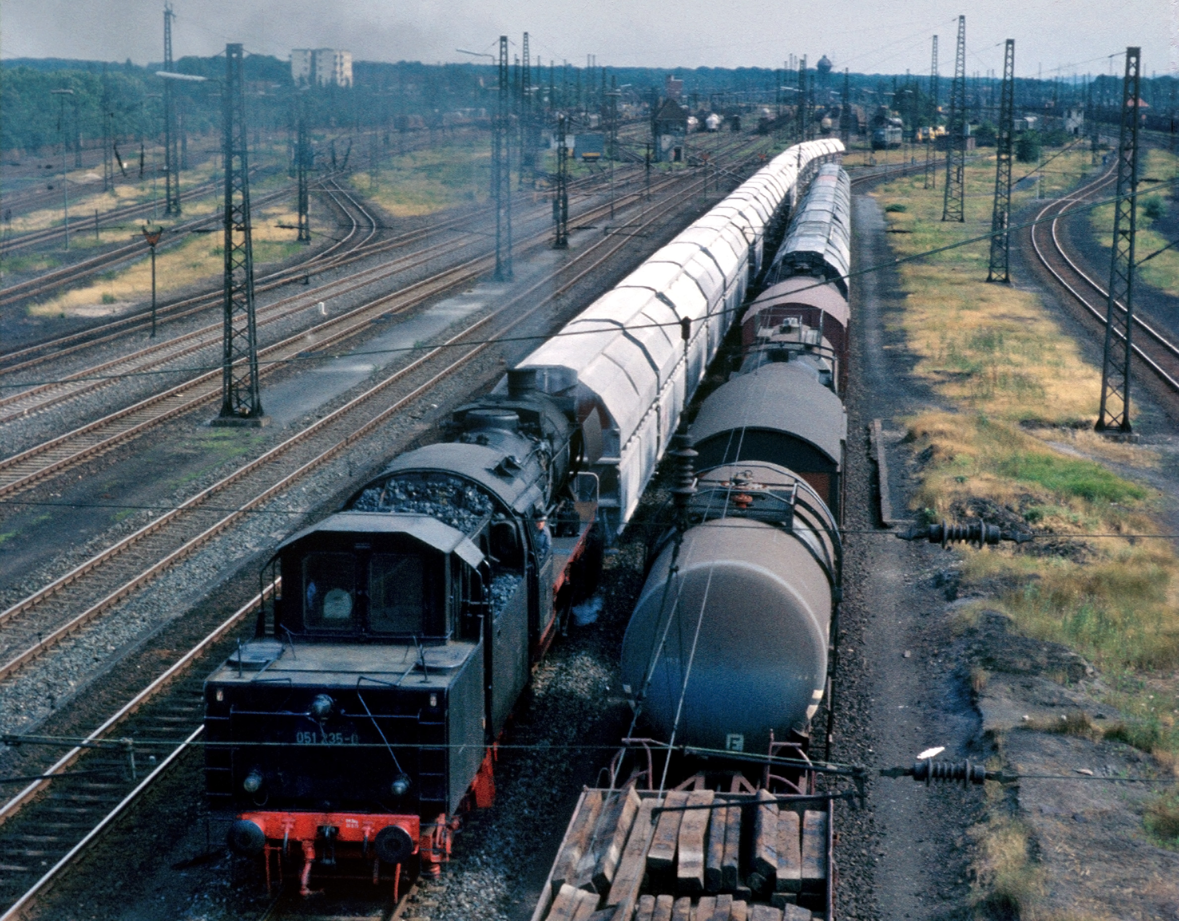 Sich ebenfalls blicken lässt sich 051 235-0. Sie gehörte zum Zeitpunkt der Aufnahme noch zum BW Oberhausen-Osterfeld, wurde später aber auch Wedau unterstellt. Sie zieht gerade einen Kalkzug durch Wedau. Tender voraus können wir ihr schön in den Kabinentender schauen. Die Originalaufnahme ist im Hochkantformat.