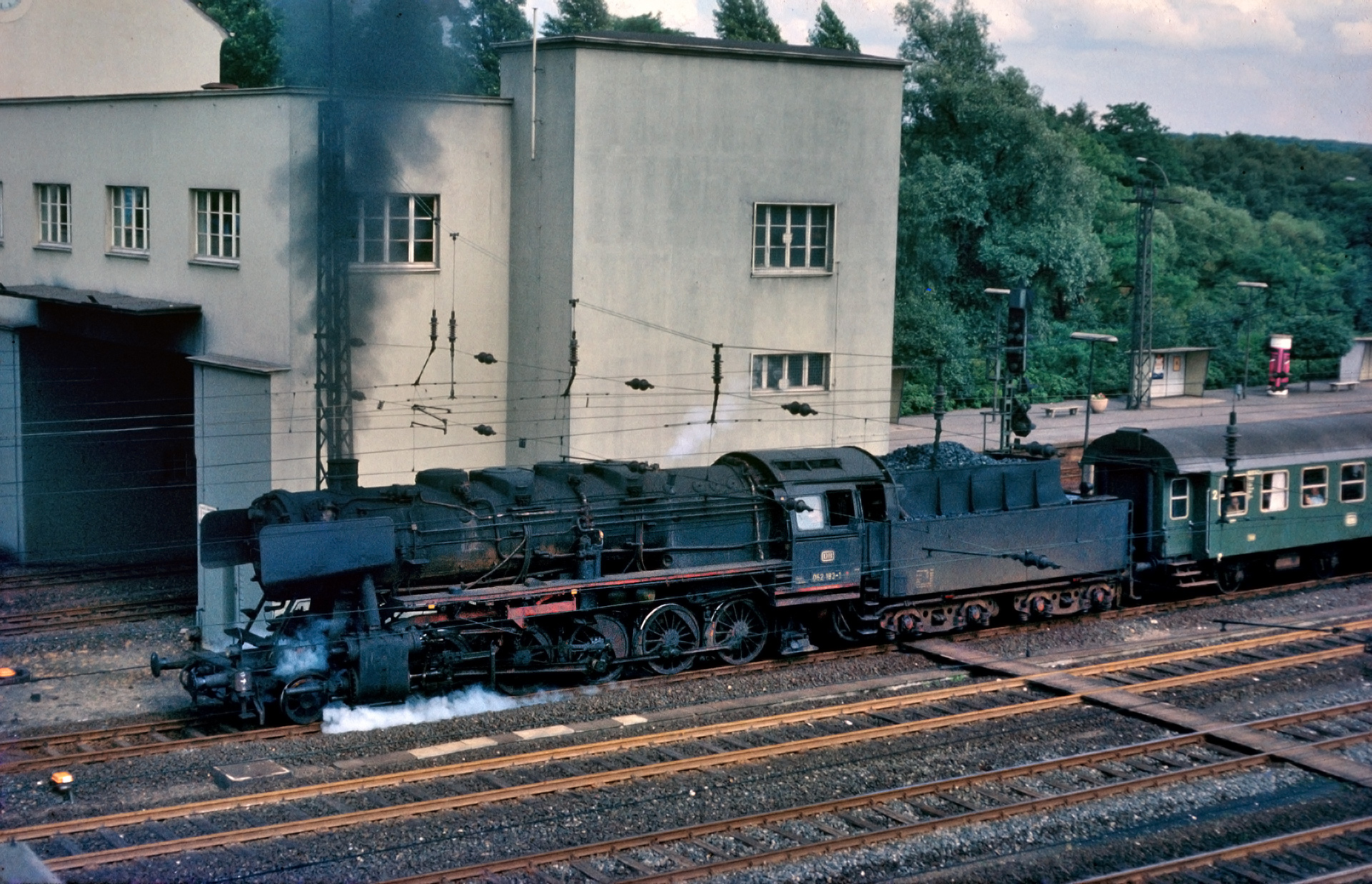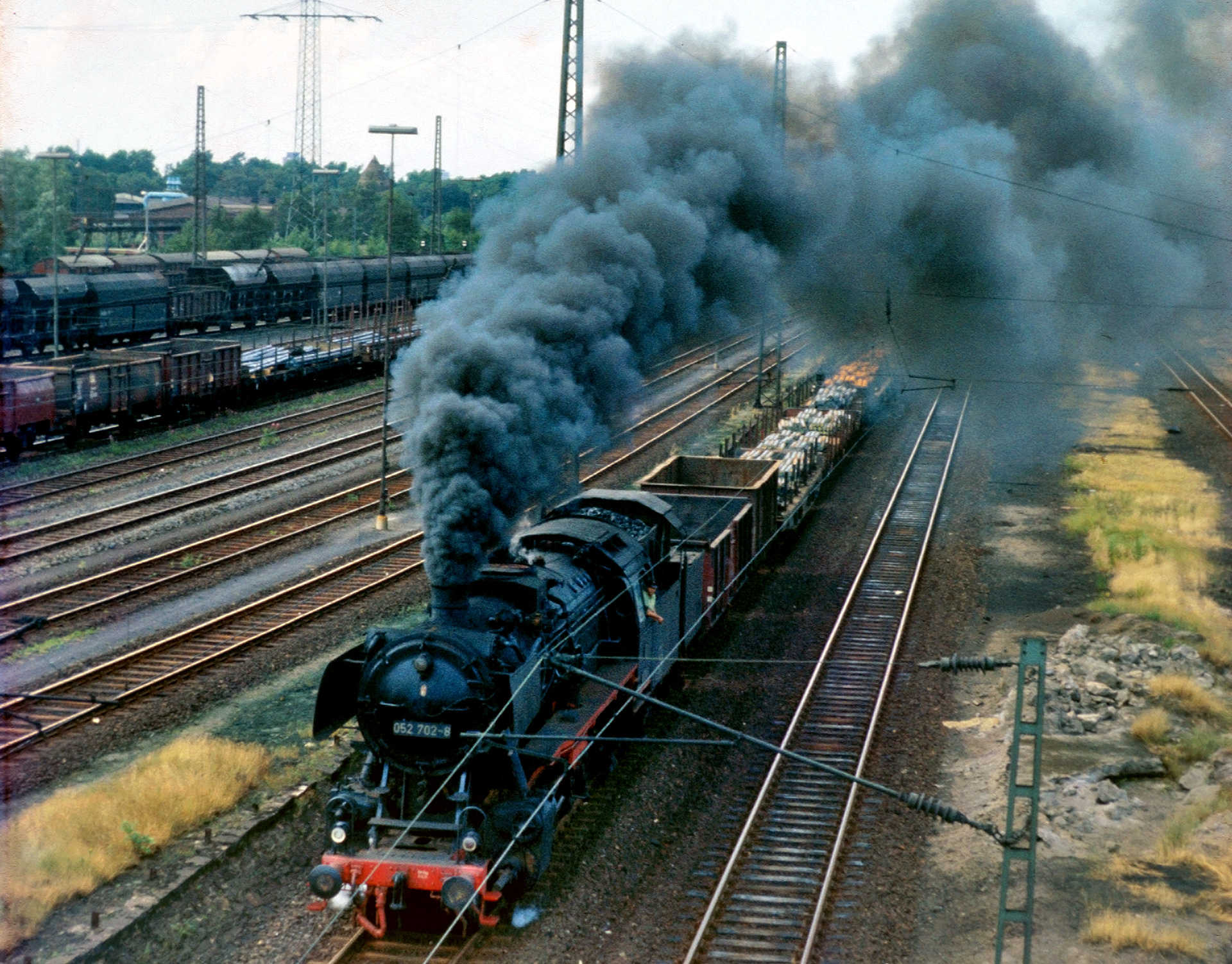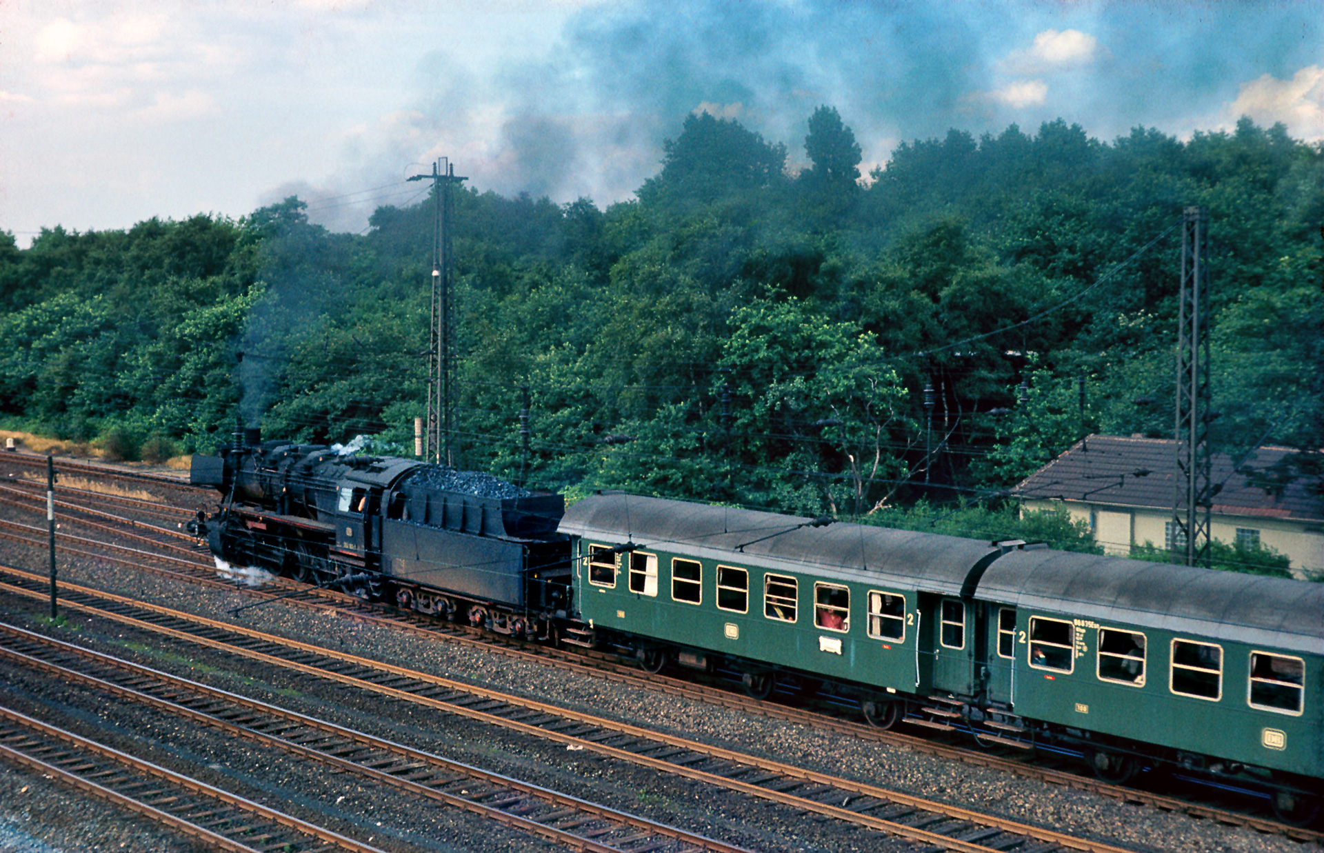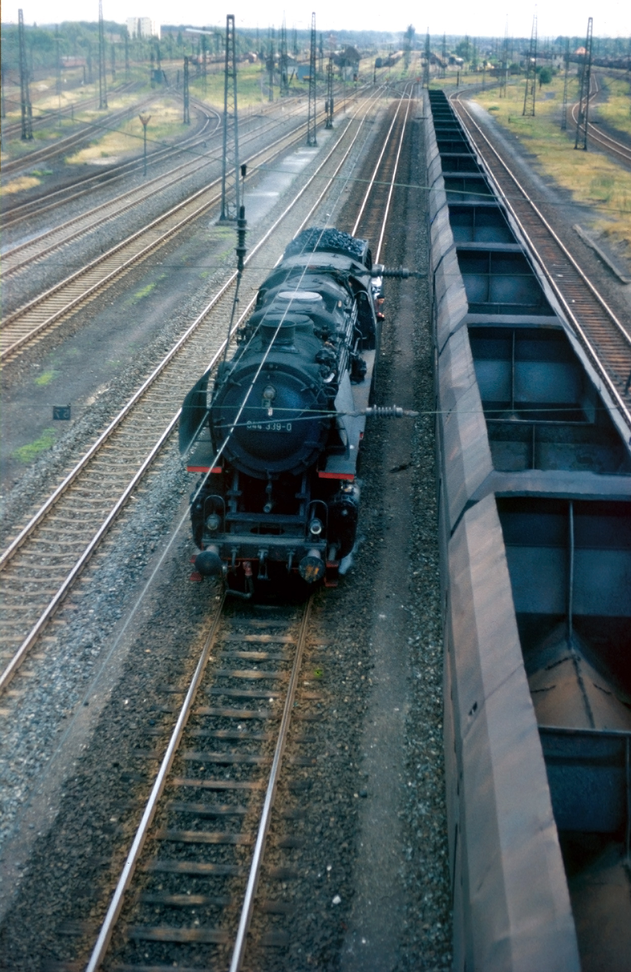 Sich ebenfalls blicken lässt sich 051 235-0. Sie gehörte zum Zeitpunkt der Aufnahme noch zum BW Oberhausen-Osterfeld, wurde später aber auch Wedau unterstellt. Sie zieht gerade einen Kalkzug durch Wedau. Tender voraus können wir ihr schön in den Kabinentender schauen. Die Originalaufnahme ist im Hochkantformat.