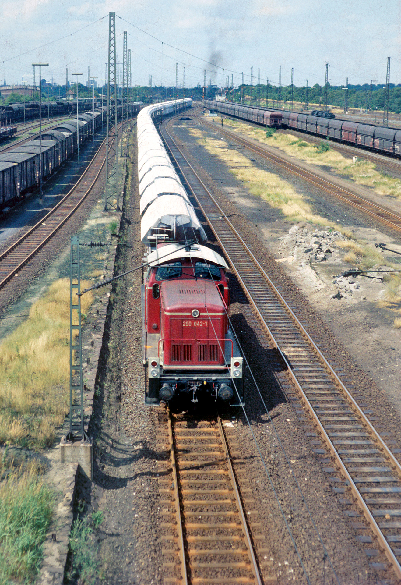 In guten Zeiten führen weit über 20 Gleise unter der Brücke her, wobei in der Mitte des Areals die Durchgangsgleise der Nord-Süd-Achse waren. Auf einem dieser Gleise fährt gerade 290 042-1. Und dabei war die Wedauer-Brücke am oberen Ende eigentlich noch ungünstig gelegen. In Höhe Blissingheim käme man auf über 60 Gleise die man hätte überqueren müssen.