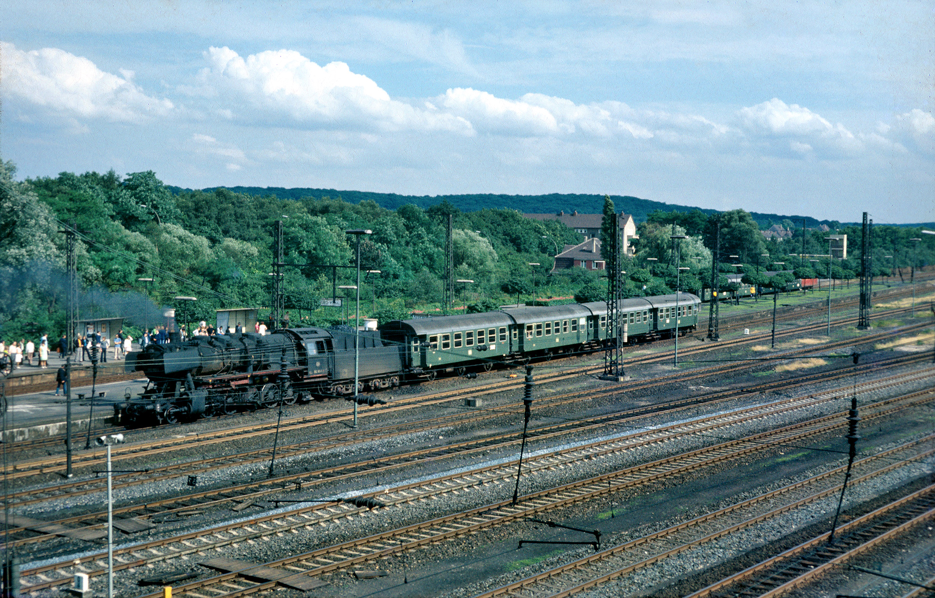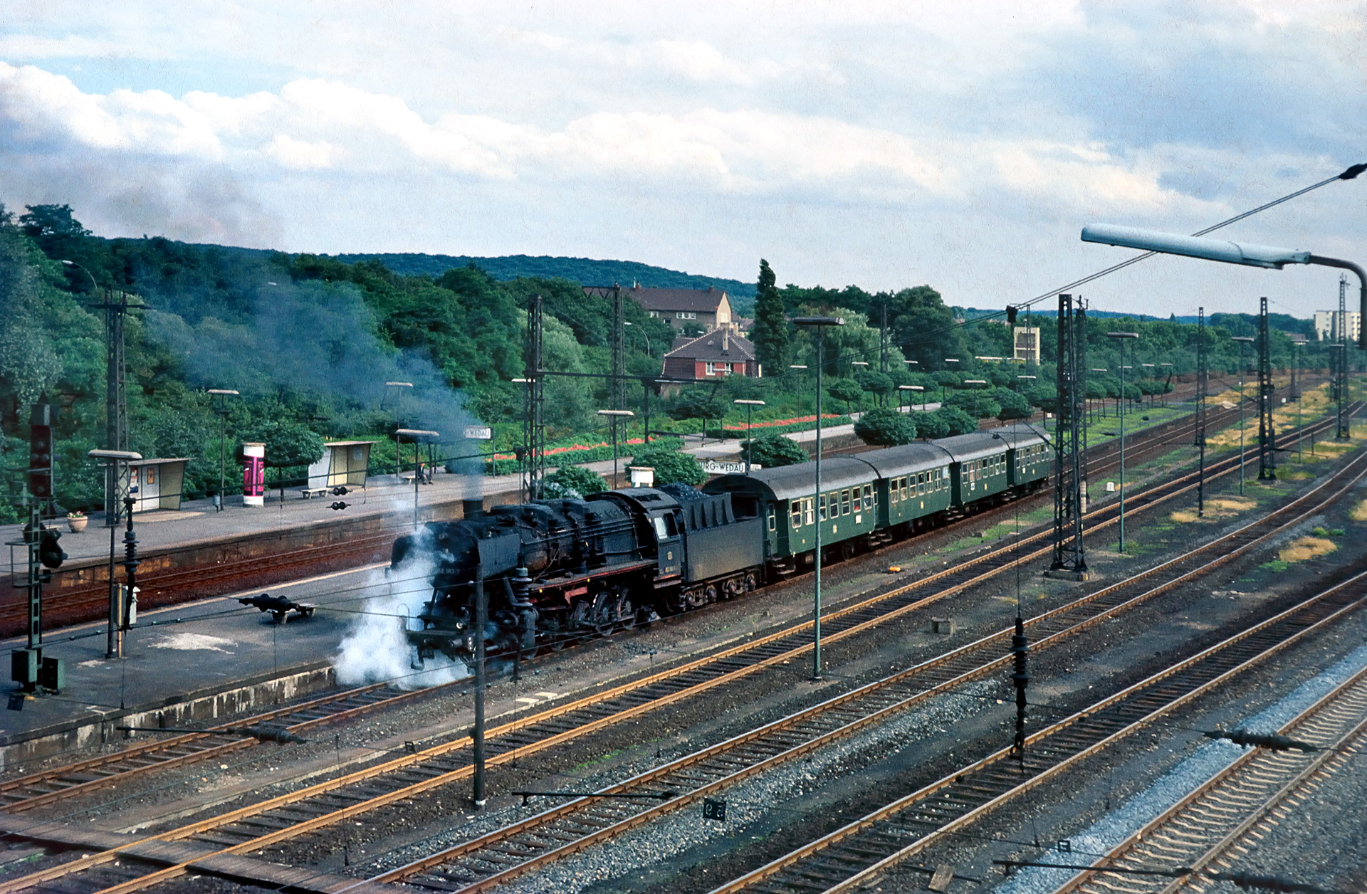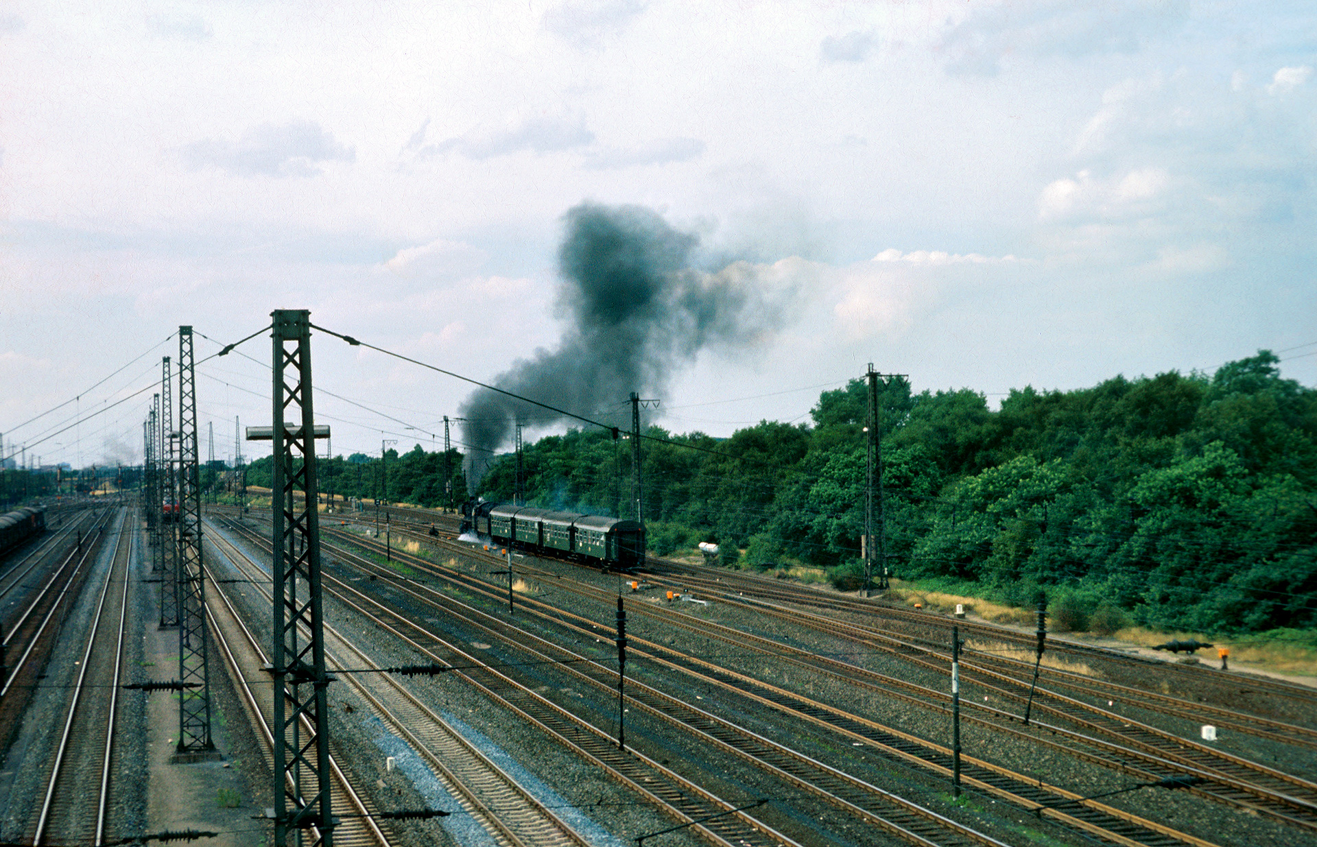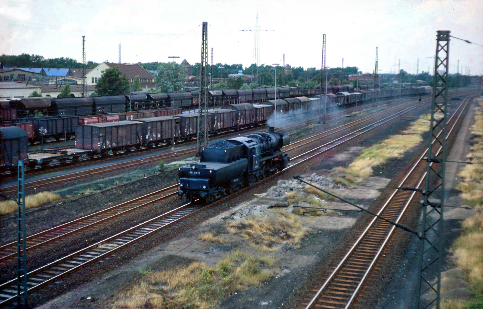Widmen wir uns zunächst 50 2183 bzw. 052 183-1, die mein Vater im Bahnhof erwischte. Auf dem ersten Bild sehen wir sie, wie sie mit vier Umbauwagen den Bahnhof Richtung Norden gerade verlässt. Die Möglichkeiten, die der Zug nun einschlagen kann sind vielfältig.