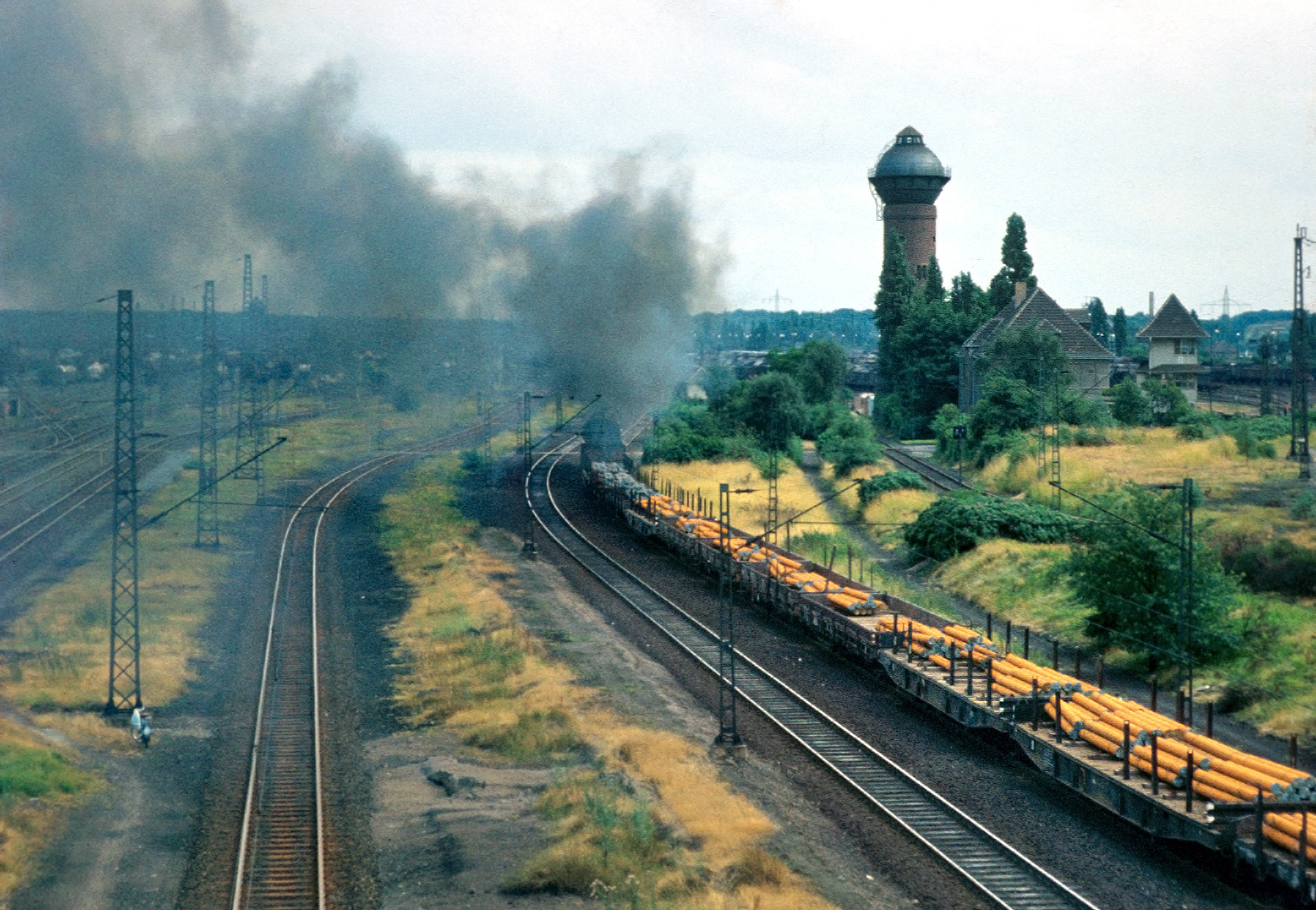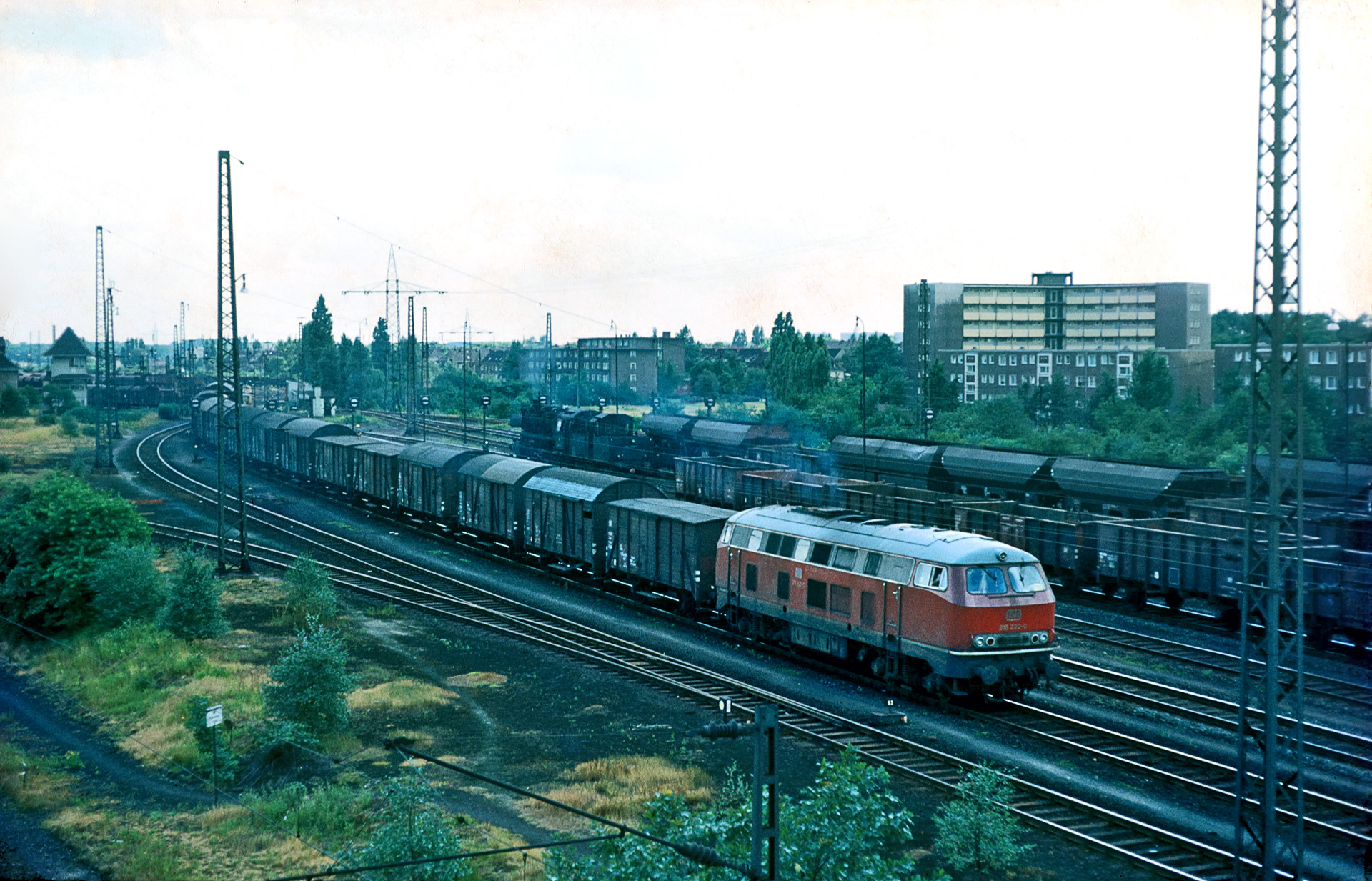 Es brauchte nur eine kleine Drehung auf der Brücke, und einem bot sich folgender Anblick. Wir sehen 216 222-0 im Vordergrund, wie sie einen Güterzug durch Wedau zieht. Im Hintergrund steht noch ein 50er mit Kabinentender. So gerade nicht auf das Bild geschafft hat es der prägnante Wasserturm. Er ist wie die Sperrsignale allerdings noch heute vorhanden und steht überdies unter Denmalschutz. Das ist aber leider noch kein Wert für sich, denn er verkommt wie das ganze Areal immer mehr.