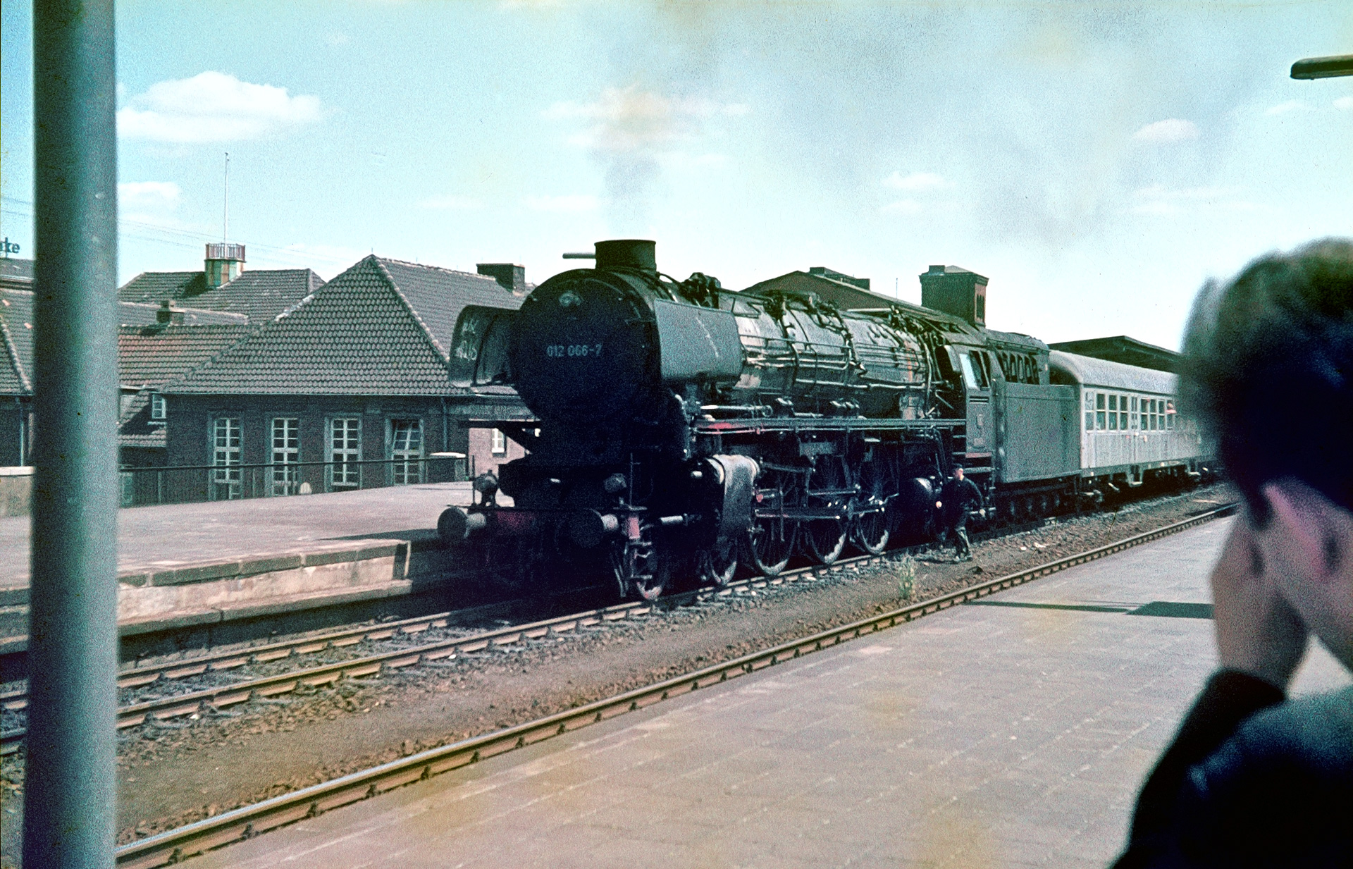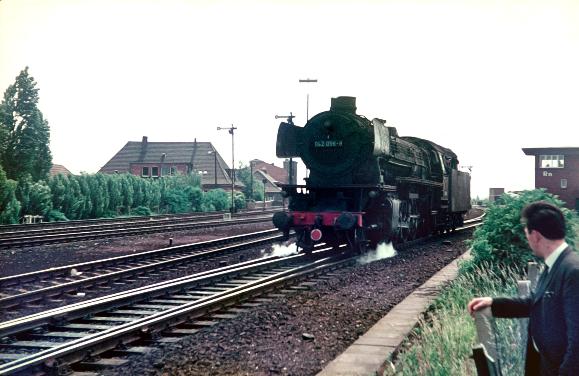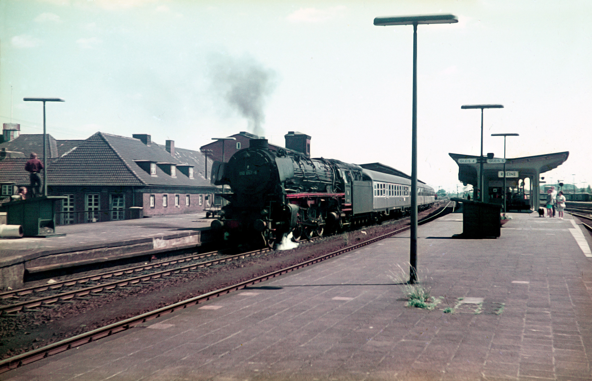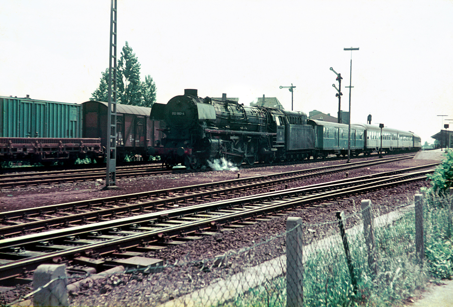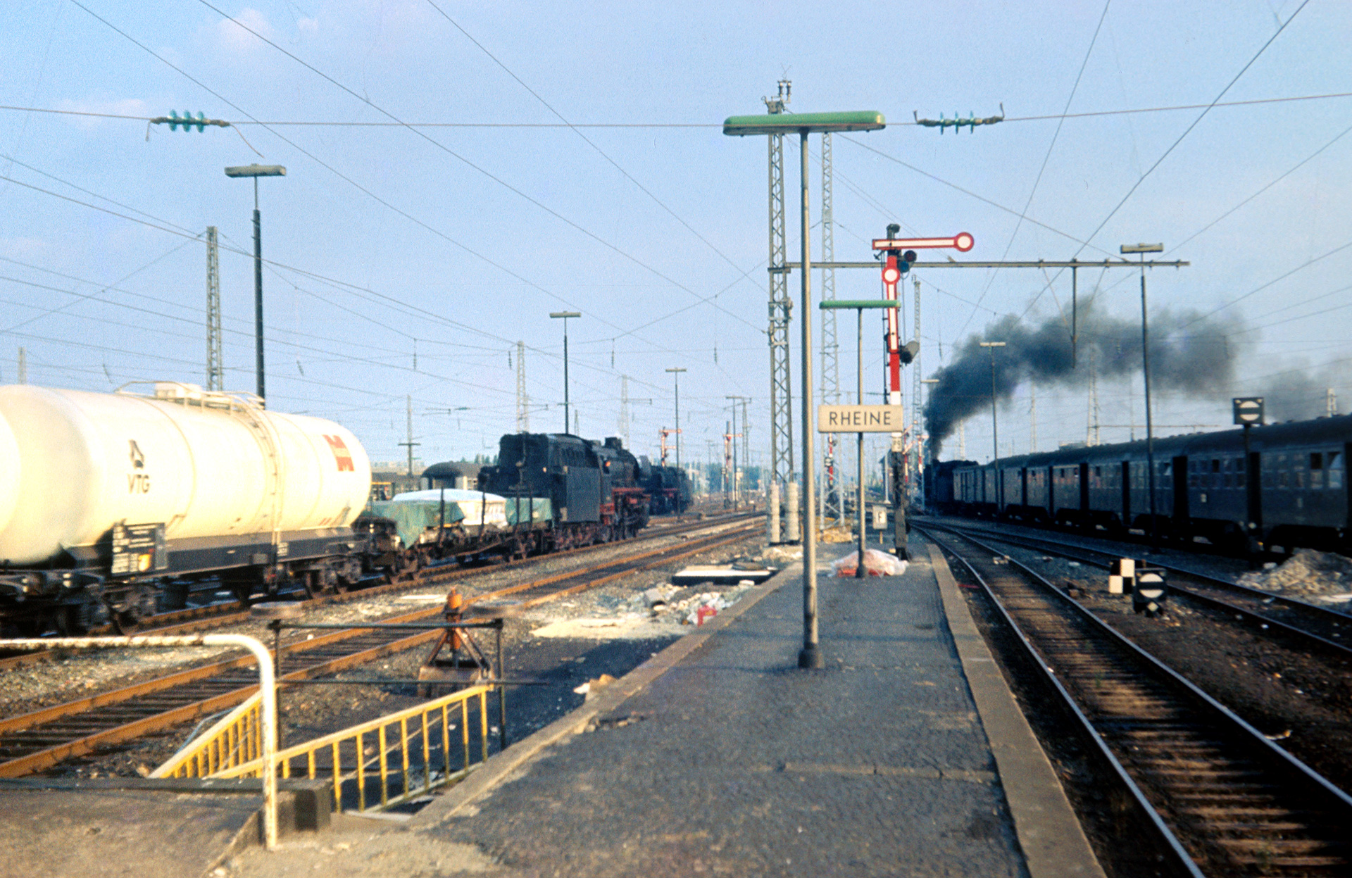 Hamburg ist auch ein gutes Stichwort um das erste Bild oben zu erklären. Zwar auf dem Bild nicht erkennbar, handelt es sich doch um 01 1074 bzw. 012 074-1 nach EDV Nummer. Die 01.10 verlässt gerade den Bahnhof Rheine südwärts und macht sich auf den Weg. Zum Aufnahmezeitpunkt war 01 1074 in Hamburg-Altona beheimatet. Ein Jahr später sollte sie auch noch in Rheine beheimatet sein, wo sie dann schließlich im Oktober 1972 ausgemustert wurde. Hier darf sie aber noch mal den Schnellzug ziehen und wir begleiten die Ausfahrt weiter:
