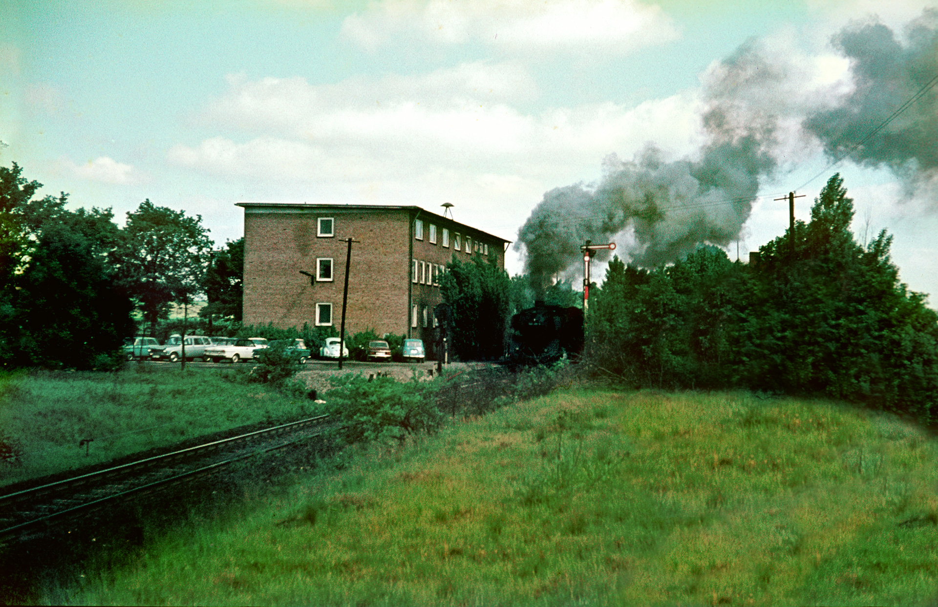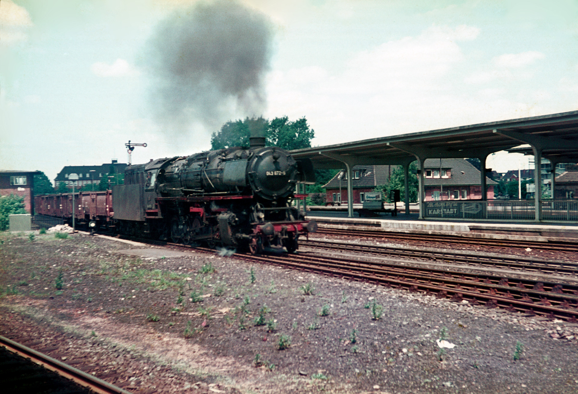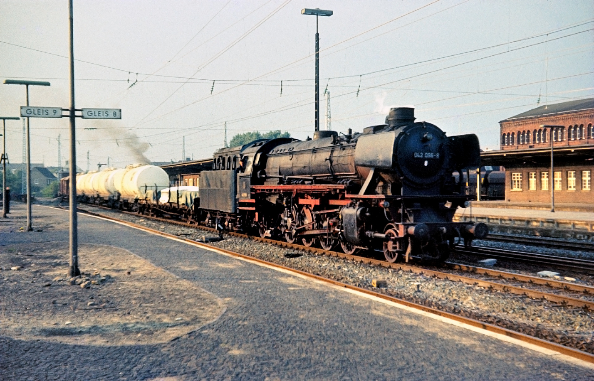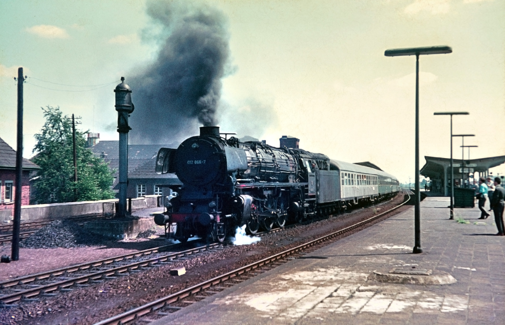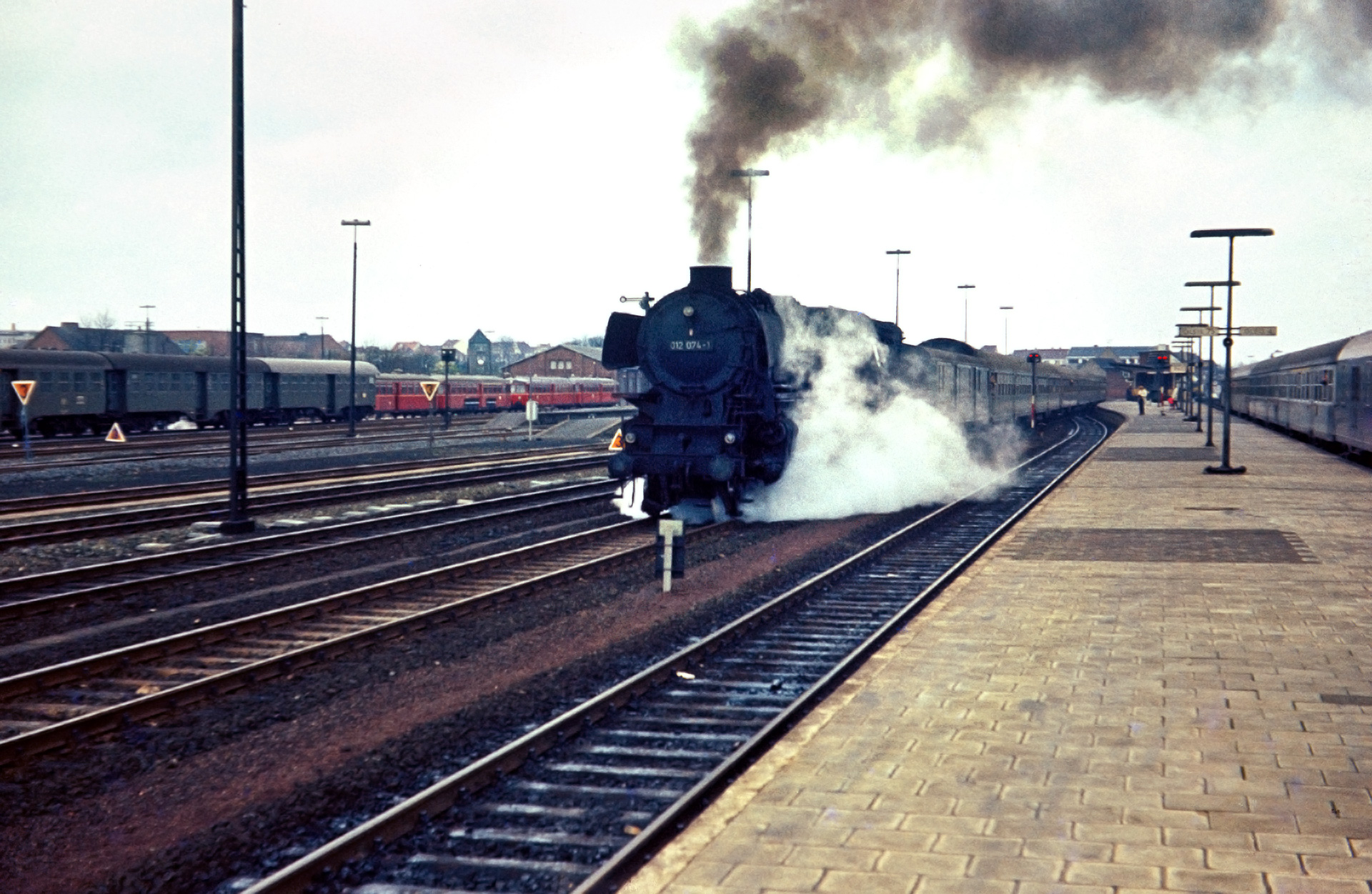 Hamburg ist auch ein gutes Stichwort um das erste Bild oben zu erklären. Zwar auf dem Bild nicht erkennbar, handelt es sich doch um 01 1074 bzw. 012 074-1 nach EDV Nummer. Die 01.10 verlässt gerade den Bahnhof Rheine südwärts und macht sich auf den Weg. Zum Aufnahmezeitpunkt war 01 1074 in Hamburg-Altona beheimatet. Ein Jahr später sollte sie auch noch in Rheine beheimatet sein, wo sie dann schließlich im Oktober 1972 ausgemustert wurde. Hier darf sie aber noch mal den Schnellzug ziehen und wir begleiten die Ausfahrt weiter: