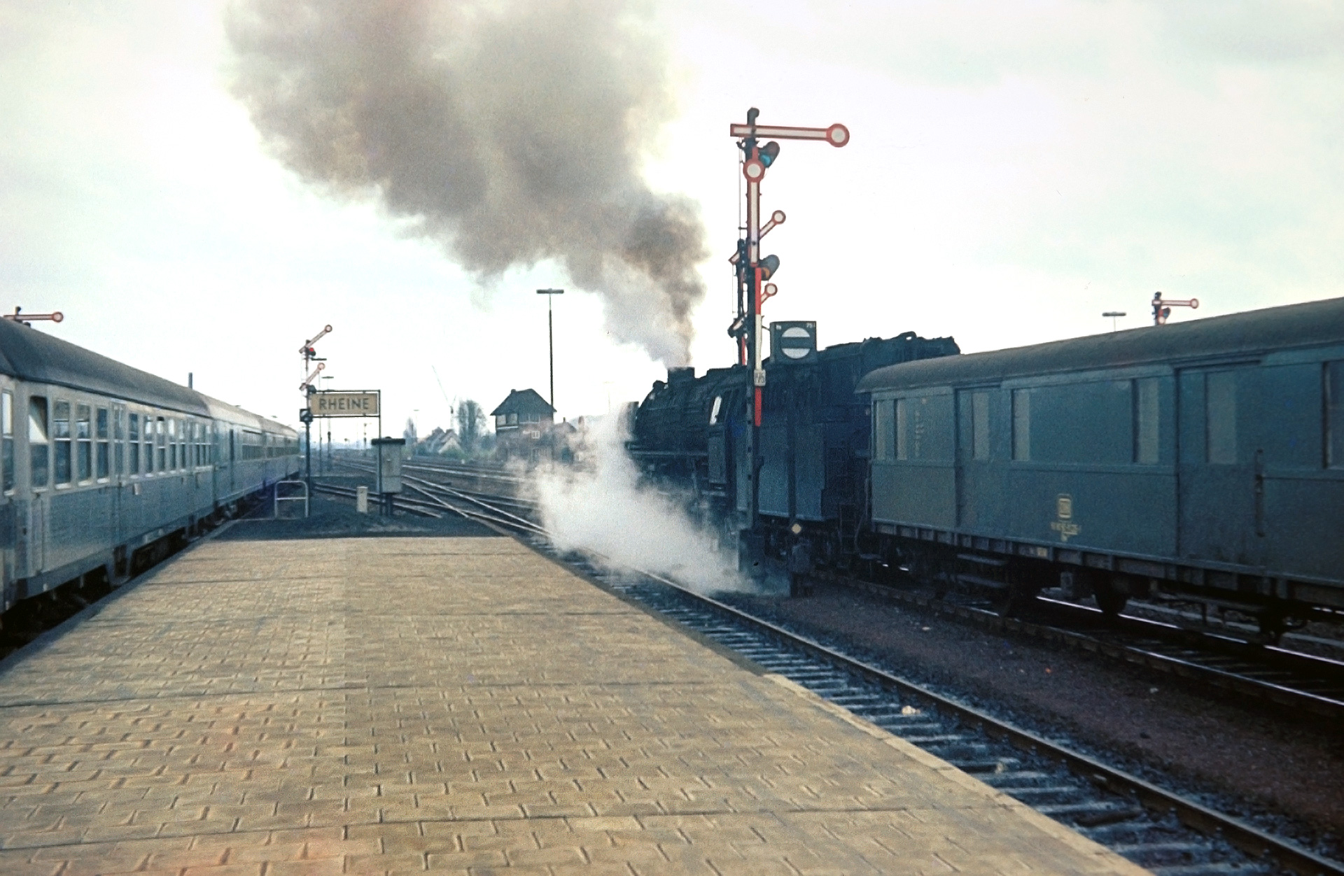 Für die, die es nicht wissen: Rheine liegt im Norden des Münsterlands und somit „ganz oben in Nordrhein-Westfalen“ an der Grenze zu. Fernab jeder Ruhrpottromantik war es aber doch genau diese abgelegene Strecke, die mein Vater – alles andere als alleine – bis zum Dampflokverbot 1977 wieder und wieder aufsuchte. Rheine ist nach Münster die größte Stadt des Münsterlands und der Bahnhof zu dieser Zeit ein ausgeprägter Bahnknotenpunkt mit Anschluss in Richtung Emsland, Nordseeküste, Ruhrgebiet, Niederlande und nicht zuletzt Hamburg.