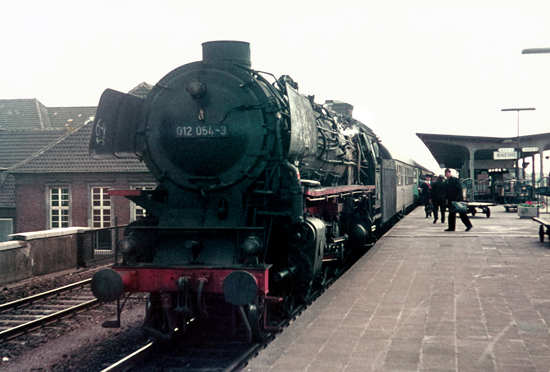 Gehen wir nun wieder auf den Bahnsteig. 01 1054 steht bereits im Bahnhof Rheine auf Gleis 2 und wartet darauf fotografiert zu werden. Gesagt, getan. Natürlich trägt auch sie 1970 bereits seit zwei Jahren ihre EDV-Nummer, in ihrem Fall 012 054-3.