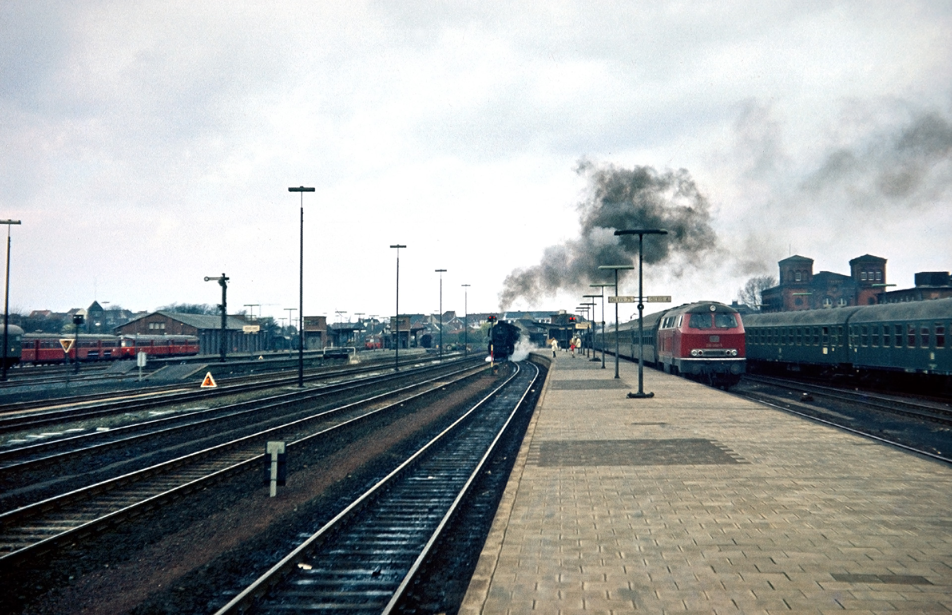 Und wo wir gerade schon so gut dabei sind Museumsloks im Regelbetrieb zu betrachten, folgt nun noch ein Bild eines heutigen Denkmals. Sie steht heute vor dem Hauptbahnhof Braunschweig und erinnert an die Dampflokzeit und die damalige Dampflokhochburg Braunschweig. 1975 sollte sie die betrübliche Ehre haben, den letzten mit einer BR 01 bespannten Schnellzug durch die Bundesrepublik zu ziehen. Es handelte sich um E 3265 am 31. Mai 1975 und die Rede ist natürlich von 01 1063, die hier unter ihrer EDV-Nummer 012 063-4 Rheine verlässt – vielleicht sogar Richtung Emden.