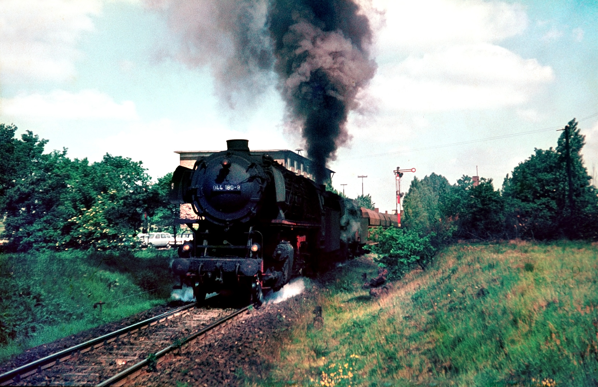 Der um sich greifende, blaue Farbstich ist auch nach der Bearbeitung leider noch deutlich sichtbar. Das wird im Wesentlichen auch leider so bleiben. Einige Teile des Bildes sind bereits komplett verloren. Deutlich besser klappte es beim nächsten Bild. Ob es der Zug des oben Bildes ist bleibt Spekulation. Wir sehen aber 044 180-8 im Vorspann. Die Nachspannlok ist nicht zu ermitteln.