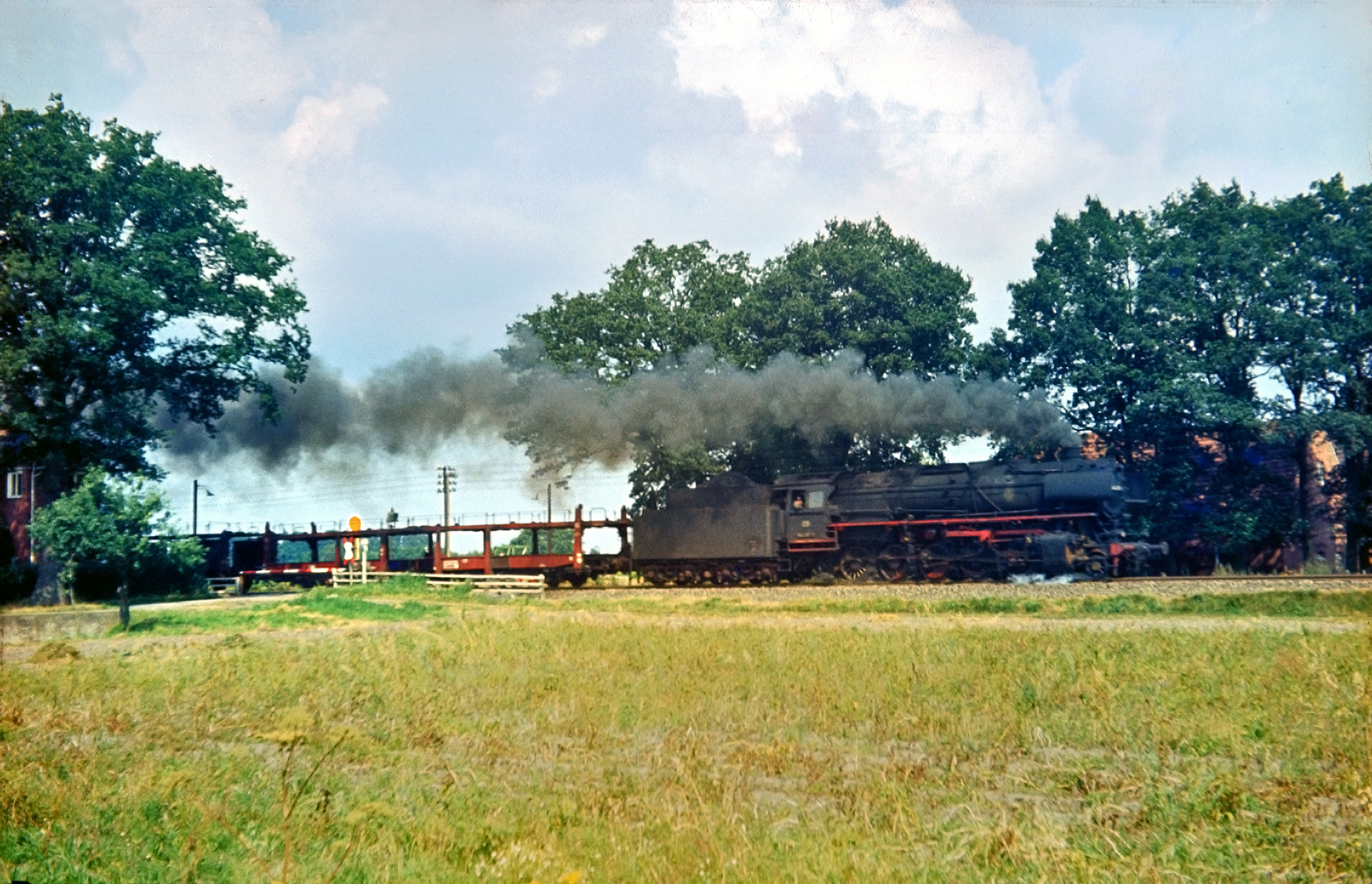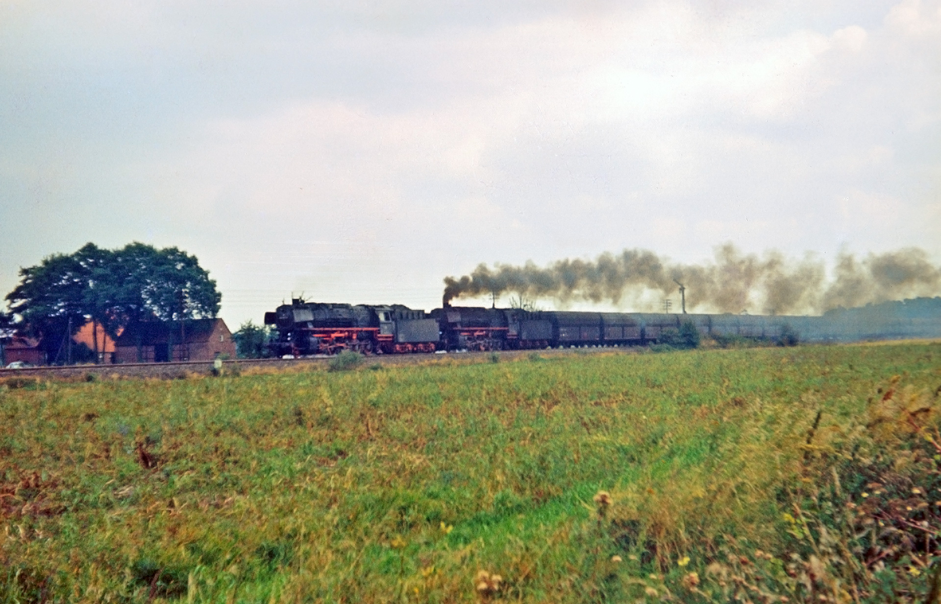 Leider hat der Film den mein Vater für die Aufnahmen verwendet hat zu viel Korn, als dass eine sichere Identifizierung der Loks möglich wäre. Sicher ist nur, dass es sich um BR 44er handelt, die er an jenem Sommertag abgelichtet hat. Hier sogar in Doppeltraktion, wenngleich die Vorspannlok noch weniger den Eindruck erweckt sonderlich gerne arbeiten zu wollen.