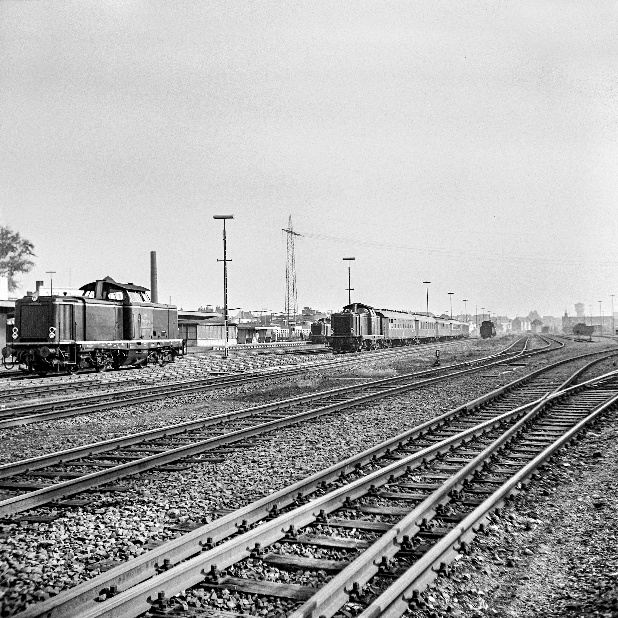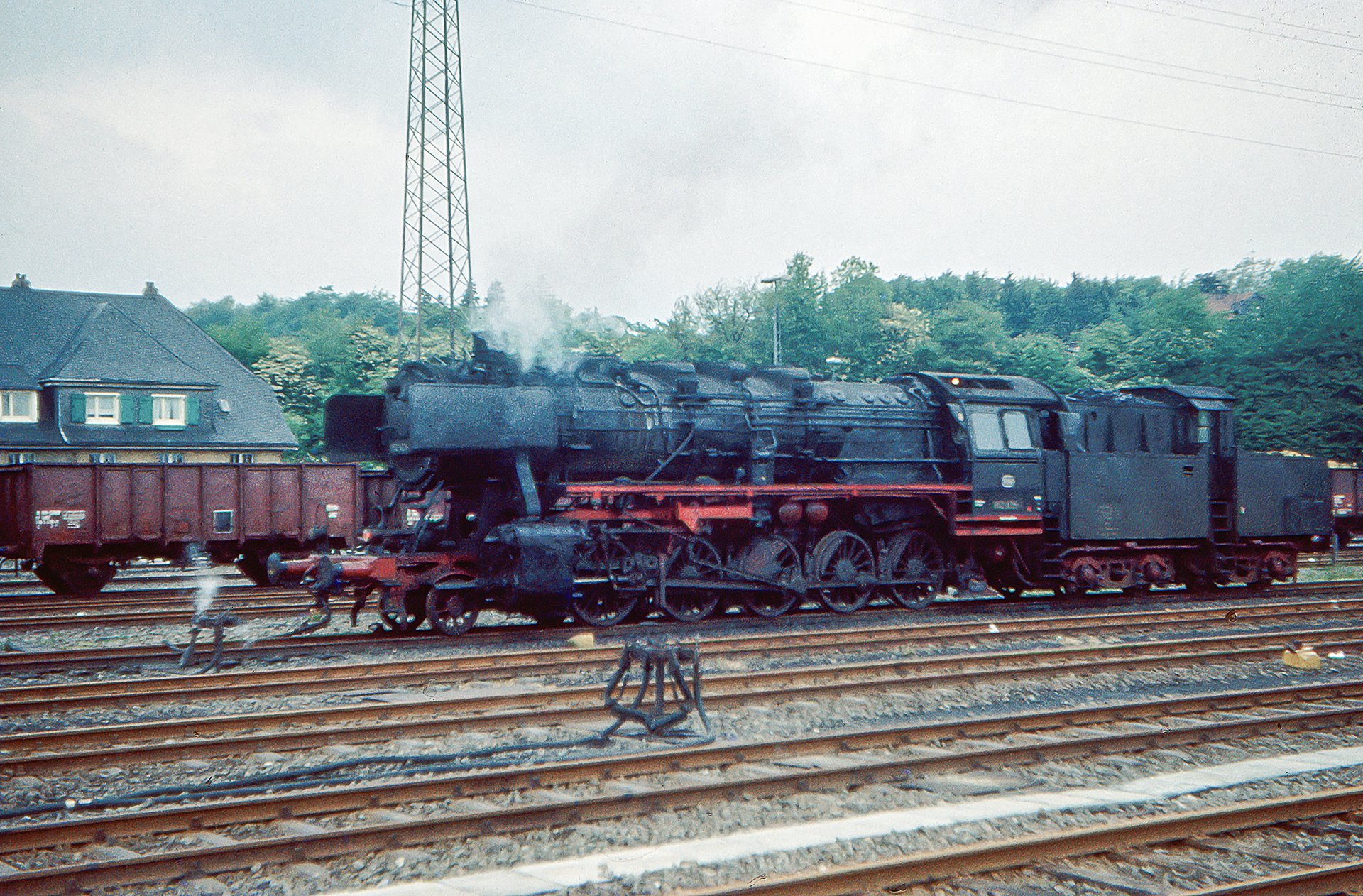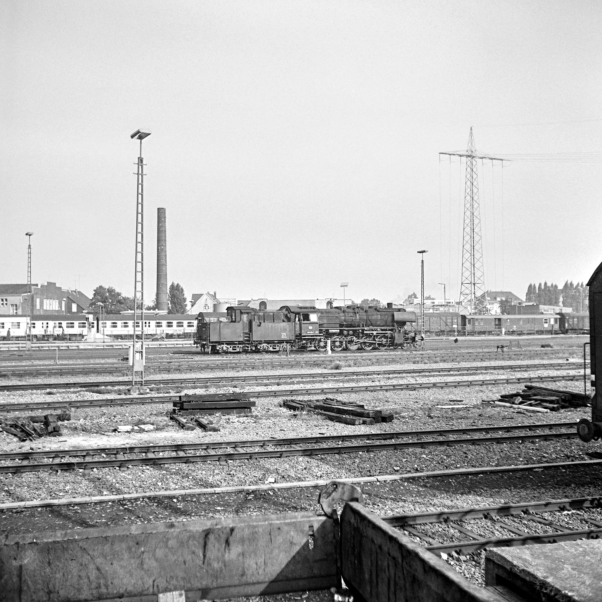 Leider haben die Dias doch bereits etwas gelitten und auch der nochmalige Versuch etwas zu retten aus dem matschigen Celluloid ist von unbefriedigtem Ergebnis. Der Vollständigkeit halber gehören sie aber natürlich auch in diesen Artikel, zeigen sie doch dass die Position, an der die Heizloks abgestellt waren, variierte. Musste man für alle vorherigen Bilder vom Bahnsteig aus den Blick gen Südwesten richten, sind die beiden folgenden Aufnahmen mit Blick in den nördlichen Bereichs des Bahnhofs angefertigt worden. Außerdem sehen wir mit 50 606 schon wieder eine andere 50er die für Dampf sorgt.