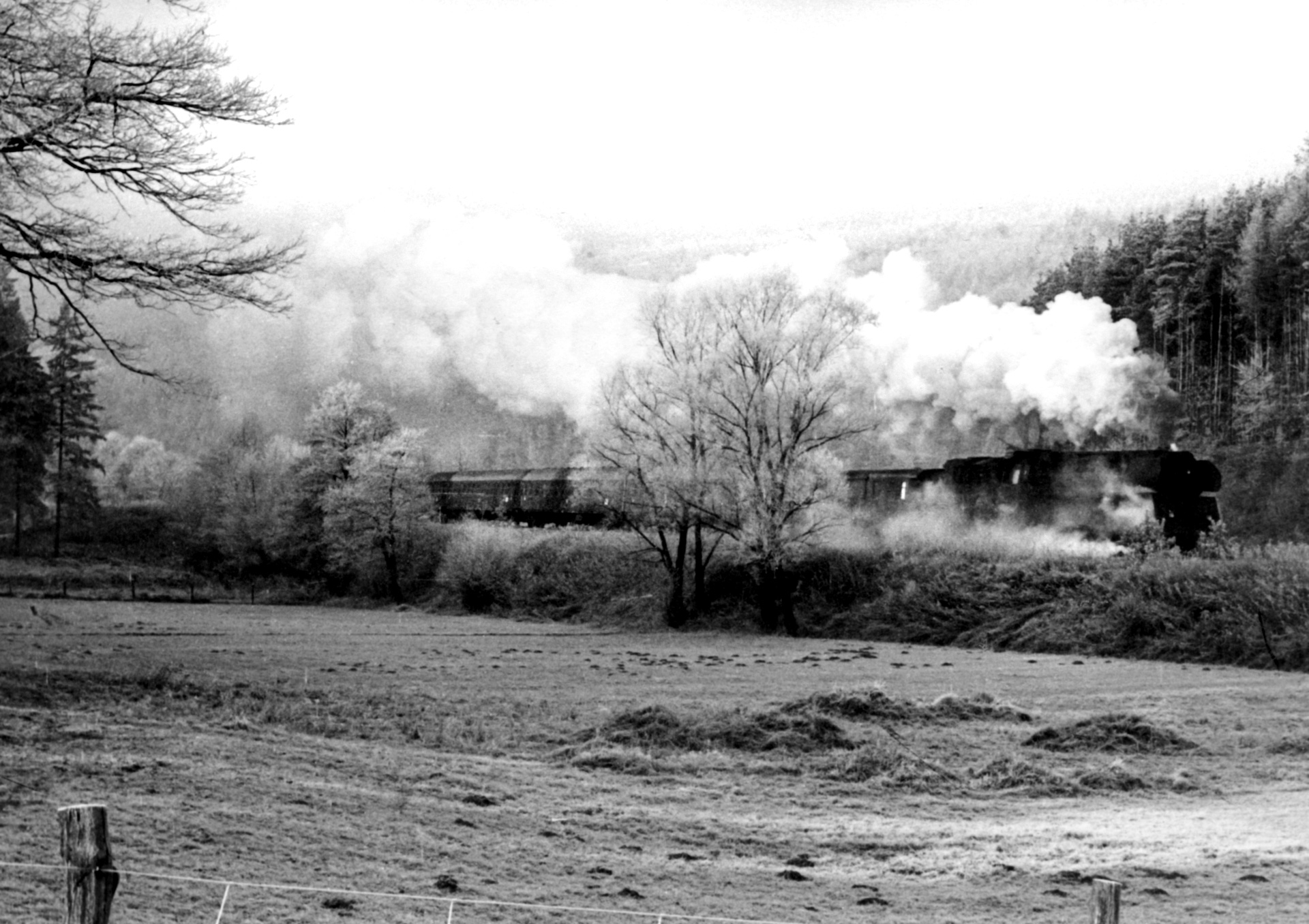 Beschließen wir die Serie mit einer weiteren Aufnahme von 01 0507-7 im Vorspann vor 01 0529-6. Beide Maschinen kommen aus Bebra zurück und sind auf dem Weg nach Gerstungen. Die Aufnahme entstand laut Archiv in „Hönebach, Ausfahrt Gerstungen“