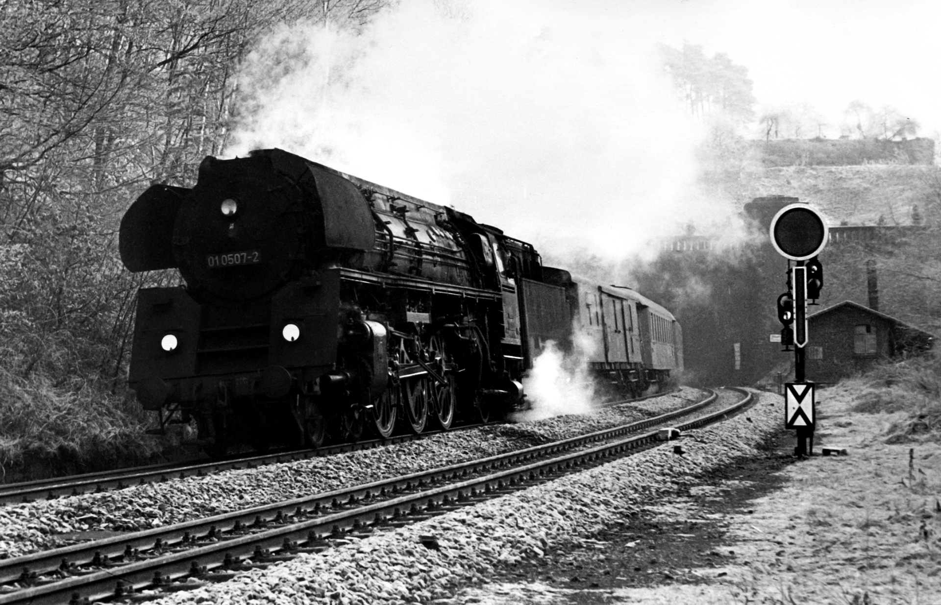 Ein beliebtes Fotomotiv war natürlich der Tunnel in Hönebach, den auch mein Vater ablichtete. Das Foto entstand auf der Westseite des Tunnels und zeigt 01 0507-2 mit D2100 am Haken. Auf dem Foto gut erkennbar sind ihre Boxpok Radsätze. Sie waren ein Unikum auf deutschen Schienen und auch nur die ersten 8 Maschinen der Baureihe DR 01.5 haben diese erhalten, da die Lokführer den unruhigen Lauf und lose gelaufene Radsterne bemängelten. Der Grund dafür waren wohl Fertigungsmängel. Später wurde auch bei den Maschinen mit Boxpok Radsätzen wieder Speichenräder verbaut.