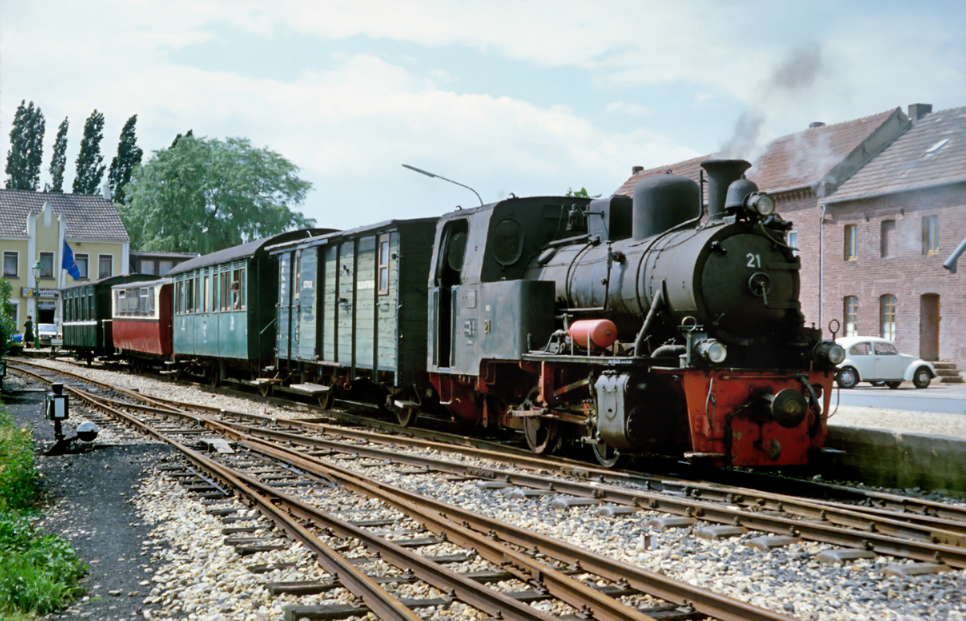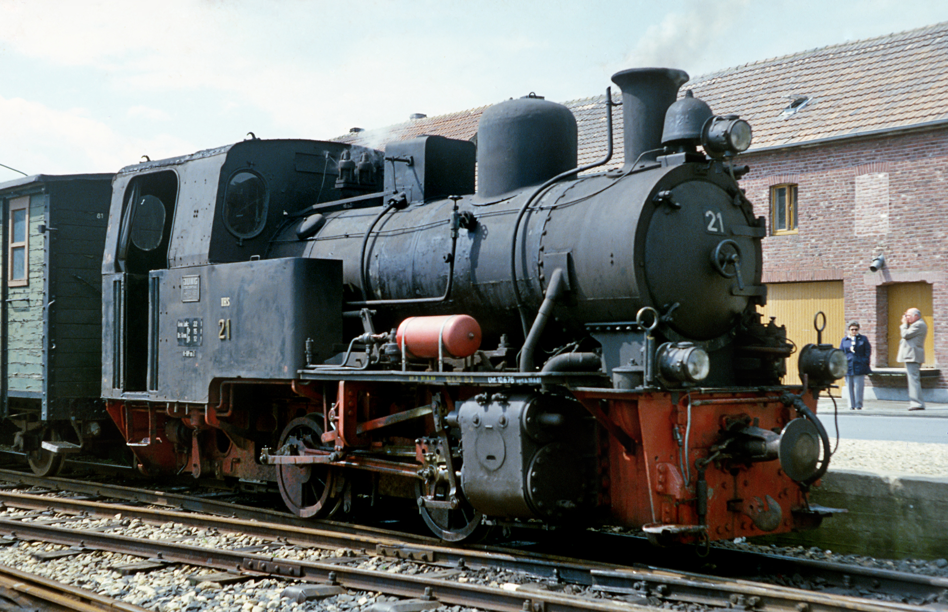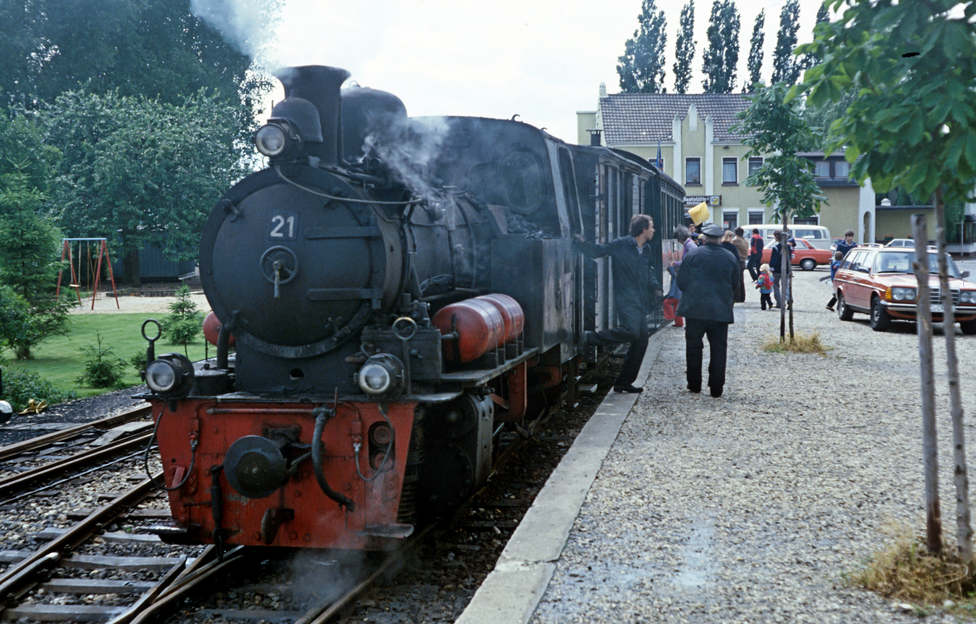 Das schlechte Wetter, auch das sollte irgendwie eine Konstante werden in den folgenden Jahrzehnten, lag irgendwo über Geilenkirchen. Für ein Foto des gesamten Zuges gab es praktisch ideales Licht. Im ersten Personenwaggon schaut gerade mal eine Person aus dem Fenster. Überhaupt wirkt die Selfkantbahn wenig überlaufen. Das Stöhnen meines Vaters und das tiefe Ziehen an der Pfeife ob der ermüdenden Parkplatzsuche aus späteren Jahren habe ich noch gut im Ohr. Hier scheint es keine Probleme mit der Parkplatzfindung gegeben zu haben. Mittlerweile hat sich dieses Problem ohnehin deutlich entspannt. Die Person, die dort aus dem Fenster des ersten Waggons schaut ist, wie es der Zufall will, meine Mutter. Dazu später mehr. Werfen wir noch erst einen Detailblick auf Lok 21, dafür sind wir ja hier!