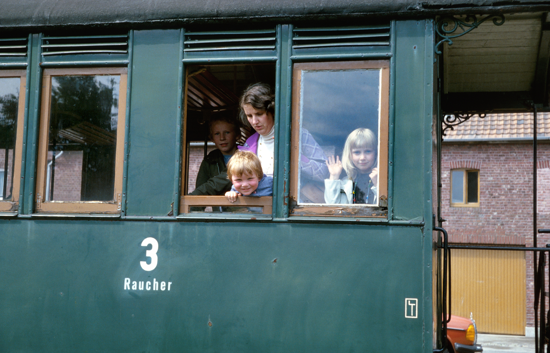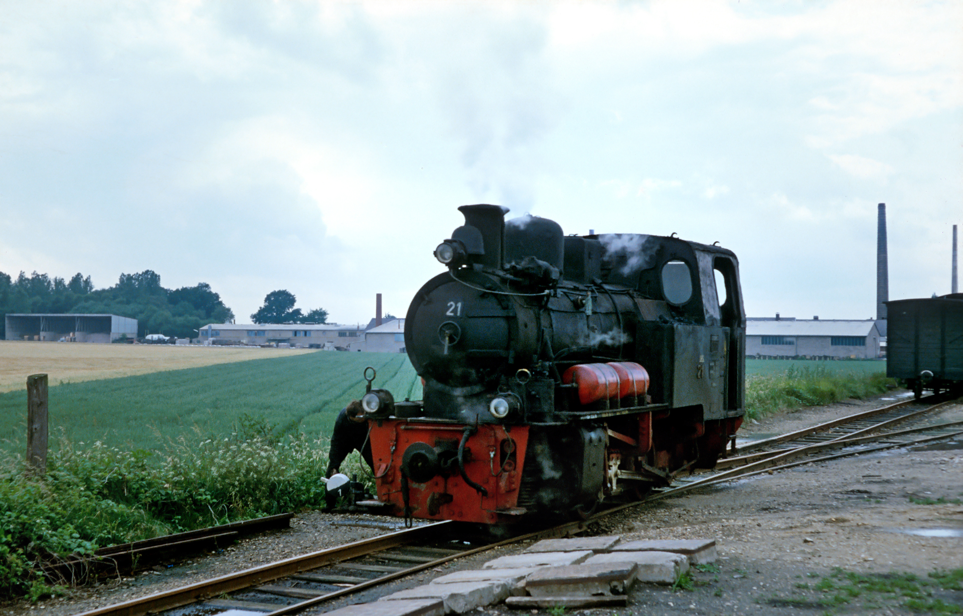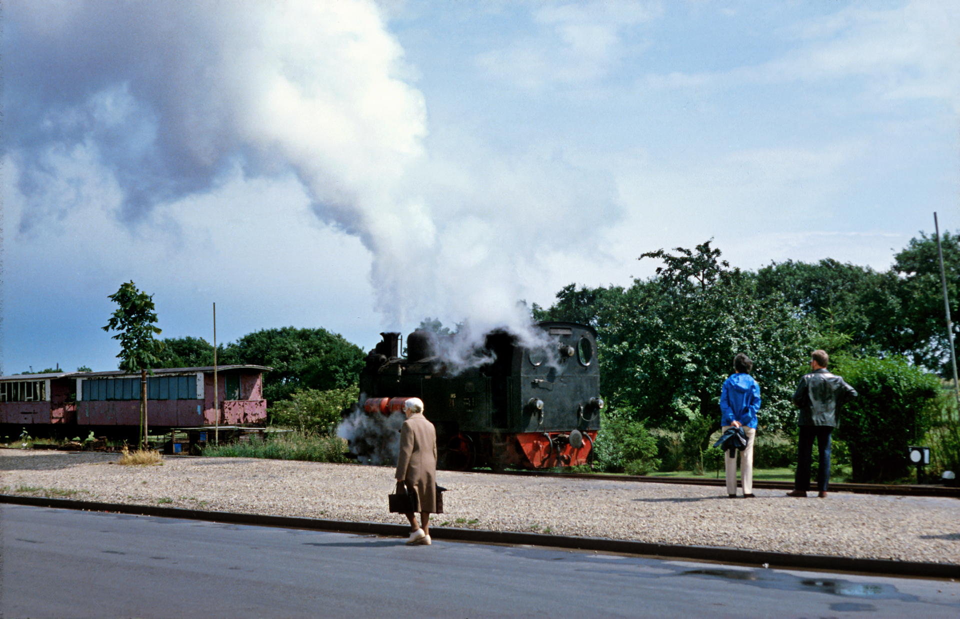 Das schlechte Wetter, auch das sollte irgendwie eine Konstante werden in den folgenden Jahrzehnten, lag irgendwo über Geilenkirchen. Für ein Foto des gesamten Zuges gab es praktisch ideales Licht. Im ersten Personenwaggon schaut gerade mal eine Person aus dem Fenster. Überhaupt wirkt die Selfkantbahn wenig überlaufen. Das Stöhnen meines Vaters und das tiefe Ziehen an der Pfeife ob der ermüdenden Parkplatzsuche aus späteren Jahren habe ich noch gut im Ohr. Hier scheint es keine Probleme mit der Parkplatzfindung gegeben zu haben. Mittlerweile hat sich dieses Problem ohnehin deutlich entspannt. Die Person, die dort aus dem Fenster des ersten Waggons schaut ist, wie es der Zufall will, meine Mutter. Dazu später mehr. Werfen wir noch erst einen Detailblick auf Lok 21, dafür sind wir ja hier!