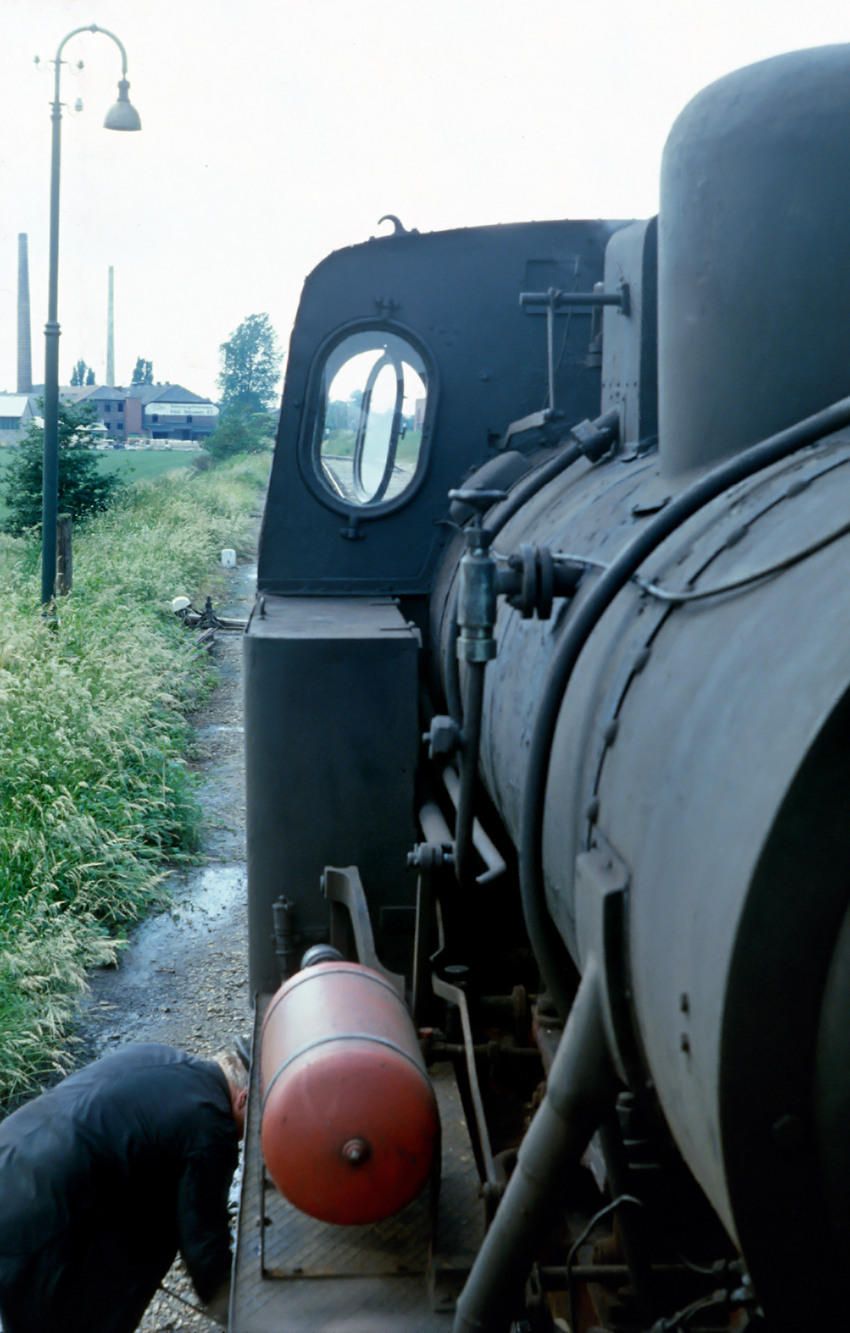 Am Rande sei zuvor bemerkt, dass das Rohr aus der Häuserwand hinter der Lok eine interessante Zielposition zu entfalten vermag… Wie bereits oben beschrieben, sieht man der Lok durchaus noch ihren ursprünglichen Einsatzzweck, Einsatzort und die harte Arbeit an. Es war halt ein Arbeitstier und ist kaum zu vergleichen mit den heute herausgeputzten Museumsloks der Selfkantbahn. Überhaupt macht auch das Rollmaterial noch nicht unbedingt den besten Eindruck zu dieser Zeit, die wohl für die Museumsbahner mehr davon geprägt war erstmal im Land zu retten, was es noch zu retten gab. Erst in späteren Jahren entwickelte sich der heute besterhaltene und gepflegte Fuhrpark der „letzten Kleinbahn in Nordrhein-Westfalen“ lt. eigener Werbeaussage, die vor allem dann gültig ist, wenn man die Märkische Museumsbahn / Sauerländer Kleinbahn geflissentlich ignoriert.