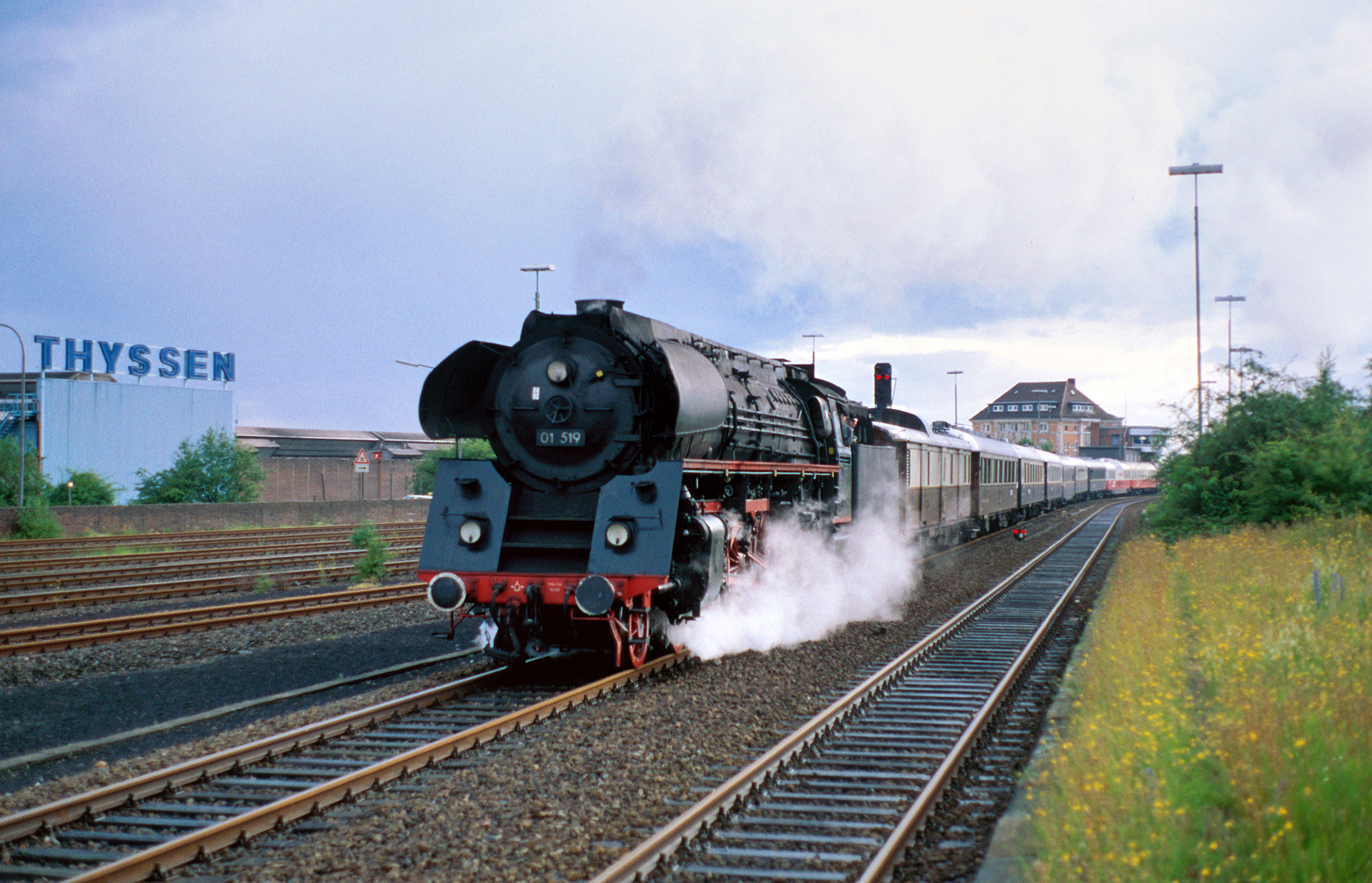 - Zum anderen haben wir es hier nicht mit irgendeiner 01 zu tun, sondern mit einer Reko 01 der Deutschen Reichsbahn. Dass ausgerechnet eine Ex-DDR Umbau-01 den Weg nach Remscheid findet, ist ein echter Glücksfall für Fotografen. Die Lok dann noch prägnant neben der Thyssen Leuchtreklame am Remscheider Hauptbahnhof abzulichten zeigt plakativ dass die Einigung Deutschlands offenkundig vollzogen wurde. Die letzten Reko 01 – darunter auch jene 01 519 – hat mein Vater lange nicht gesehen. Zuletzt musste er bis Bebra reisen um sie vor die Linse zu bekommen. Auch das ist zum Zeitpunkt dieser Aufnahmen bereits 25 Jahre her gewesen.
