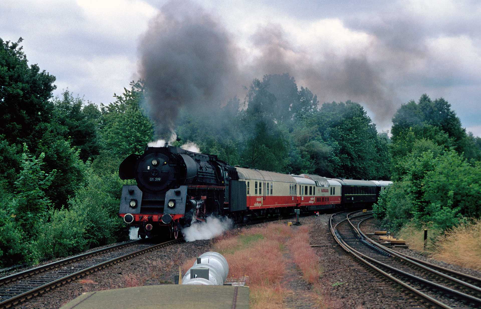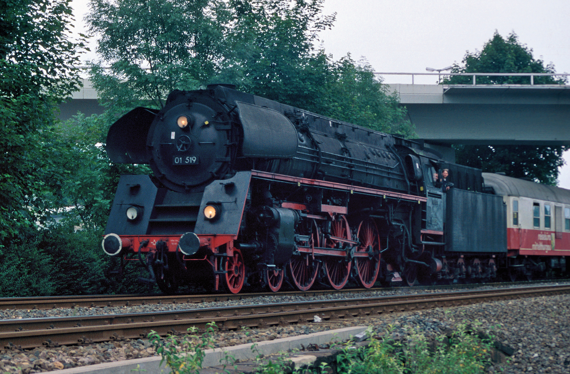 - Zum einen haben wir es mit Zuglok 01 519 mit einer Lokgattung zu tun, welche ohnehin höchst selten auf der Remscheider Strecke zugegen war. Man muss tief im Archiv suchen um zu finden, wann die letzte 01 zuvor durch Remscheid kam. Ich bin im März 1973 gelandet, anlässlich der Dampfzug Sternfahrt nach Lennep. Immerhin gut 25 Jahre liegen also zwischen den beiden Besuchen einer 01 in Remscheid.
