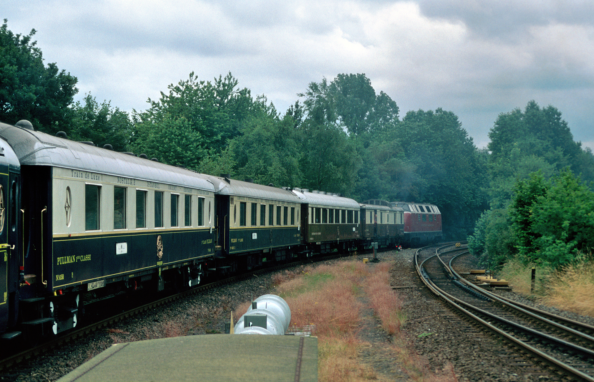 Dass das Wetter auch anders kann, kann man an ganz ähnlicher Stelle beobachten, nämlich am Bahnsteig von Güldenwerth. Dort gibt es eine Aufnahme des Orient-Express bei erstklassigem Wetter. Das ist nicht untypisch für Sonderfahrten in Remscheid: Bei einem Wochenende fällt ein Tag ins Wasser. Für den Fotografen bedeutet dies, dass an einem Tag schwierige bis unmögliche Bedingungen vorherrschen. Natürlich ist das Wetter an dem Tag bestens, als nicht 01 519 den Zug zieht. Dass die Bahn Mitte der 90er Jahre die Strecke dem wilden Baumwuchs überließ tat das Übrige für schwere Lichtverhältnisse. Es ist auch durchaus vorgekommen dass man im Sonnenschein Richtung Bahnhof startete, dort angekommen der Regen einsetzte und die Wolkendecke pünktlich mit Verlassen des Zuges aus dem Bahnhof aufriß. Welcher Trainspotter kann davon keine Arien singen? Widmen wir uns erstmal besserem Wetter in Güldenwerth.