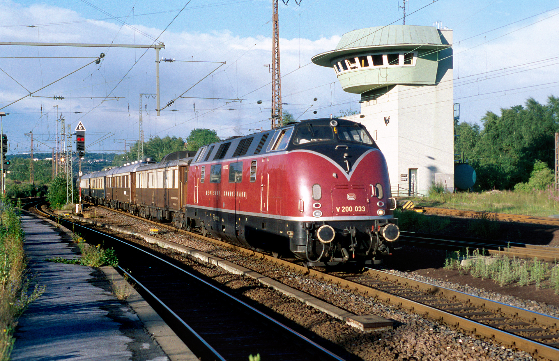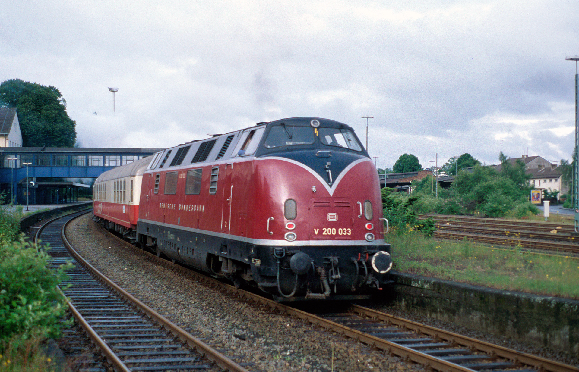 V200 033 treffen wir wieder in Remscheid-Lennep. Mit etwas Glück, wenn der Zug Aufenthalt in Remscheid Hbf. hat, schafft man es von Güldenwerth bis nach Lennep um noch die Einfahrt festzuhalten, so auch an jenem Tage: