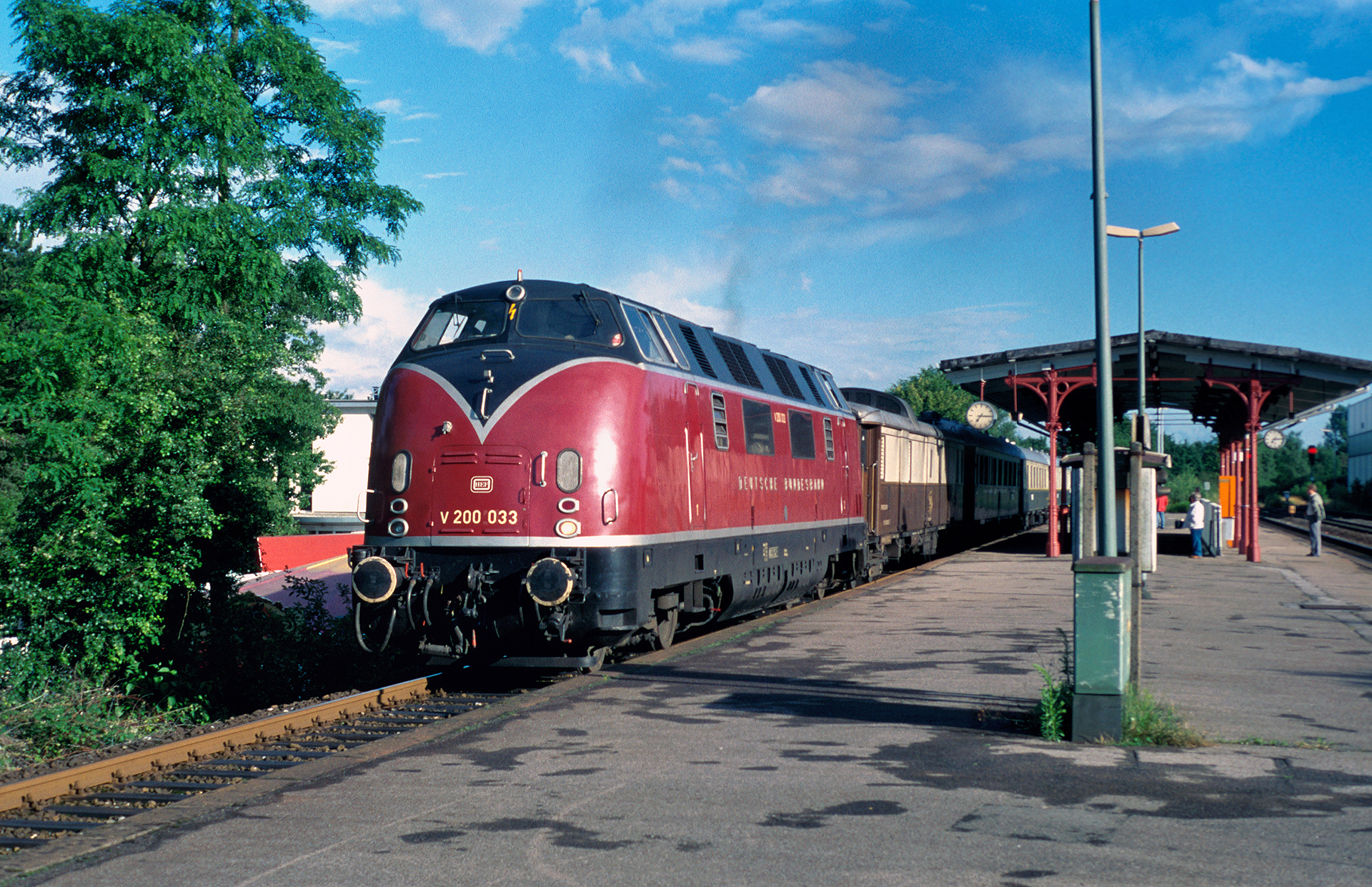 Gehen wir für die letzten beiden Bilder noch einmal zurück an den Anfang unserer Reise: Remscheid Hbf. Die folgenden zwei Bilder wollen so gar nicht zueinander passen, und doch gehören sie zusammen. Das erste der beiden Bilder zeigt erneut V200 033, diesmal jedoch wieder als Schublok mit dem Orient-Express im Bahnhof auf Gleis 2.