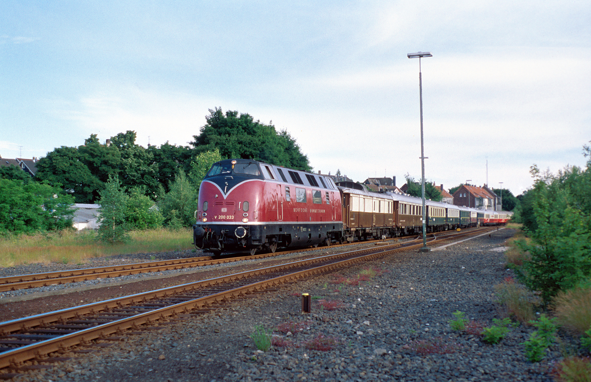 Das die 01 einmal am einen und einmal am anderen Ende hing, liegt daran, dass der Zug seinerzeit in Düsseldorf übernachtet hat. Bei der letzten Fahrt am Tag eins fuhr der Zug Abends nochmal von Düsseldorf Hbf aus seine letzte Runde Richtung Neuss und Köln nur mit der V200 007. Grund dafür war meines Wissens, dass die Wasser Vorräte der Lok für den letzten Schlenker nicht mehr ausreichend waren, weshalb die Lok schon früher vom Zug ging. Da der Zug dann aus Köln über Leverkusen nach benrath fuhr, war der Wagenpark umgedreht als die 01 am nächsten Morgen wieder vorgespannt wurde.