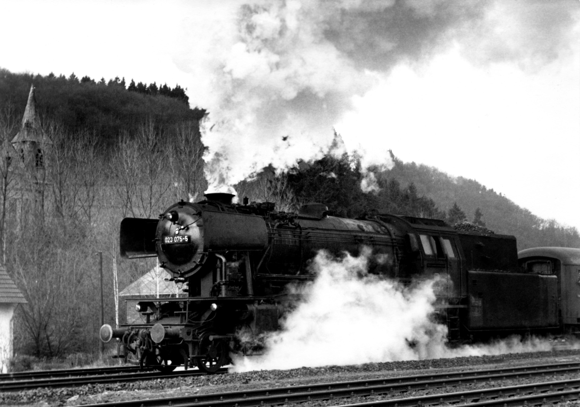 Die Ausfahrt aus Jünkerath konnte ebenfalls festgehalten werden, da man ausreichend Zeit hatte den Zug beim nächsten Fotostandort zu erwischen. Links im Bild erhebt sich wieder die Pfarrkirche St. Antonius Jünkeraths und 23 075 fährt mit Volldampf Richtung Gerolstein aus Jünkerath aus.