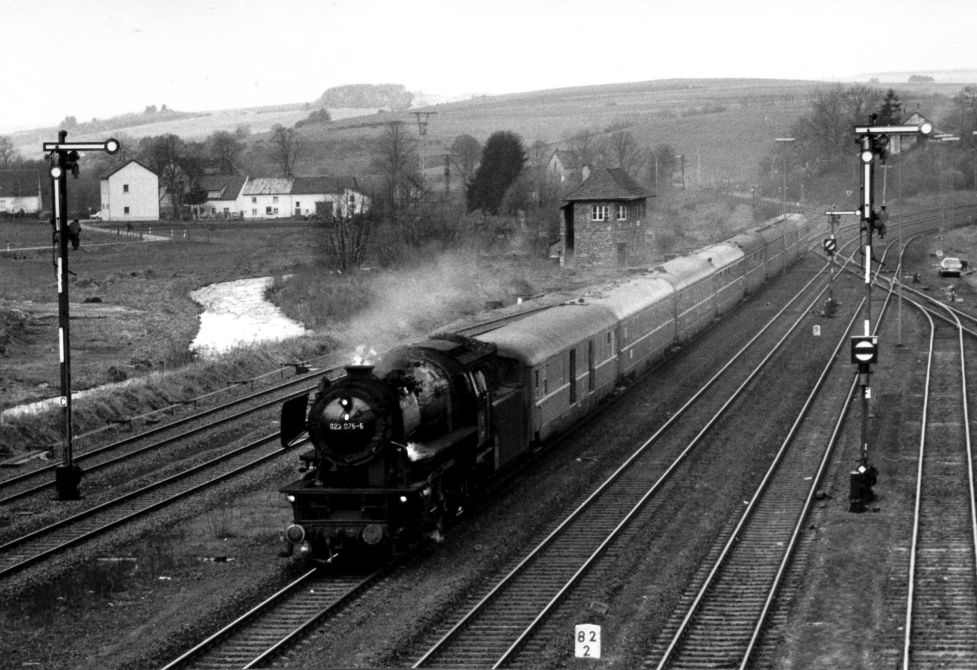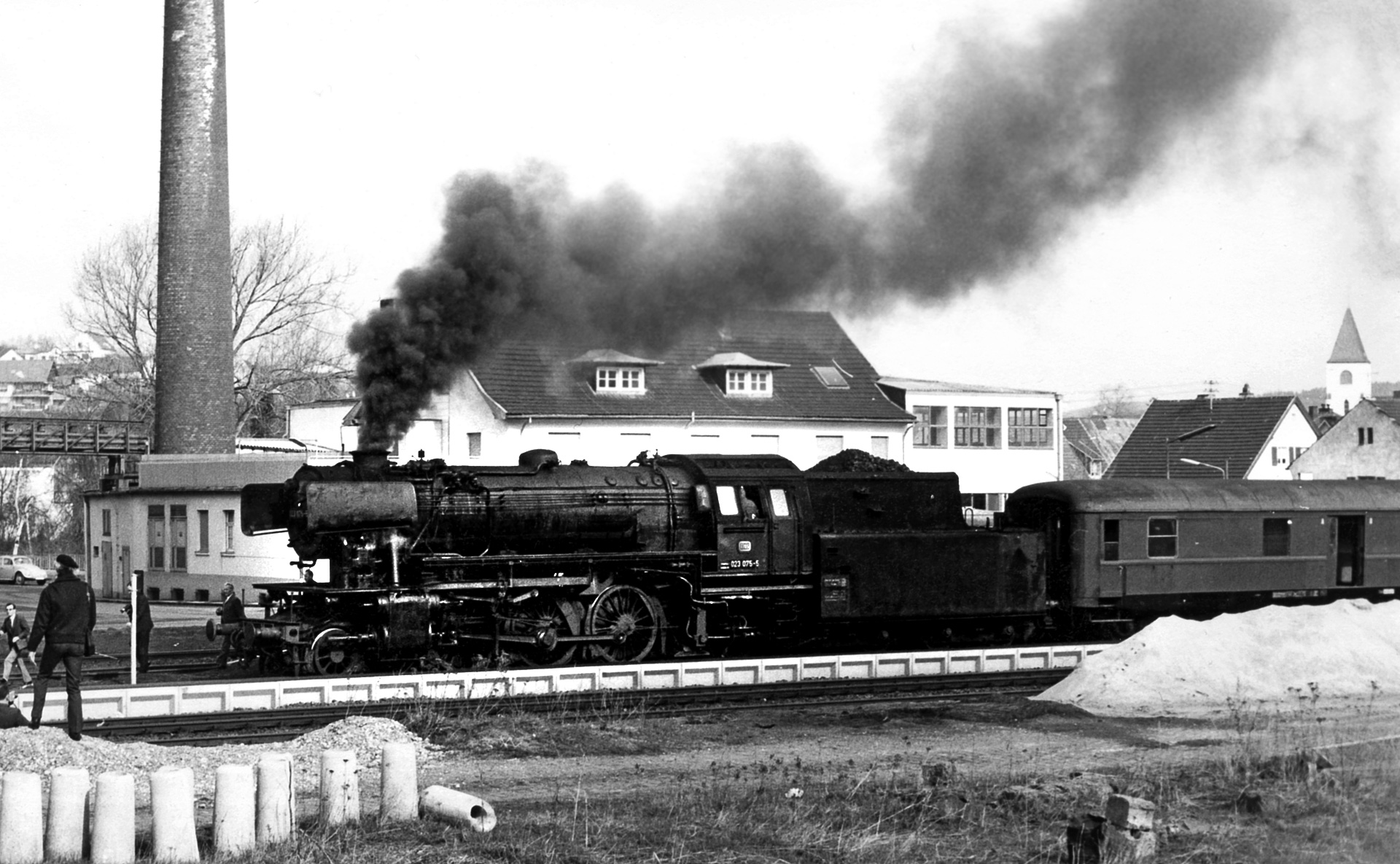 Widmen wir uns aber nun wieder dem Sonderzug des Freundeskreises Eisenbahn Köln e.V. Während des Aufenthalts in Jünkerath entstand diese Aufnahme vom Sonderzug im Bahnhof. Im Hintergrund erhebt sich die Katholische Pfarrkirche St. Antonius von Padua, im Vordergrund dampft und rußt 23 075 den Bahnhof ein. Neben dem Publikum sehen wir zudem einen alten Wasserkram mit bemerkenswert langem Ausleger. Für die Versorgung der Dampflok war in diesen Tagen noch gesorgt.