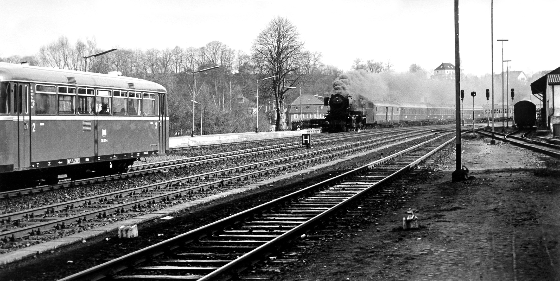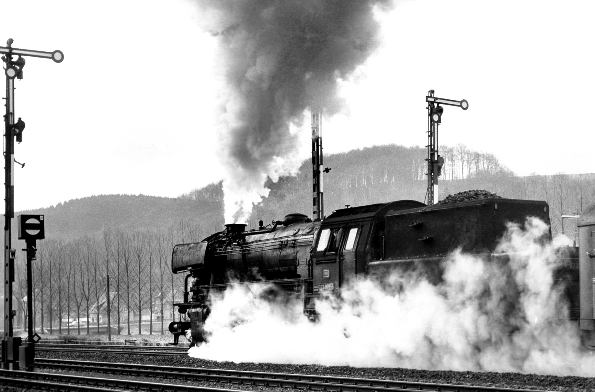 Auch hier war noch genug Zeit für einen Nachschuss der ebenfalls veröffentlichbar ist, zeigt er doch die „gute alte Dampflok“, wie sie bildlich kaum besser darstellbar wäre, oder? Der Pedant mag anmerken, dass man den Signalflügel des linken Signals gerne noch vollständig hätte ablichten können. Natürlich wäre es ein leichtes ihn mit heutiger EBV reinzumontieren, aber wollen wir mal nicht übertreiben!
