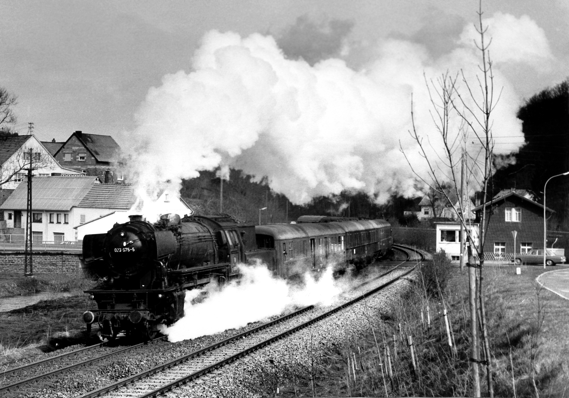 Zum Einsatz bei dieser Sonderfahrt kam die vergleichsweise junge 23 075, die natürlich unter ihrer EDV-Nummer 023 075-5 für den Gesellschaftssonderzug abgestellt wurde. 23 075 wurde 1956 mit der Seriennummer 12510 als Personenzuglokomotive beim Hersteller Arnold Jung Lokomotivfabrik der Deutschen Bundesbahn übergeben und verfügte schon ab Werk über Indusi. Jung baute mit insgesamt 51 Maschinen die meisten dieser Gattung. 1972 erhielt 23 075 zudem als letzte ihrer Art einen Umbau auf Nassdampf. Die Baureihe 23 sollte vor allem ein adäquaten Ersatz für die in die Jahre gekommene preußische P8 darstellen und konnte diesbezüglich auch durchaus überzeugen, da sowohl Leistung als auch der Energieverbrauch gegenüber der P8 deutlich verbessert werden konnte. In den Baujahren von 1950-1959 entstanden so insgesamt 105 Maschinen der Baureihe 23. 23 075 überlebte den Traktionswandel nicht. Ausgemustert wurde sie im Oktober 1975 im Bw Saarbrücken. Insgesamt acht Maschinen der Baureihe sind allerdings noch erhalten, wovon fünf betriebsfähig sind.