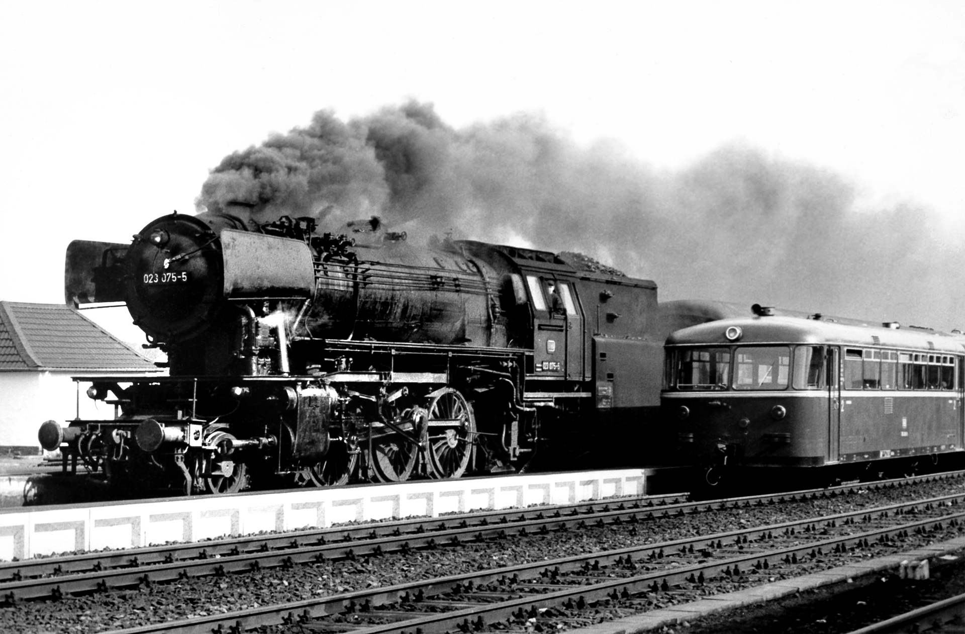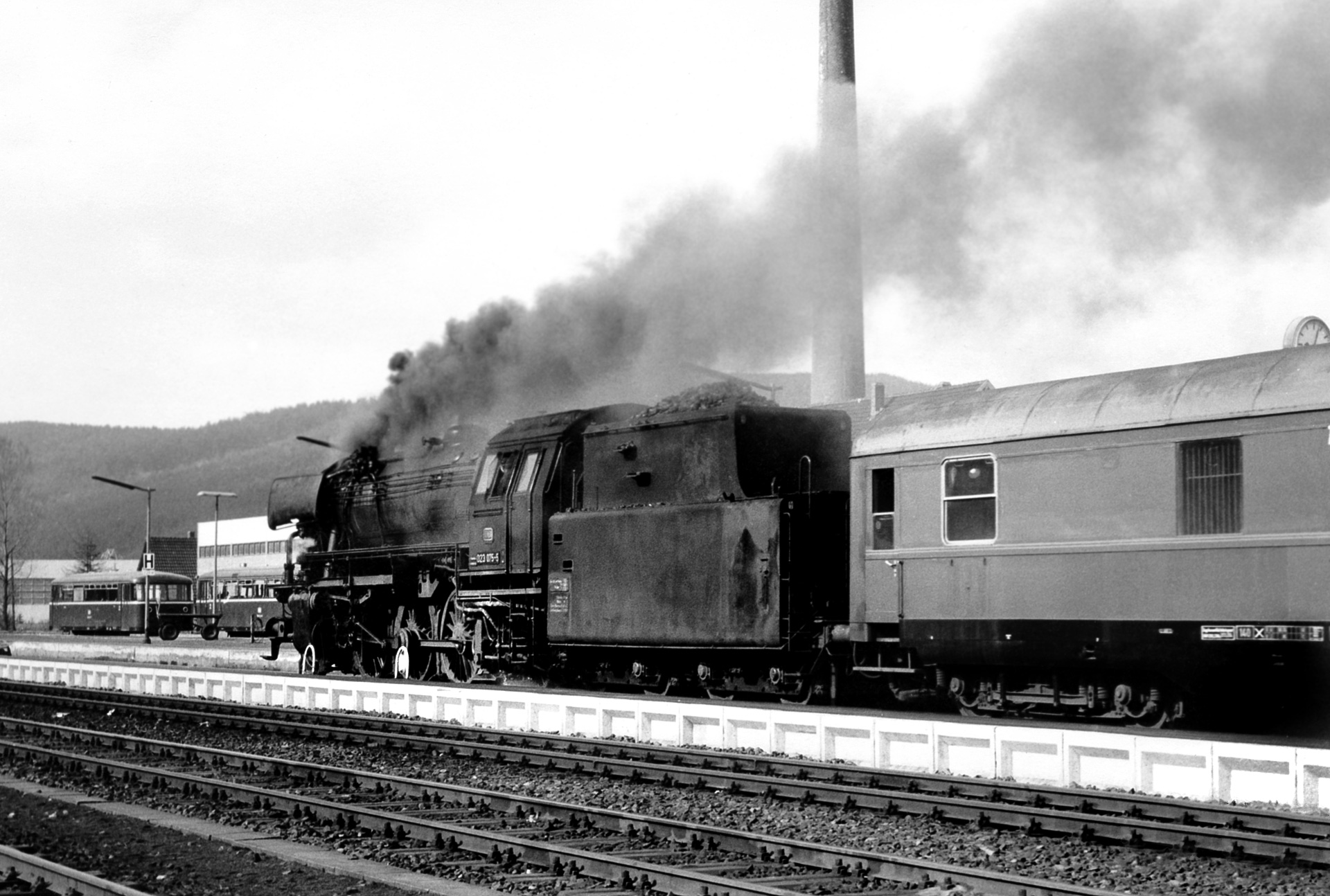 Eine weitere Aufnahme zeigt die Einfahrt, während 023 075-5 am Triebwagen vorbei in den Bahnhof Kall einfährt. Hier sieht man nun die BR 23 auch erstmals aus der Nähe.