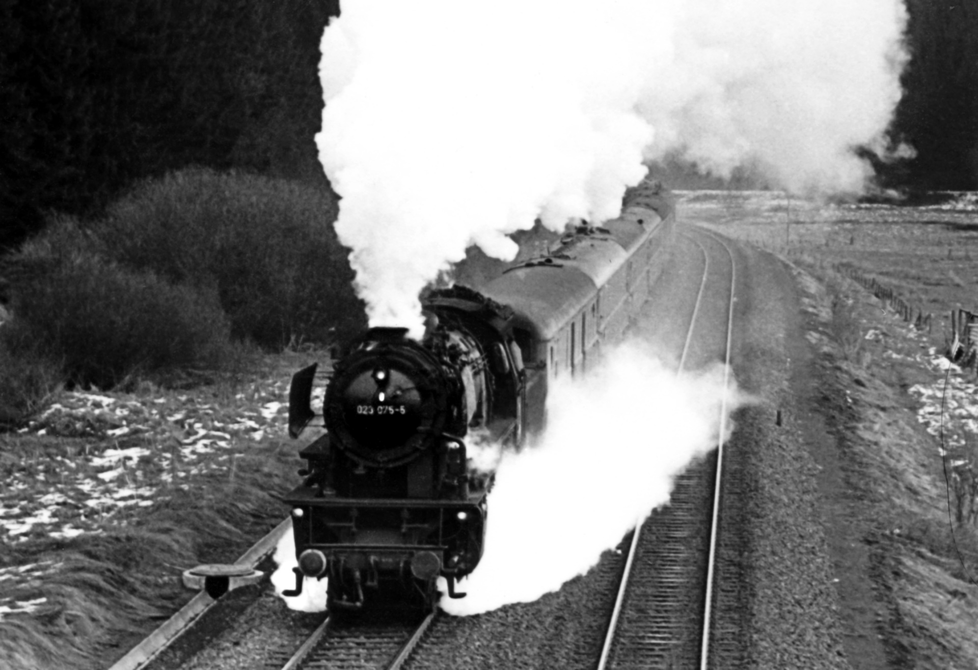 Hier ist der Name Programm. Die erste Aufnahme ist leider etwas unscharf, der Vollständigkeit halber sei diese Aufnahme aber dennoch hier veröffentlicht. Sie zeigt 23 075 gerade aus der Rechtskurve kommend Blankenheim ansteuernd. Allerdings, der Dampfausstoß sowohl über den Schornstein, wie auch über die geöffneten Zylinderventile mögen es verraten: In Blankenheim gab es keinen Halt, sondern wurde mit Volldampf Richtung Jünkerath durchfahren.