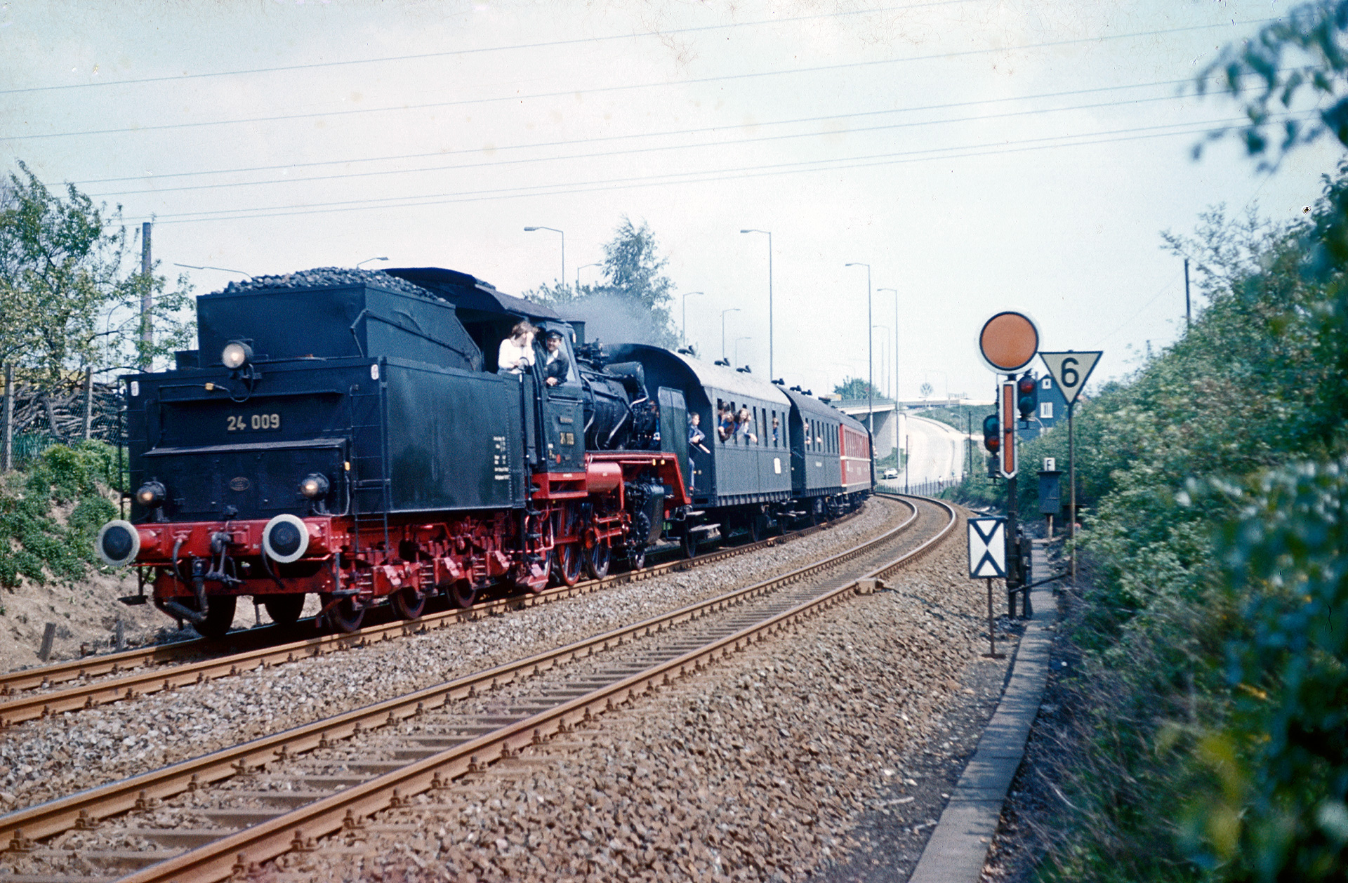 Die 24 009 war 1974 erst im zweiten Jahr in Deutschland, dennoch wurden schon etliche Sonderfahrten mit ihr veranstaltet. Alleine um den Bereich um Remscheid existieren im Archiv Bilder von mindestens 5 verschiedenen Fahrten. Wie erwähnt, wurde 24 009 durch den Eisenbahnkurier von der Reichsbahn erworben und in den Westen überführt. Ausreichender Lokalpatriotismus lässt natürlich keine Fragen darüber offen, dass die Lok zuerst einmal durch das Bergische muss. Das tat sie direkt und in Folge immer wieder!