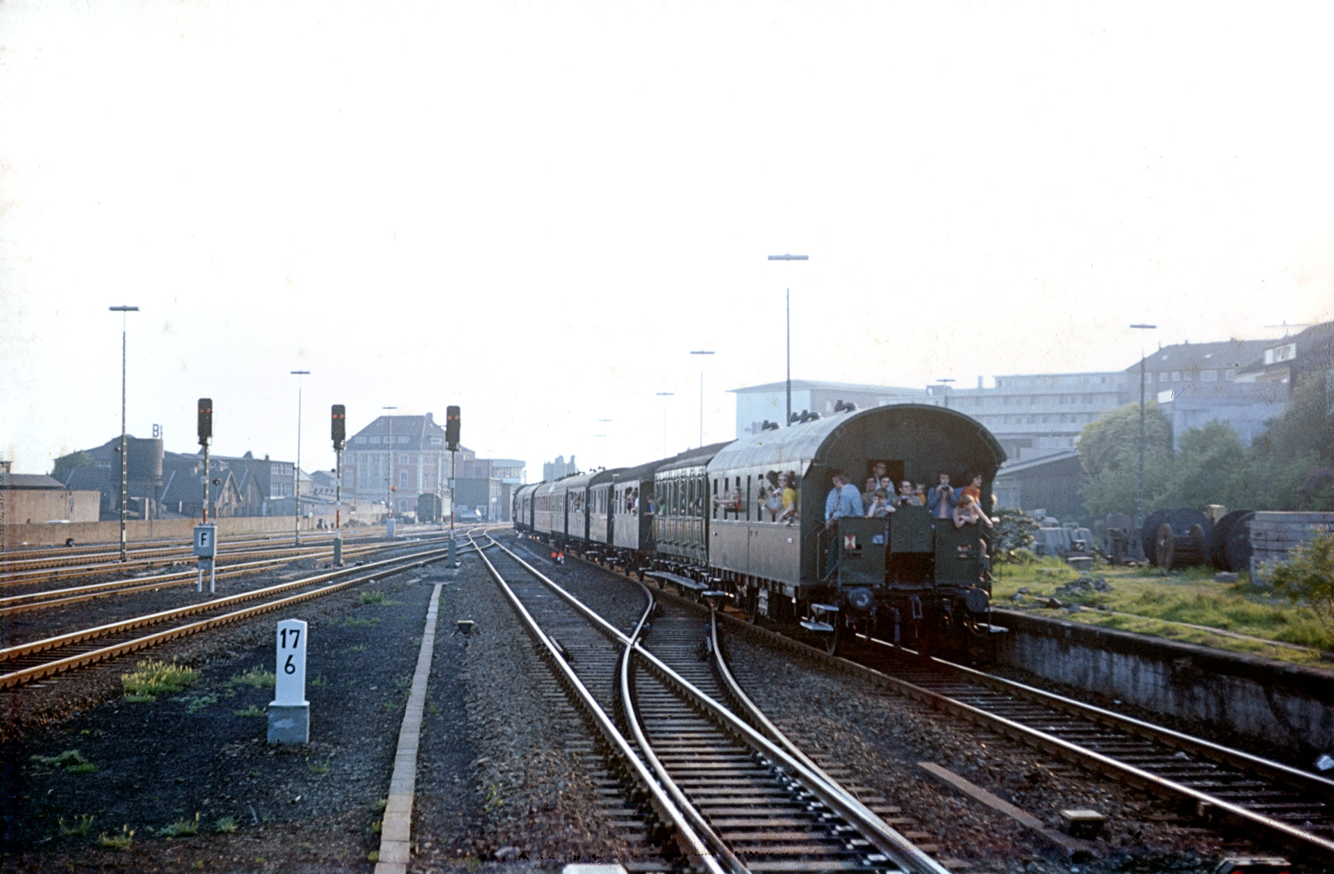 Und so verlässt der Sonderzug Remscheid Hbf. Interessant an diesem Bild ist, dass der Hauptbahnhof bereits Anfang der 70er komplett mit Lichtsignalen ausgestattet war. Auf der heimischen Modellbahnanlage waren Signale stets Formsignale. Deshalb war es mir immer eine Freude, wenn es uns z.B. einmal nach Brügge (Westf.) verschlug, wo ich auch in den 90ern oder sogar in den 2000er Jahren noch Formsignale vorfinden durfte – vom charakteristischen Reiterstellwerk mal ganz abgesehen! Doch zurück zum Bild: Links zu entdecken sind die Reste der damals noch so genannten BSI – der Bergischen Stahlindustrie. Sie ist nicht unwesentlich dafür verantwortlich, dass Remscheid trotz aller Probleme für den Zug erschlossen wurde. Gleichzeitig ist sie betrüblich dafür verantwortlich, dass wesentliche Teile der Innenstadt sowie des Hauptbahnhofs selbst in Folge von Bombenangriffen im Zweiten Weltkrieg völlig zerstört wurden. Die BSI – wenig später bereits Thyssen – lag mit Werksanschluss direkt hinter dem Hauptbahnhof.