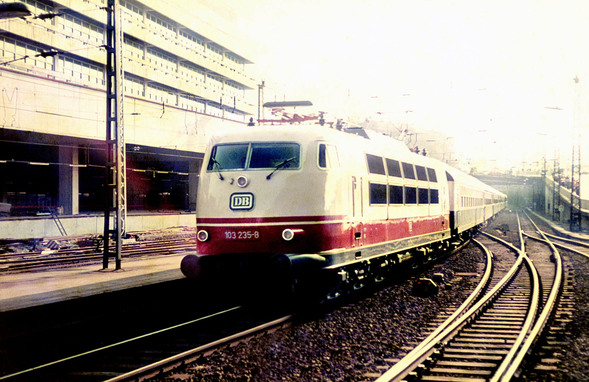Waggon 1 macht klar, dass die Ausfahrt kurz bevor gestanden haben muss. Ohnehin hatte der Zug in Wuppertal-Elberfeld nur 5 Minuten Aufenthalt. Die Mitreisenden haben die Fenster der Waggons weit geöffnet und warten auf die Ausfahrt. Mein Vater nutzte die verbliebenen Sekunden, um sich noch ein paar Meter zu entfernen. Dabei ist folgende Aufnahme entstanden, welche die Szenerie vor der Ausfahrt noch einmal im Gesamten zusammenfasst.