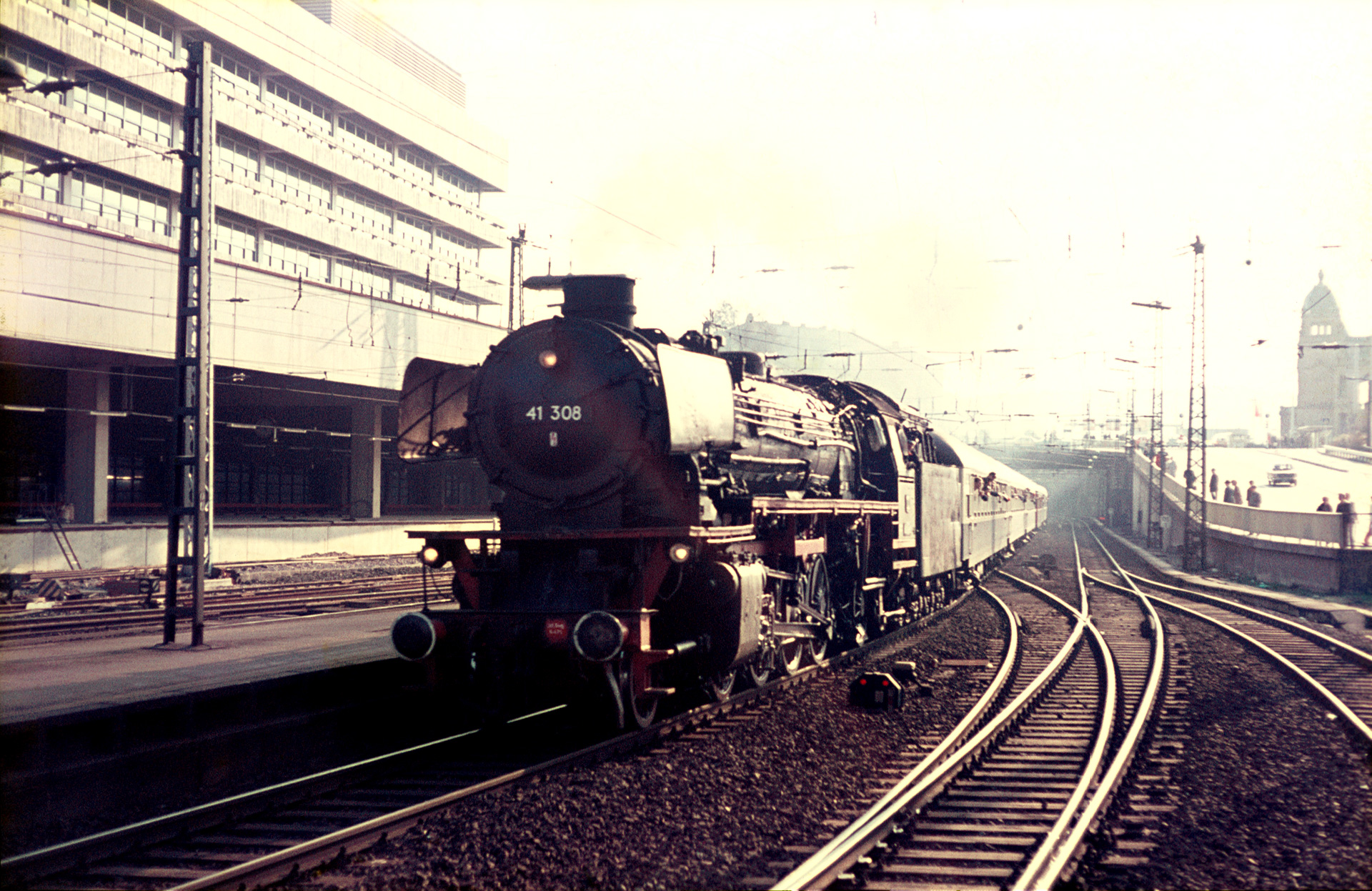 Die letzte Aufnahme ist noch einmal ein Nachschuss auf den Zug bzw. 41 308. Eigentlich ist die Aufnahme unscheinbar und ziemlich abgesoffen, die merkwürdige Dampfentwicklung rechts neben dem Schornstein der Lok macht sie aber interessant. Macht die Luftpumpe nicht was sie soll oder befindet sich eine weitere Dampflok in Parallelausfahrt auf Gleis 3? Nein, es ist wohl nur die Dampfpfeife. Eine Ausfahrt wie es sich gehört!