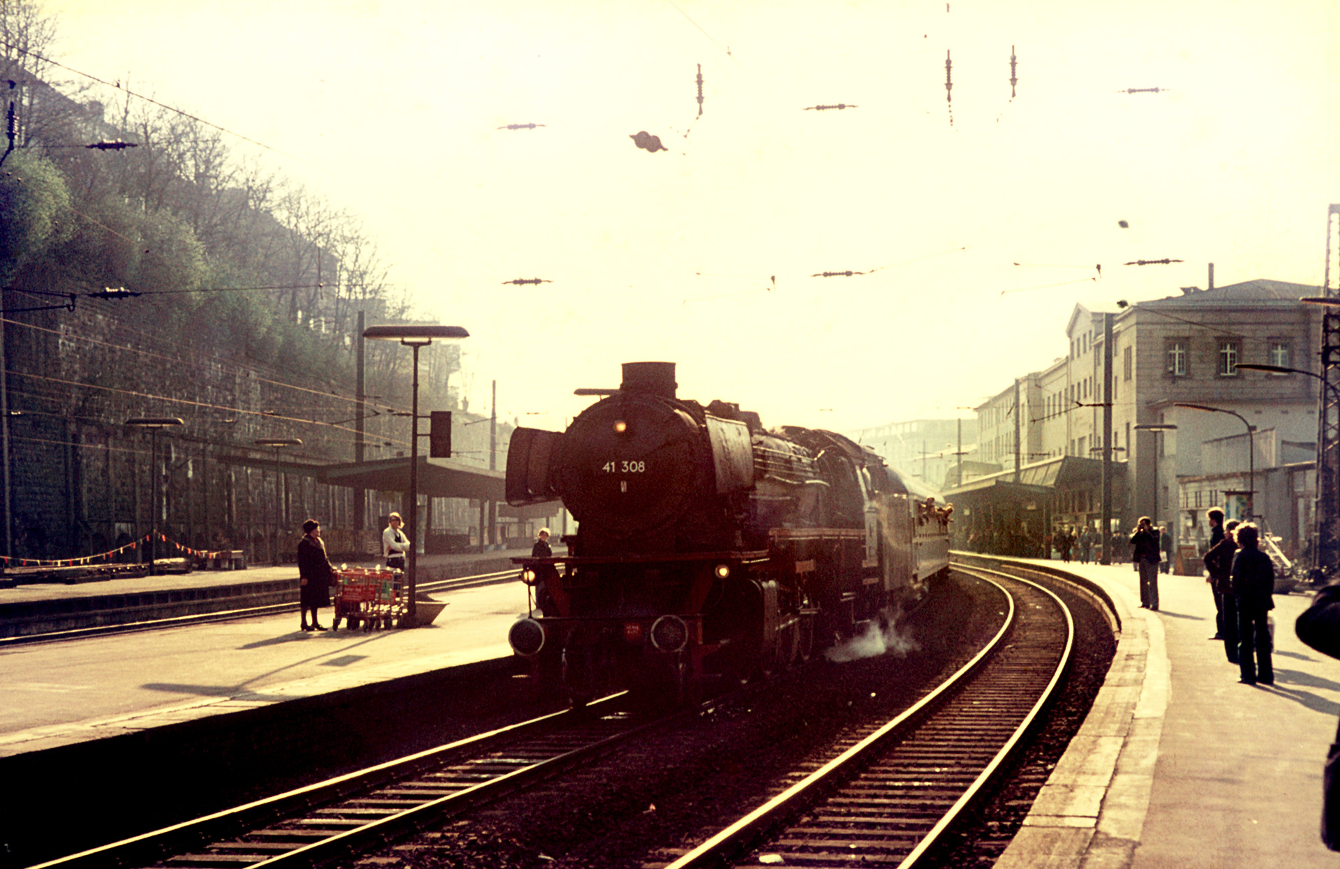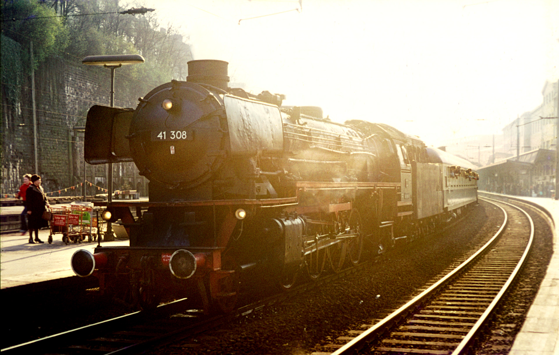 Die Sonne frisst alles auf und so ganz ohne technische Schwächen ist die Fotografie auch nicht, ohne Schäden der Lagerung leider ebenso wenig. Dennoch ist eine E03 – zumal im tiefen Gegenlicht – immer ein Motiv wert. Die folgenden Aufnahmen zeigen 41 308 vor ihrem Personen-Sonderzug im Bahnhof Elberfeld. Auf dem ersten Bild sieht man, oder kann zumindest erahnen, dass das Lokschild die Nummer 042 308-7 ausgibt, während das Schild auf der Rauchkammer 41 308 als Loknummer ausgibt. Natürlich handelt es sich um die selbe Maschine, die Lokschilder am Führerhaus waren lediglich die nach EDV-Nummernplan der DB. Hierbei ist zu beachten, dass die auf Ölhauptfeuerung umgebauten BR 41 Maschinen 1968 als Gattungsnummer 042 erhalten haben. Die anderen behielten ihre 41.