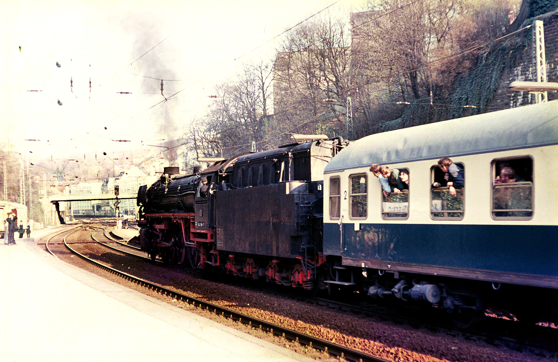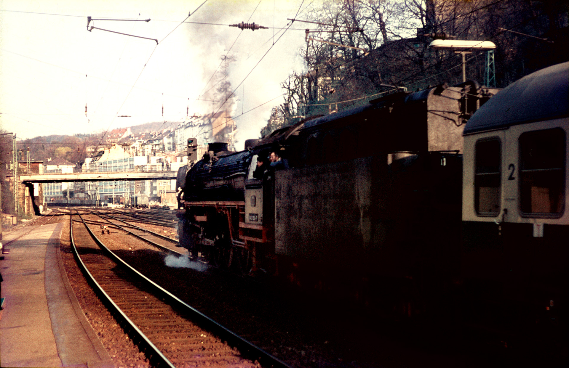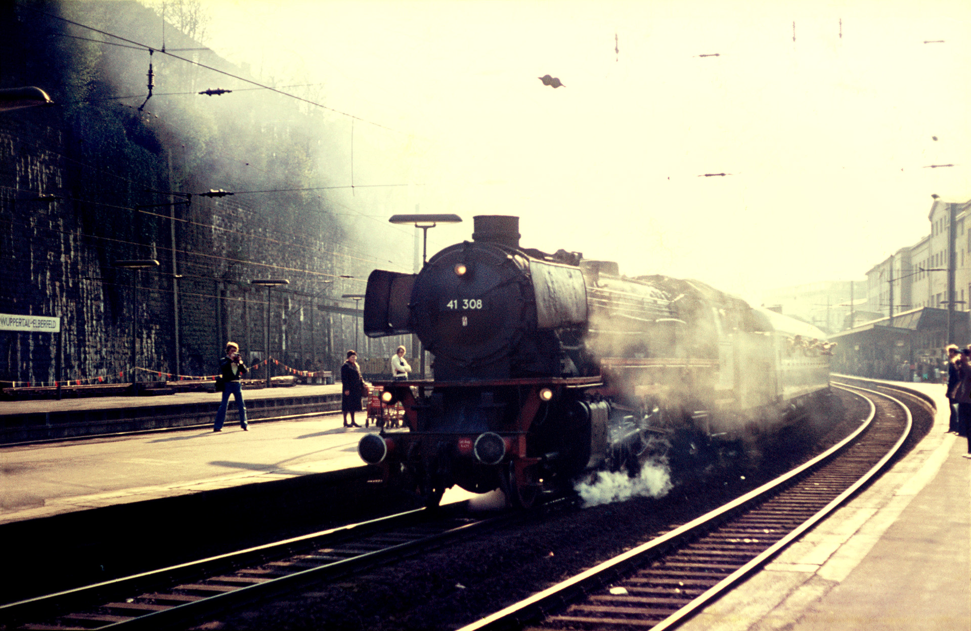 Der 11.04.1976 zeigte sich von seiner schönsten Seite. Während des ganzen Tages schien die Sonne vor strahlend blauem Himmel. In den Nachmittagsstunden, als der Sonderzug Wuppertal erreicht, steht die Sonne bereits recht tief und sorgt gleichermaßen für schwierige wie stimmungsvolle Lichtverhältnisse am Bahnhof. Dem Eingangsbild geht folgendes Bild als Beifang voraus: